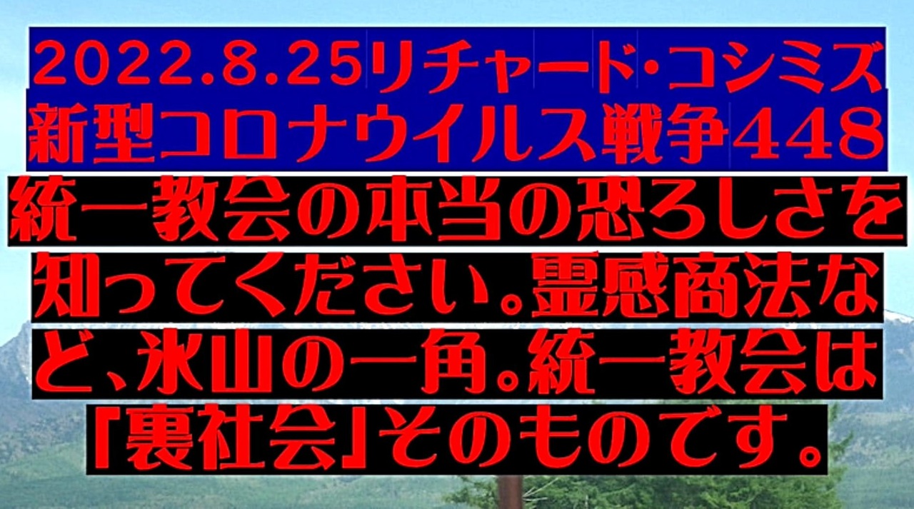 <span style="color: #cc4125;"><strong>「 テーマ:新型コロナウイルス戦争 448 」</strong></span><br><br><span style="color: #ff0000;"><strong>「『 統一教会の本当の恐ろしさ 』を知って下さい。『 霊感商法 』など、氷山の一角。<br> 『 統一教会 』は、『 裏社会 』そのものです 」</strong></span><br><br>◐ワクチン大虐殺の「主役」を任せるつもりだった岸田文雄が、統一邪教問題で支持率、急落。<br> ビル・ゲイツもエマニュエル米大使も創価女も、顔色悪し。<br><br>◐「岸田文雄」自身が、「統一教会まみれ」だったと発覚。側近が、統一邪教幹部。<br><br>◐統一邪教は、「過去の関係をばらす」とマスコミを恫喝。どこから、そんな「傲慢な姿勢」が出るのか?<br> 過去に、日本を支配してきた「自信」が、カルトを増長させている。<br> 「統一教会の背後の世界権力」をちらつかせる。<br><br>◐自民党議員は、統一邪教の送り込んだ秘書に秘密を握られている(秘書給与着服など)。<br> だから、「統一教会とは断絶」出来ない。自民党は永遠に浄化不能。日本政権から追い出せ。<br> 野党も統一教会汚染を免れず。「統一教会との完全断絶」を宣言せよ。<br><br><strong>*「フォロー」・「ニコニ広告」・「いいね!」・「情報拡散」等、ご協力下さい。 リチャード・コシミズ</strong><br><br><span style="color: #38761d;">◆</span><span style="color: #38761d;"><strong>リチャード・コシミズ 公式 ブログ</strong></span><br> <a href="https://ameblo.jp/ineversurrender/" target="_blank" rel="noopener nofollow">https://ameblo.jp/ineversurrender/</a><br><br><span style="color: #38761d;">◆</span><span style="color: #38761d;"><strong>リチャード・コシミズ 公式 ホームページ<br> </strong></span><a href="http://richardkoshimizu.boo.jp/" target="_blank" rel="noopener nofollow">http://richardkoshimizu.boo.jp/</a><br><br><span style="color: #38761d;">◆</span><span style="color: #38761d;"><strong>リチャード・コシミズ 講演会 公式 動画ギャラリー</strong></span><br> <a href="http://www.t-sskk.com/richardkoshimizu/video-gallery/index.html" target="_blank" rel="noopener nofollow">http://www.t-sskk.com/richardkoshimizu/video-gallery/index.html</a><br>