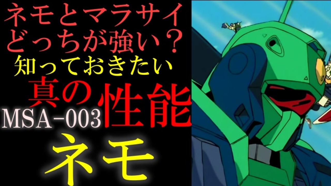 【地味だけど高性能】MSA-003、ネモ。実は非常に高性能なネモをマラサイと性能比較しながら徹底解説【機動戦士ガンダム】<br><br>Zガンダムに登場する、MSA-003ネモを、同時期に作られたマラサイと比較しながら本当の出自などを解説、考察する動画です。<br>今回は考察が多めです。<br><br>出典元が無い情報は怖い・・・。<br>シロッコが実は試験管ベビーという設定の出典探してるけどどこなんだろう。<br>小説には無いような・・・見落としてるのかもしれない。<br>MSバイブルには採用されているみたいだけど。<br><br>質問、などありましたらこちらにも<br><a href="https://twitter.com/@i4S0LHspdgzBTor" target="_blank" rel="noopener nofollow">https://twitter.com/@i4S0LHspdgzBTor</a><br><br>清見元康名義でたいあっぷ、小説家になろう、カクヨムなどに投稿しています。<br>もし良ければ応援お願いしますm(_ _)m<br><a href="https://tieupnovels.com/user/GariGari" target="_blank" rel="noopener nofollow">https://tieupnovels.com/user/GariGari</a><br><a href="https://mypage.syosetu.com/953815/" target="_blank" rel="noopener nofollow">https://mypage.syosetu.com/953815/</a><br><a href="https://kakuyomu.jp/users/GariD/works" target="_blank" rel="noopener nofollow">https://kakuyomu.jp/users/GariD/works</a><br><br>現在の最新作(短編):<br>何度繰り返してもギロチン送りにされる悪役令嬢は閃いた『敵対する者全員可愛いアイドルにしてしまおう!』アイドルギルドマスターに私はなる!<br><a href="https://ncode.syosetu.com/n2478hi/" target="_blank" rel="noopener nofollow">https://ncode.syosetu.com/n2478hi/</a><br><br>A.I.VOICE:結月ゆかり<br>VOICEVOX:ずんだもん<br><br>いつも広告、コメントありがとうございます。<br>励みになりますm(_ _)m<br>