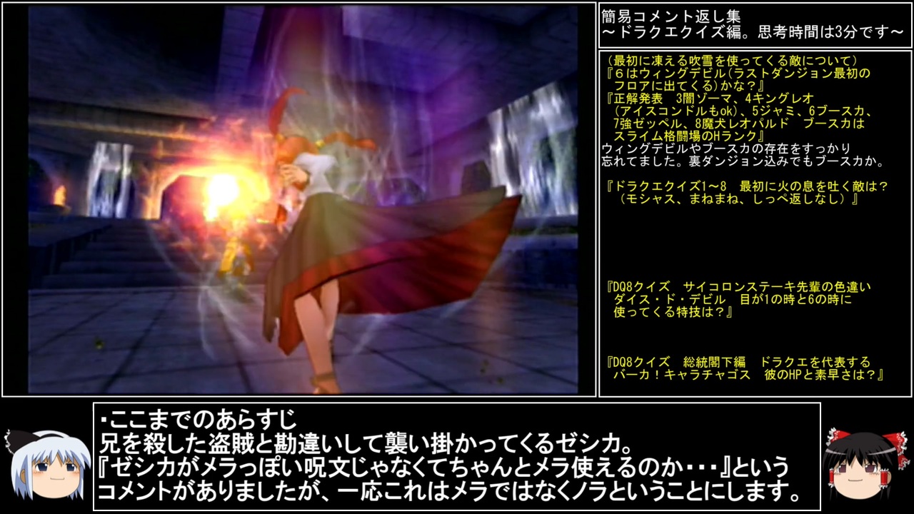 ゼシカの捲れ上がるスカートに「見え……」ってなったのは自分だけじゃない筈。<br>そして直線が多そうなフィールドは4倍速編集でも問題ないけど、ダンジョンは4倍速編集で大丈夫か不安だったり。そして次回はフィールドを駆け巡るので8倍速編集にしたいところ。<br>この辺りは手探りであり万人の望みを叶えるのは難しそうですが、可能な限り多くの方が見やすい動画にしたいと思います。<br><br>前→<a href="https://www.nicovideo.jp/watch/sm40947164" class="watch">sm40947164</a> 次→<a href="https://www.nicovideo.jp/watch/sm41020239" class="watch">sm41020239</a><br><br>YouTube版→<a href="https://youtu.be/0pmf0f3d2rw" target="_blank" rel="noopener nofollow">https://youtu.be/0pmf0f3d2rw</a><br><br><br>※動画の大きさが変わる方は、お手数ですが設定→画質を自動から〇pに変えると解決します。<br>※一部機種は互換機を使用してのプレイとなります。<br><br>縛りルール(不明点はシリーズのQ&Aを参照)<br>①使った武器・防具・装飾品・道具・呪文・特技・一部特殊施設(メダル王・カジノ・移民の町)・職業(3,6,7)・仲間モンスター(4,5,6,8+7の職業)は次以降のシリーズで使用禁止。<br>(NPCキャラが使用した装備や呪文を含む。売却及び錬金素材としても使用扱い)<br><br>②裏技・バグ技の禁止。<br><br>③逃走禁止&戦闘終了時は全員生存。<br><br>④レベルを上げ過ぎない。<br>ダンジョンやボスは公式ガイドブックに記載されたレベル+3まで。<br>ラスボスは全ての呪文を習得するレベル+3程度までに収める。<br><br>⑤裏ボスも規定回数、規定ターン以内に倒す。<br>(6の裏ダンジョン突入時のみ、条件を満たすため①の職業を解禁)<br><br>(おまけ)<br>宝は可能なものに限り全回収。<br>5と6は同一モンスターの仲間不可。<br>回避可能なボスも全て倒す。<br><br><br>この動画で利用している株式会社スクウェア・エニックスを代表とする共同著作者が権利を所有する著作物及びスギヤマ工房有限会社が権利を所有する楽曲の転載・配布は禁止いたします。<br>(C) ARMOR PROJECT/BIRD STUDIO/SQUARE ENIX All Rights Reserved.<br>(C) SUGIYAMA KOBO (P) SUGIYAMA KOBO<br><br>AquesTalk2ライセンスID:AQTK2WINUSR23122185<br /><br><br>❤いいねを押していただけるとモチベーションと投稿速度が上がるので宜しくお願い致します!<br><br>作者ツイッター→ <a href="https://twitter.com/nig0117" target="_blank" rel="noopener nofollow">https://twitter.com/nig0117</a><br>PIXIV FANBOX→ <a href="https://sutanokeiji.fanbox.cc/" target="_blank" rel="noopener nofollow">https://sutanokeiji.fanbox.cc/</a><br><br>( 以前はWEB小説書いてました→ <a href="https://kakuyomu.jp/works/1177354054884910267" target="_blank" rel="noopener nofollow">https://kakuyomu.jp/works/1177354054884910267</a> )