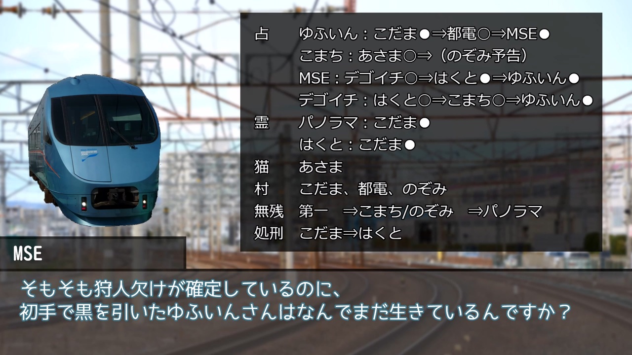 トランスフォーマーは未履修ですが、マスターピースのトレインボットはそこそこ欲しいです。<br>そして、シンカリオンは、いいぞ…<br><br>11C猫FO:村1/占2/霊1/狩1/猫1/狼3/狂1/狐1<br><br>Twitterで考察して頂ける方は#電車で人狼 を入れて呟いていただけると探しやすいです。<br>3日目⇒<a href="https://www.nicovideo.jp/watch/sm40953726" class="watch">sm40953726</a> 反省会⇒<a href="https://www.nicovideo.jp/watch/sm41012183" class="watch">sm41012183</a><br><br>電車で人狼!マイリスト <a href="https://www.nicovideo.jp/mylist/72946958" target="_blank" rel="noopener">mylist/72946958</a><br>電車で人狼! 支線編(解説動画) <a href="https://www.nicovideo.jp/mylist/79077747" target="_blank" rel="noopener">mylist/79077747</a><br>人狼動物園マイリスト <a href="https://www.nicovideo.jp/mylist/72986089" target="_blank" rel="noopener">mylist/72986089</a>