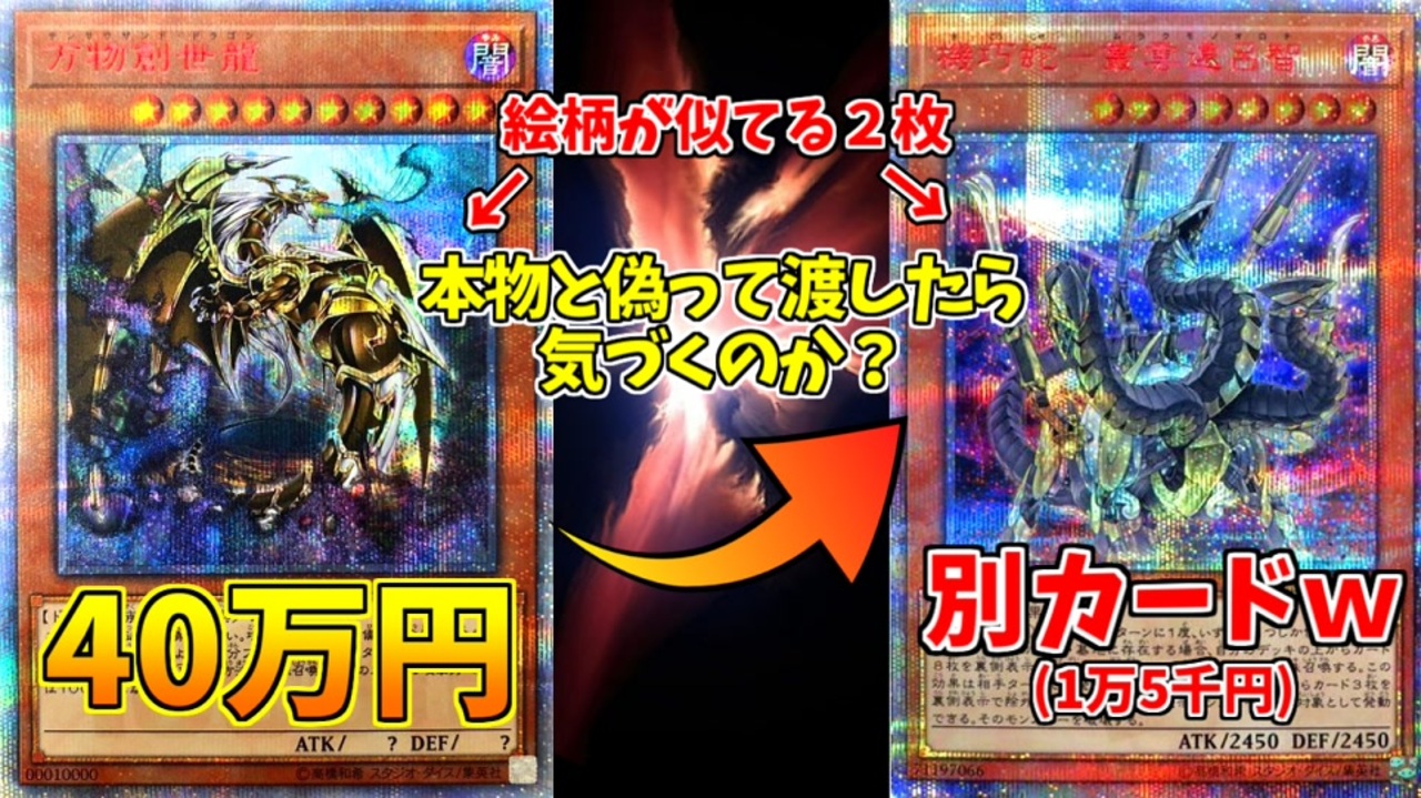 通販サイトで「えっ!?万物創世龍安すぎぃ!!」って思ってよく見たら、絵柄の似ているムラクモノオロチの20thだったという愛の戦士の実体験から生まれた検証企画です。<br><br>前回→<a href="https://www.nicovideo.jp/watch/sm40885454" class="watch">sm40885454</a> 次回→<a href="https://www.nicovideo.jp/watch/sm41279025" class="watch">sm41279025</a><br><br>はんじょう→<a href="https://www.nicovideo.jp/mylist/52817350" target="_blank" rel="noopener">mylist/52817350</a><br>とりっぴぃ→<a href="https://www.nicovideo.jp/mylist/46706915" target="_blank" rel="noopener">mylist/46706915</a><br><br>【遊戯王マイリスト】<a href="https://www.nicovideo.jp/mylist/56083089" target="_blank" rel="noopener">mylist/56083089</a><br><span style="color: #000000;">【チャンネル】</span><span style="color: #006699; font-size: 14px;"><a href="https://ch.nicovideo.jp/ainosensi" target="_blank" rel="noopener">ch.nicovideo.jp/ainosensi</a></span><br><span style="color: #000000; font-size: 14px;">【その他投稿作品】</span><span style="color: #006699; font-size: 14px;"><a href="https://www.nicovideo.jp/mylist/34427287" target="_blank" rel="noopener">mylist/34427287</a></span><span style="color: #000000; font-size: 14px;"> 【Twitter】@ainosensi2</span><br><span style="color: #14171a; font-size: 14px;">【YOUTUBE】</span><span style="color: #006699; font-size: 14px;"><a href="http://goo.gl/OMphlA" target="_blank" rel="noopener nofollow">http://goo.gl/OMphlA</a></span>