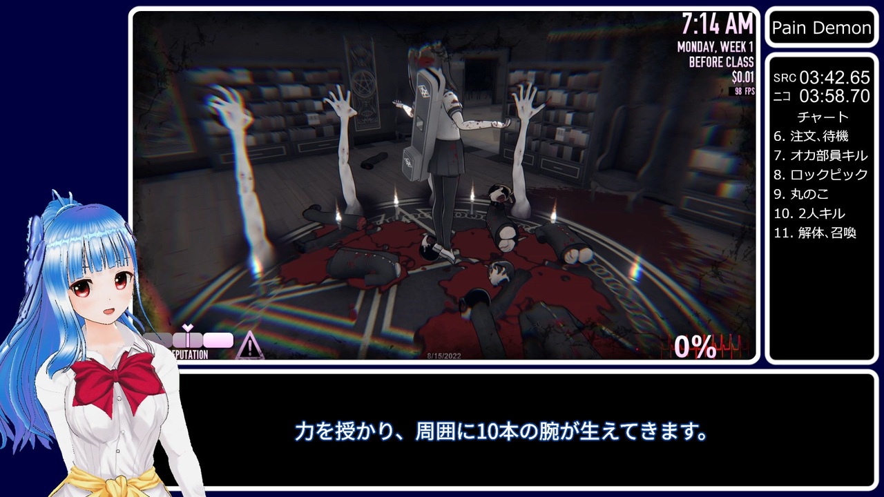 2連続悪魔召喚なので初投稿です。<br><br>本編は <a href="#" class="seekTime" data-seekTime="1:32" onclick="seekNicoPlayer('#1:32'); return false;">#1:32</a> から始まります。<br><br><strong><u>レギュレーション<br>苦痛の悪魔を召喚し、ジェノサイドエンドを達成する<br>計測区間:空ファイル選択~エンディング開始まで<br>Speedrun仕様(SRC)…ロード時間は計測しない<br>ニコニコ仕様…ロード時間も計測</u></strong><br><br>Speedrun仕様のタイマー付けただけ版→<a href="https://youtu.be/yMD3XTcWPtY" target="_blank" rel="noopener nofollow">https://youtu.be/yMD3XTcWPtY</a><br><br>ドスにんどう姉貴の最新動画→<a href="https://www.nicovideo.jp/watch/sm40983980" class="watch">sm40983980</a><br><br>だち兄貴のバグ利用ジェノサイドRTA→<a href="https://www.nicovideo.jp/watch/sm40378033" class="watch">sm40378033</a><br><br><u>苦痛の悪魔召喚RTA</u><br>Speedrun仕様のタイマー付けただけ版→<a href="https://youtu.be/o1Ge6u-8zDY" target="_blank" rel="noopener nofollow">https://youtu.be/o1Ge6u-8zDY</a><br><br>先駆者様<br>閉廷兄貴→<a href="https://www.nicovideo.jp/watch/sm39372284" class="watch">sm39372284</a><br>いりゅーしん兄貴→<a href="https://www.nicovideo.jp/watch/sm39693320" class="watch">sm39693320</a><br><br><strong><u>いただいた素敵なイラスト</u></strong><br>おにおん様→<a href="https://twitter.com/0ni0Nn_BB0y/status/1559508688825892865" target="_blank" rel="noopener nofollow">https://twitter.com/0ni0Nn_BB0y/status/1559508688825892865</a><br>あおのり粉末様→<a href="https://twitter.com/blue_nori_snow/status/1563006307937837062" target="_blank" rel="noopener nofollow">https://twitter.com/blue_nori_snow/status/1563006307937837062</a><br>本当にありがとうございました!!<br><br>前→<a href="https://www.nicovideo.jp/watch/sm40917919" class="watch">sm40917919</a><br>次→<a href="https://www.nicovideo.jp/watch/sm41108397" class="watch">sm41108397</a><br>RTAマイリス→<a href="https://www.nicovideo.jp/mylist/74656323" target="_blank" rel="noopener">mylist/74656323</a><br><br><u>使用させていただいた素材・ソフト等</u><br>AviUtl<br>A.I.VOICE 琴葉葵<br>COM3D2(VAS使用)<br><br><strong>かわいい立ち絵を描いてくださったチカ兄貴→<a href="https://www.nicovideo.jp/user/116945047" target="_blank" rel="noopener">user/116945047</a></strong><br>その他お借りした素材はコンテンツツリーをご覧ください。