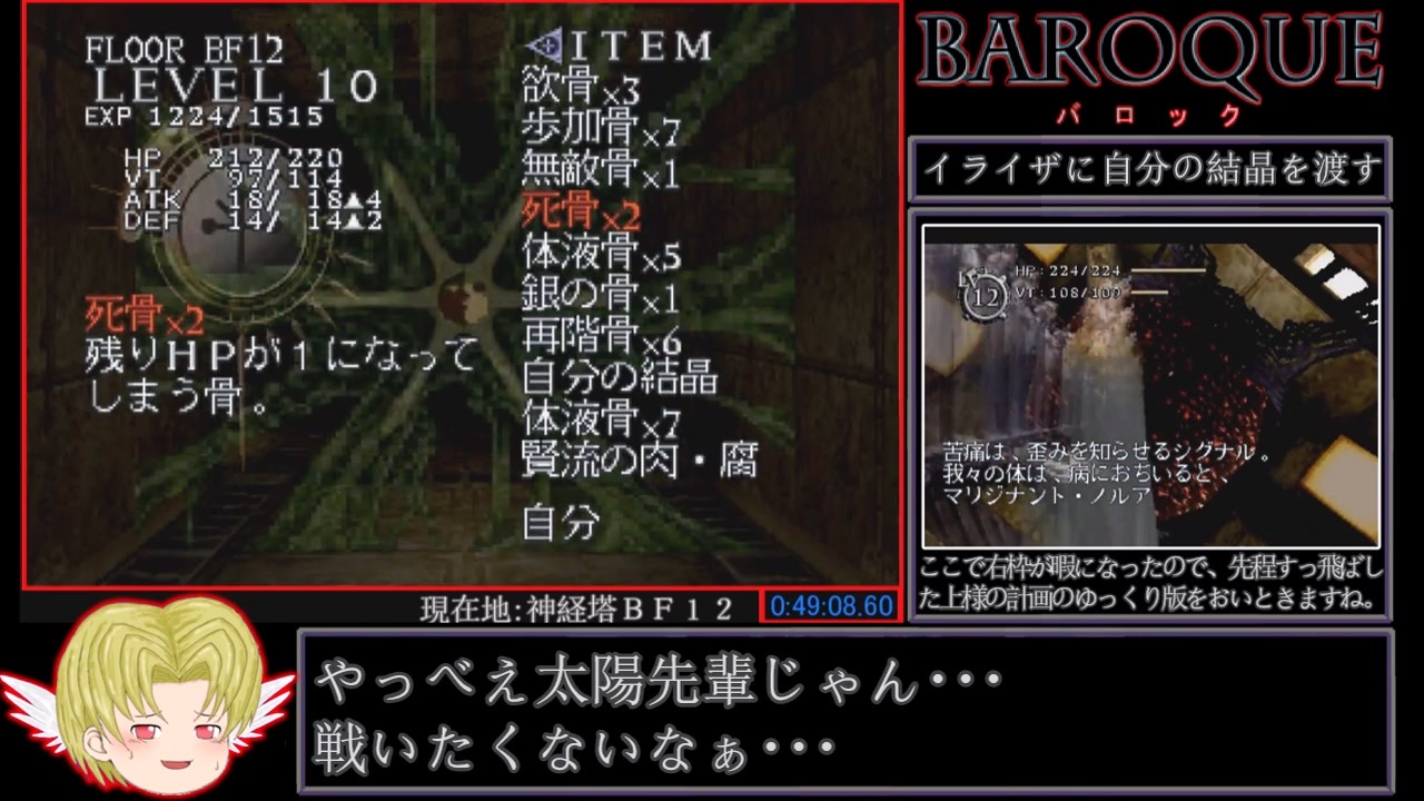 大熱波まであと10年切ったので初投稿です。またまた歪みねぇ名作、バロックのRTAのPart2です。少忙しかったので投稿が遅れてしまいましたすみません。決してサボっていた訳じゃ、ないっすよ。そうそう、9月5日まで本作のセールがやってるらしですね。興味のある方はこの機会に購入してはいかがでしょうか?(ダイマ)<br><br><span style="color: #4d5156;">レギュレーションは、エンディングを見るまでの</span>Any%で、タイトル画面でスタートを押した瞬間から、エンディングのBGMが止まった瞬間までのタイムを計測してます<span style="color: #4d5156;">。が、見返すとちょっと早かった気がしますがご容赦ください。再出力するのめんどいんです。<br>プレイ環境は、</span>Nintendo Switchでホリ クラシックコントローラー for Nintendo Switch ゼルダを使用しています。<br><br>難解な作品なので設定等の解説に力を入れたつもりですが、それでも説明は足りないかもしれませんごめんなさい。また過去動画と解説が被ってるかもしれませんが、上げたのはだいぶ前なのでま、多少はね?<br><br><追記>多数のの宣伝・再生ありがとうございます、いつもすみません。しかし次Partの完成はまだかかりそうなので、多分自分で買ってプレイした方が早く結末を知れると思います。(ダイマ)<br><br>前<a href="https://www.nicovideo.jp/watch/sm40460311" class="watch">sm40460311</a> 次<a href="https://www.nicovideo.jp/watch/sm41550609" class="watch">sm41550609</a> おまけ1 <a href="https://www.nicovideo.jp/watch/sm41003453" class="watch">sm41003453</a> おまけ2 <a href="https://www.nicovideo.jp/watch/sm41556123" class="watch">sm41556123</a> <a href="https://www.nicovideo.jp/mylist/55290772" target="_blank" rel="noopener">mylist/55290772</a><br><br><br><br>