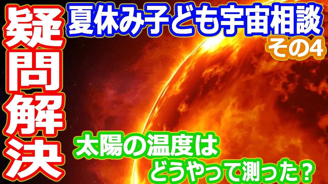 今年もやります子ども宇宙相談<br>先月から募集していた宇宙の疑問に答えていきます<br>太陽の温度は、どうやって測ったの?<br>国際宇宙ステーションを、人間の力で押して動かすことはできる?<br>国際宇宙ステーションで犯罪行為が行われると、どこの国の法律で裁かれる?<br>以上の4本をお送りします<br><br>【NEXTSWAN投稿記事】<br>宇宙で炭酸飲料が飲まれないワケ<br><a href="https://nextswan.com/p/dd18e336-c867-489c-ac6d-964d07be2cda" target="_blank" rel="noopener nofollow">https://nextswan.com/p/dd18e336-c867-489c-ac6d-964d07be2cda</a><br>旧ソ連の宇宙ステーションミールで起きた火災事故の真相<br><a href="https://nextswan.com/p/e2b4667d-97ff-4449-81c4-e4b204348300" target="_blank" rel="noopener nofollow">https://nextswan.com/p/e2b4667d-97ff-4449-81c4-e4b204348300</a><br><br>【欲しいものリスト】<br><a href="https://www.amazon.jp/hz/wishlist/ls/30HG3KS6HM6G?ref_=wl_share" target="_blank" rel="noopener nofollow">https://www.amazon.jp/hz/wishlist/ls/30HG3KS6HM6G?ref_=wl_share</a><br>【いちおし宇宙系】<br>・アマゾンリンク<br><a href="https://amzn.to/2S8xjpH" target="_blank" rel="noopener nofollow">https://amzn.to/2S8xjpH</a><br>・こども実験教室宇宙を飛ぶスゴイ技術<br>kindle版<br><a href="https://amzn.to/3qLSZ9j" target="_blank" rel="noopener nofollow">https://amzn.to/3qLSZ9j</a><br>書籍版<br><a href="https://amzn.to/3NtSavw" target="_blank" rel="noopener nofollow">https://amzn.to/3NtSavw</a><br>・宇宙兄弟(39)<br>kindle版<br><a href="https://amzn.to/3NvA0JL" target="_blank" rel="noopener nofollow">https://amzn.to/3NvA0JL</a><br>書籍版<br><a href="https://amzn.to/3iLSbg7" target="_blank" rel="noopener nofollow">https://amzn.to/3iLSbg7</a><br>・眠れなくなるほど面白い 図解 宇宙の話 <br>kindle版<br><a href="https://amzn.to/3ISW7Gq" target="_blank" rel="noopener nofollow">https://amzn.to/3ISW7Gq</a><br>書籍版<br><a href="https://amzn.to/3NzPzQT" target="_blank" rel="noopener nofollow">https://amzn.to/3NzPzQT</a><br><br>公平性や中立性を考えてアフィリエイトリンクは控えていましたが、得た収益を次のレビュー書籍や機材代にするために始めました<br>よろしくお願いします<br><br>へえ~と思ったらチャンネル登録と高評価をお願います<br>ツイッターでは、たまに宇宙ネタをつぶやいています<br><br>◆チャンネル登録はこちら<br><a href="http://www.youtube.com/channel/UChOv-TZWg3X4MDjFUF8CfQg?sub_confirmation=1" target="_blank" rel="noopener nofollow">http://www.youtube.com/channel/UChOv-TZWg3X4MDjFUF8CfQg?sub_confirmation=1</a><br>◆サブチャンネル<br><a href="http://www.youtube.com/channel/UCpQEOLtOpmXUwslvgi93yQw?sub_confirmation=1" target="_blank" rel="noopener nofollow">http://www.youtube.com/channel/UCpQEOLtOpmXUwslvgi93yQw?sub_confirmation=1</a><br>◆twitterはこちら<br><a href="https://twitter.com/skysanpei" target="_blank" rel="noopener nofollow">https://twitter.com/skysanpei</a>