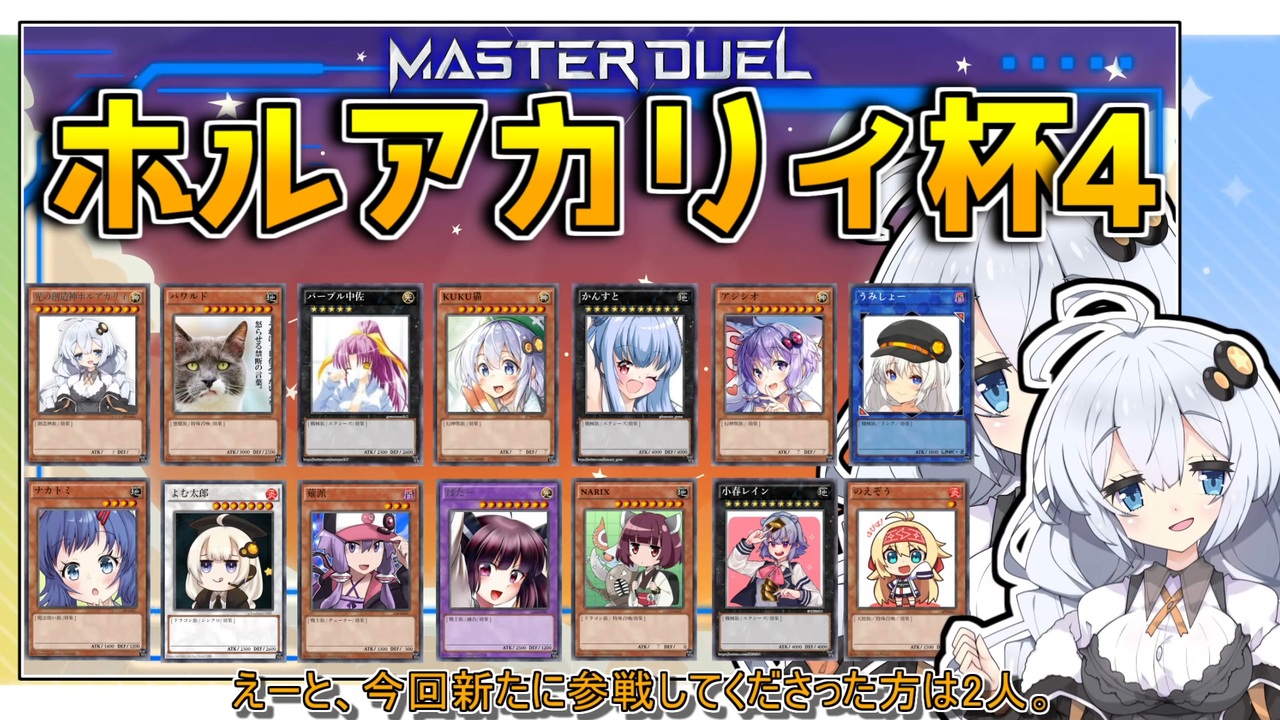 ー現代遊戯王が体感できる神ゲー「遊戯王マスターデュエル」の実況動画ー<br>☆三幻神を束ねることで召喚できる「光の創造神ホルアクティ」を求め続ける紲星あかりがマスターデュエルにもやってきた!!!<br><br>☆総勢14名のボイロ関係者がしのぎを削るトーナメント形式の大会!!<br>大会名は私が適当に提案したら採用されちゃったのだ(*'▽')<br><br>☆参加者(敬称略)<br>・四輝:<a href="https://twitter.com/shiki_yokosuka" target="_blank" rel="noopener nofollow">https://twitter.com/shiki_yokosuka</a><br>・KUKU猫:<a href="https://twitter.com/96cat0909" target="_blank" rel="noopener nofollow">https://twitter.com/96cat0909</a><br>・小春レイン:<a href="https://twitter.com/El8Mb5" target="_blank" rel="noopener nofollow">https://twitter.com/El8Mb5</a><br>・ぱたー:<a href="https://twitter.com/paterDM" target="_blank" rel="noopener nofollow">https://twitter.com/paterDM</a><br>・パープル中佐:<a href="https://twitter.com/motoyasiki2" target="_blank" rel="noopener nofollow">https://twitter.com/motoyasiki2</a><br>・薙派:<a href="https://twitter.com/arutana" target="_blank" rel="noopener nofollow">https://twitter.com/arutana</a><br>・よむ太郎:<a href="https://twitter.com/Sacchaso11000" target="_blank" rel="noopener nofollow">https://twitter.com/Sacchaso11000</a><br>・narix:<a href="https://twitter.com/narixnarix" target="_blank" rel="noopener nofollow">https://twitter.com/narixnarix</a><br>・かんすと:<a href="https://twitter.com/kansuto_game" target="_blank" rel="noopener nofollow">https://twitter.com/kansuto_game</a><br>・ナカトミ:<a href="https://twitter.com/voiro_nakatomi" target="_blank" rel="noopener nofollow">https://twitter.com/voiro_nakatomi</a><br>・パワルド:<a href="https://twitter.com/powerd5humohumo" target="_blank" rel="noopener nofollow">https://twitter.com/powerd5humohumo</a><br>・アジシオ:<a href="https://twitter.com/azisio1616171" target="_blank" rel="noopener nofollow">https://twitter.com/azisio1616171</a><br>・うみしょー:<a href="https://twitter.com/never110" target="_blank" rel="noopener nofollow">https://twitter.com/never110</a><br>・のえぞう:<a href="https://twitter.com/Noezo" target="_blank" rel="noopener nofollow">https://twitter.com/Noezo</a><br><br>マイリスト→<a href="https://www.nicovideo.jp/mylist/68429101" target="_blank" rel="noopener">mylist/68429101</a><br><br>☆素材元様☆<br>立ち絵<br> 紲星あかり:みるくぱんだ 様<br> ついなちゃん:akihiyo 様<br /><br><span style="color: #434343; font-size: 10px;">ついったー:<a href="https://twitter.com/shiki_yokosuka" target="_blank" rel="noopener nofollow">https://twitter.com/shiki_yokosuka</a></span>