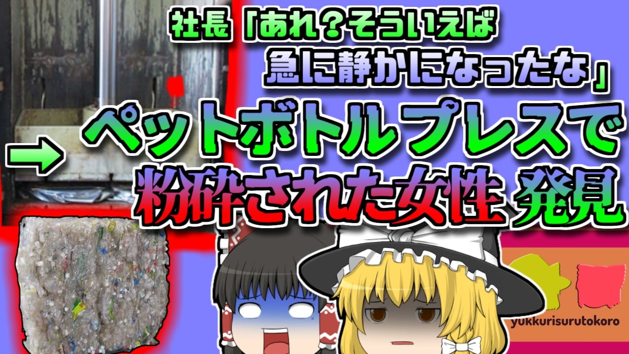#ゆっくりするところ #プレス機 #労災<br>今回紹介するのは、以前リクエストがありました廃棄物処理工場プレス機事故事例です。<br>埼玉県某所にある、廃品回収運搬業者の工場で働くベテランパート女性「Aさん」はこの日、工場長のBさんと二人で、ペットボトルの圧縮作業を行っていました。<br>Aさんは、大型のペットボトルプレス機のスイッチを押し、大量のペットボトルをブロック状に固めるという作業を担当していましたが、作業開始して数時間後。<br>Bさんは周期的になっていた、プレス機の音が聞こえてこないことに気が付きます。<br>不審に思った彼がプレス機の様子を見に行くと、そこには変わり果てたAさんの姿がありました・・・<br><br><a href="#" class="seekTime" data-seekTime="00:00" onclick="seekNicoPlayer('#00:00'); return false;">#00:00</a> 冒頭挨拶<br><a href="#" class="seekTime" data-seekTime="00:30" onclick="seekNicoPlayer('#00:30'); return false;">#00:30</a> 視聴上の注意・免責事項<br><a href="#" class="seekTime" data-seekTime="1:18" onclick="seekNicoPlayer('#1:18'); return false;">#1:18</a> 現地の説明<br><a href="#" class="seekTime" data-seekTime="2:17" onclick="seekNicoPlayer('#2:17'); return false;">#2:17</a> ベテランパートの女性「Aさん」<br><a href="#" class="seekTime" data-seekTime="2:47" onclick="seekNicoPlayer('#2:47'); return false;">#2:47</a> 廃品回収加工会社<br><a href="#" class="seekTime" data-seekTime="3:50" onclick="seekNicoPlayer('#3:50'); return false;">#3:50</a> 責任者の「Bさん」<br><a href="#" class="seekTime" data-seekTime="4:46" onclick="seekNicoPlayer('#4:46'); return false;">#4:46</a> 急に静かになった現場<br><a href="#" class="seekTime" data-seekTime="5:35" onclick="seekNicoPlayer('#5:35'); return false;">#5:35</a> 原因の調査<br><a href="#" class="seekTime" data-seekTime="6:08" onclick="seekNicoPlayer('#6:08'); return false;">#6:08</a> 状況からの推測<br><a href="#" class="seekTime" data-seekTime="8:40" onclick="seekNicoPlayer('#8:40'); return false;">#8:40</a> 同種の災害防止への対策<br><br><br><br>引用・出展・参考文献<br>安衛則第107条 機械の運転停止義務<br><a href="https://ishort.ink/1WSZ" target="_blank" rel="noopener nofollow">https://ishort.ink/1WSZ</a><br><a href="https://ishort.ink/u5cH" target="_blank" rel="noopener nofollow">https://ishort.ink/u5cH</a><br>機械安全の法律・規格と設計手法<br><a href="https://ishort.ink/r6XL" target="_blank" rel="noopener nofollow">https://ishort.ink/r6XL</a><br>鎌長製衛㈱ プレス機各種<br><a href="https://ishort.ink/rmMa" target="_blank" rel="noopener nofollow">https://ishort.ink/rmMa</a><br>埼玉新聞<br><a href="https://www.saitama-np.co.jp/news/2016/06/02/01.html" target="_blank" rel="noopener nofollow">https://www.saitama-np.co.jp/news/2016/06/02/01.html</a><br>プレス機械又はシャーの安全装置構造規格 目次<br><a href="https://ishort.ink/35v8" target="_blank" rel="noopener nofollow">https://ishort.ink/35v8</a><br>その他視聴者提供資料など<br><br>ご要望にお応えして、メンバーシップの開設を行いました。<br>下記URLからも登録可能ですので、ご興味がある方は是非ご参加ください。<br><a href="https://www.youtube.com/channel/UCcT5a1J7XJW7CLYI2RKl4pw/join" target="_blank" rel="noopener nofollow">https://www.youtube.com/channel/UCcT5a1J7XJW7CLYI2RKl4pw/join</a><br />※この動画は過去の事件を知り、現在でも同じことが発生する危険性を再認識、関与しないように促すための動画であり、視聴者を扇動、動揺を誘うためのコンテンツではありません。<br><br>ご要望にお応えして、メンバーシップの開設を行いました。<br>下記URLからも登録可能ですので、ご興味がある方は是非ご参加ください。<br><a href="https://www.youtube.com/channel/UCcT5a1J7XJW7CLYI2RKl4pw/join" target="_blank" rel="noopener nofollow">https://www.youtube.com/channel/UCcT5a1J7XJW7CLYI2RKl4pw/join</a><br><br><br>Twitter<br>→<a href="https://twitter.com/yukkurisurutoko" target="_blank" rel="noopener nofollow">https://twitter.com/yukkurisurutoko</a><br><br>取り急ぎ、簡易的にですがマイリストを作りました。<br>【ゆっくり解説】事故・事件関係紹介リスト <br><a href="https://www.nicovideo.jp/mylist/71034319" target="_blank" rel="noopener nofollow">https://www.nicovideo.jp/mylist/71034319</a><br>【ゆっくり解説】放射線系事故<br><a href="https://www.nicovideo.jp/mylist/71034368" target="_blank" rel="noopener nofollow">https://www.nicovideo.jp/mylist/71034368</a><br>【ゆっくり解説】鉄道系事故・事件関連<br><a href="https://www.nicovideo.jp/mylist/71034379" target="_blank" rel="noopener nofollow">https://www.nicovideo.jp/mylist/71034379</a>