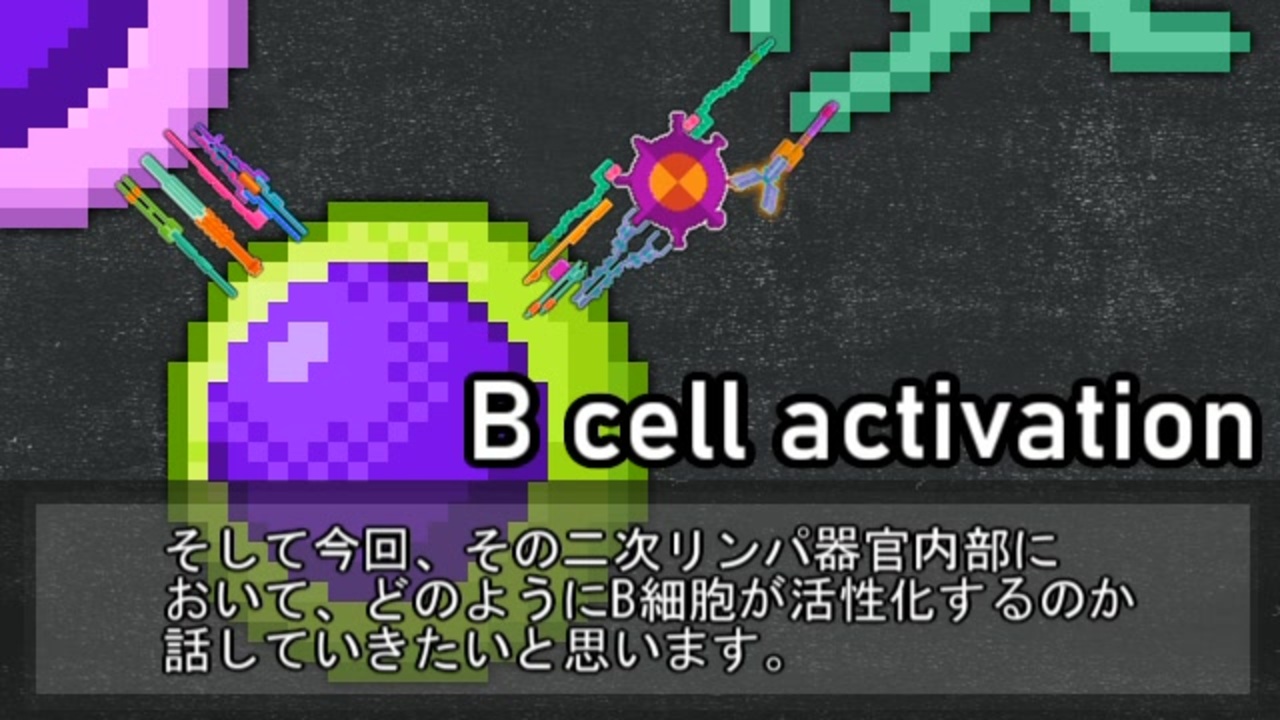 大変お待たせしました。今回こそB細胞の活性化についてです。<br> 前回、今回、そして次回の3回を通してB細胞中心の反応について見終えると、主な免疫応答に関する内容は終わることになります。といっても、寛容や記憶など、話す内容はまだまだありますが。<br> それから、今回の動画では「動くピクトさん」を投入しました。今回は内容自体厄介だったのに加え、映像面でも苦労が絶えませんでした。その分、分かりやすくなっていればよいのですが……<br><br><span style="color: #000000; font-size: 14px;">【Twitter】→ </span><span style="color: #006699; font-size: 14px;"><a href="https://twitter.com/immunoamateur" target="_blank" rel="noopener nofollow">https://twitter.com/immunoamateur</a></span><br>【第1回】→ <a href="https://www.nicovideo.jp/watch/sm33686747" class="watch">sm33686747</a> 免疫学の基本 <br><span style="color: #000000; font-size: 14px;">【前回】→ </span><a href="https://www.nicovideo.jp/watch/sm40401105" class="watch">sm40401105</a> 二次リンパ器官<br><span style="color: #000000;">【次回】→ 胚中心の話 行進具合はTwitterで<br>【投稿動画】 → </span><span style="color: #006699; font-size: 14px;"><a href="https://www.nicovideo.jp/mylist/63388345" target="_blank" rel="noopener">mylist/63388345</a></span>