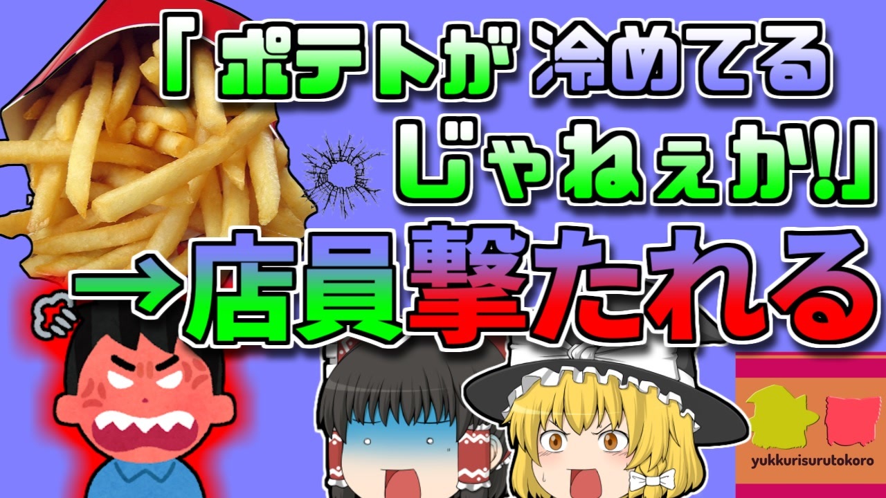 今回紹介するのは、リクエストの中から<br>「ハンバーガーショップ」での苦情に関する事例です。<br>アメリカ合衆国 大西洋沿岸、中部に位置する<br>ニューヨーク州ブルックリンにある、ハンバーガーチェーン店で、一人の女性が夕食をとるために来店していました。<br><br>彼女は市内に暮らす女性「Aさん」。<br>Aさんは店に入り、ハンバーガーのセットを注文し、商品を受け取って、席について食事を始めましたが、提供されたポテトが冷めてしまっていることに気が付きました。<br>憤りを感じたAさんは、店員に苦情を入れました。<br>すると、男性店員とAさんは口論になってしまい、Aさんはそのうち泣き出してしまい、携帯電話で息子の「Bさん」を呼び出しました。<br>母親からの連絡を受け、Bさんはすぐに現場に駆け付け、店員に詰め寄りました。<br><br>そして、彼を店外に呼び出し、持っていたモノで・・・<br><br><a href="#" class="seekTime" data-seekTime="00:00" onclick="seekNicoPlayer('#00:00'); return false;">#00:00</a> 冒頭挨拶<br><a href="#" class="seekTime" data-seekTime="00:25" onclick="seekNicoPlayer('#00:25'); return false;">#00:25</a> 視聴上の注意・免責事項<br><a href="#" class="seekTime" data-seekTime="1:14" onclick="seekNicoPlayer('#1:14'); return false;">#1:14</a> 現地の説明<br><a href="#" class="seekTime" data-seekTime="2:30" onclick="seekNicoPlayer('#2:30'); return false;">#2:30</a> ファストフード店「M」<br><a href="#" class="seekTime" data-seekTime="3:00" onclick="seekNicoPlayer('#3:00'); return false;">#3:00</a> 冷めてしまっていたフライドポテト<br><a href="#" class="seekTime" data-seekTime="3:51" onclick="seekNicoPlayer('#3:51'); return false;">#3:51</a> 息子に電話したAさん<br><a href="#" class="seekTime" data-seekTime="4:17" onclick="seekNicoPlayer('#4:17'); return false;">#4:17</a> Bさんが到着。そして・・・<br><a href="#" class="seekTime" data-seekTime="5:17" onclick="seekNicoPlayer('#5:17'); return false;">#5:17</a> 〇人未遂で逮捕<br><a href="#" class="seekTime" data-seekTime="6:08" onclick="seekNicoPlayer('#6:08'); return false;">#6:08</a> Mでは提供ルールが定められていた<br><a href="#" class="seekTime" data-seekTime="7:44" onclick="seekNicoPlayer('#7:44'); return false;">#7:44</a> 「お客様は神様です」の本当の意味<br><br><br><br>引用・出展・参考文献<br>New York Post<br><a href="https://ishort.ink/8fbh" target="_blank" rel="noopener nofollow">https://ishort.ink/8fbh</a><br>Wikipedia<br><a href="https://ishort.ink/Zt16" target="_blank" rel="noopener nofollow">https://ishort.ink/Zt16</a><br><a href="https://ishort.ink/sDr4" target="_blank" rel="noopener nofollow">https://ishort.ink/sDr4</a><br>食ジョブコラム<br><a href="https://ishort.ink/Hcsx" target="_blank" rel="noopener nofollow">https://ishort.ink/Hcsx</a><br>その他視聴者提供資料など<br><br><br><br>ご要望にお応えして、メンバーシップの開設を行いました。<br>下記URLからも登録可能ですので、ご興味がある方は是非ご参加ください。<br><a href="https://www.youtube.com/channel/UCcT5a1J7XJW7CLYI2RKl4pw/join" target="_blank" rel="noopener nofollow">https://www.youtube.com/channel/UCcT5a1J7XJW7CLYI2RKl4pw/join</a><br />※この動画は過去の事件を知り、現在でも同じことが発生する危険性を再認識、関与しないように促すための動画であり、視聴者を扇動、動揺を誘うためのコンテンツではありません。<br><br>ご要望にお応えして、メンバーシップの開設を行いました。<br>下記URLからも登録可能ですので、ご興味がある方は是非ご参加ください。<br><a href="https://www.youtube.com/channel/UCcT5a1J7XJW7CLYI2RKl4pw/join" target="_blank" rel="noopener nofollow">https://www.youtube.com/channel/UCcT5a1J7XJW7CLYI2RKl4pw/join</a><br><br><br>Twitter<br>→<a href="https://twitter.com/yukkurisurutoko" target="_blank" rel="noopener nofollow">https://twitter.com/yukkurisurutoko</a><br><br>取り急ぎ、簡易的にですがマイリストを作りました。<br>【ゆっくり解説】事故・事件関係紹介リスト <br><a href="https://www.nicovideo.jp/mylist/71034319" target="_blank" rel="noopener nofollow">https://www.nicovideo.jp/mylist/71034319</a><br>【ゆっくり解説】放射線系事故<br><a href="https://www.nicovideo.jp/mylist/71034368" target="_blank" rel="noopener nofollow">https://www.nicovideo.jp/mylist/71034368</a><br>【ゆっくり解説】鉄道系事故・事件関連<br><a href="https://www.nicovideo.jp/mylist/71034379" target="_blank" rel="noopener nofollow">https://www.nicovideo.jp/mylist/71034379</a>