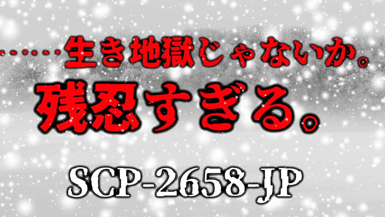 相棒<br><br>前→(<a href="https://www.nicovideo.jp/watch/sm40898153" class="watch">sm40898153</a>) 次→(<a href="https://www.nicovideo.jp/watch/sm41244804" class="watch">sm41244804</a>)<br><br>マイリスト(<a href="https://www.nicovideo.jp/mylist/68596777" target="_blank" rel="noopener">mylist/68596777</a>)<br><br>【きみょんなSCP紹介】(<a href="https://www.nicovideo.jp/mylist/65586082" target="_blank" rel="noopener">mylist/65586082</a>) <br>【SCP紹介タイムアタック】→(<a href="https://www.nicovideo.jp/mylist/67888696" target="_blank" rel="noopener">mylist/67888696</a>)<br>【東方二次創作】→(<a href="https://www.nicovideo.jp/mylist/68600326" target="_blank" rel="noopener">mylist/68600326</a>)<br><br>SCP <br>Author: eagle-yuki<br>Title: SCP-2658-JP - 終着点<br>Source: <a href="http://scp-jp.wikidot.com/scp-2658-jp" target="_blank" rel="noopener nofollow">http://scp-jp.wikidot.com/scp-2658-jp</a><br>CC BY-SA 3.0<br><br>SCP Foundation( <a href="http://www.scp-wiki.net/)" target="_blank" rel="noopener nofollow">http://www.scp-wiki.net/)</a><br>SCP財団(<a href="http://ja.scp-wiki.net/)" target="_blank" rel="noopener nofollow">http://ja.scp-wiki.net/)</a><br>CC-BY-SA 3.0<br><br>クレジット関係<br>動画 <a href="https://www.nicovideo.jp/watch/sm40499092" target="_blank" rel="noopener nofollow">https://www.nicovideo.jp/watch/sm40499092</a><br>動画 <a href="https://www.nicovideo.jp/watch/sm40465457" target="_blank" rel="noopener nofollow">https://www.nicovideo.jp/watch/sm40465457</a><br><br>Twitter(<a href="https://mobile.twitter.com/hidariueAika_" target="_blank" rel="noopener nofollow">https://mobile.twitter.com/hidariueAika_</a>