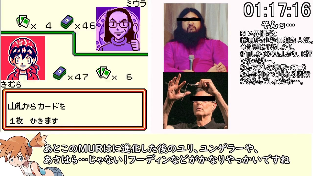 <span style="color: #ff0000; font-size: 18px;">ついに決着!再走不可避な世界87位の走りだ!</span><br><br>記録リンク<br><a href="https://www.speedrun.com/pkmntcg" target="_blank" rel="noopener nofollow">https://www.speedrun.com/pkmntcg</a><br><br>前→<a href="https://www.nicovideo.jp/watch/sm41050857" class="watch">sm41050857</a><br>次→のびたの恐竜2006DSが有力。<br><br>前任者兄貴→<a href="https://www.nicovideo.jp/watch/sm24805840" class="watch">sm24805840</a><br><br>ルール<br>①リセットやセーブはなし<br>②乱数調整はしない<br>③連射コン禁止<br>④エミュレータ(レトロフリーク)でやっています。<br><br>過去のRTA<br>サカつく6<br><a href="https://www.upload.nicovideo.jp/garage/series/344587" target="_blank" rel="noopener nofollow">https://www.upload.nicovideo.jp/garage/series/344587</a><br>ウマ娘RTA<br><a href="https://www.upload.nicovideo.jp/garage/series/231571" target="_blank" rel="noopener nofollow">https://www.upload.nicovideo.jp/garage/series/231571</a><br>ダビスタSwitchRTA<br><a href="https://www.upload.nicovideo.jp/garage/series/341389" target="_blank" rel="noopener nofollow">https://www.upload.nicovideo.jp/garage/series/341389</a><br>記録動画<br><a href="https://youtu.be/_PUjy_iIu0I" target="_blank" rel="noopener nofollow">https://youtu.be/_PUjy_iIu0I</a><br><br>Twitter<br>@koyazaru36movieをRTAアカウントにしました。是非フォローオナシャス
