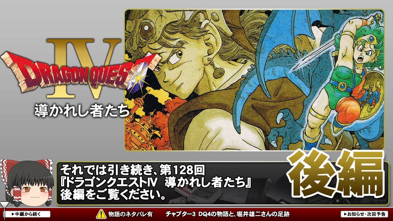 <strong>原則、「前編」「後編」合わせて毎回約30分を予定しています。<br><br>▼第128回「ドラゴンクエストⅣ 導かれし者たち」</strong><br>前編:<a href="https://www.nicovideo.jp/watch/sm41017009" class="watch">sm41017009</a><br>中編:<a href="https://www.nicovideo.jp/watch/sm41054979" class="watch">sm41054979</a><br><br>▼第10回「ドラクエⅣ」<br>前編:<a href="https://www.nicovideo.jp/watch/sm31319264" class="watch">sm31319264</a><br>後編:<a href="https://www.nicovideo.jp/watch/sm31345689" class="watch">sm31345689</a><br><br>■youtubeはこちら <a href="https://youtu.be/byjEmsx5CFk" target="_blank" rel="noopener nofollow">https://youtu.be/byjEmsx5CFk</a><br>■ゲーム夜話ツイッター <a href="https://twitter.com/gameyawa" target="_blank" rel="noopener nofollow">https://twitter.com/gameyawa</a><br><br>(C)1986,1987,1988,1990 ARMOR PROJECT/BIRD STUDIO/SPIKE CHUNSOFT/SQUARE ENIX All Rights Reserved.<br>(C)SUGIYAMA KOBO