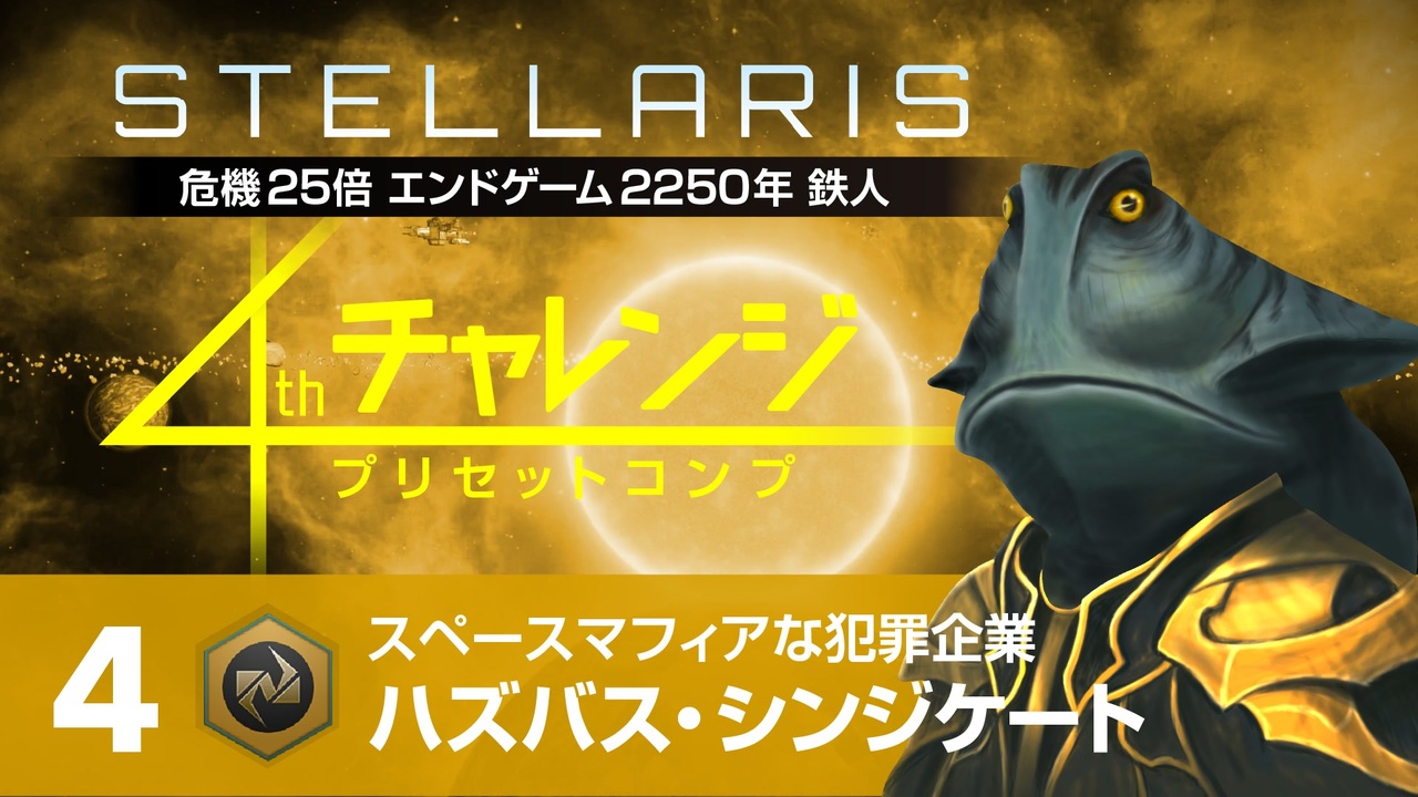 プリセット帝国で危機25倍エンドゲーム2250年鉄人モードに挑むシリーズのハイライト編集版です。<br>「いいね」に、このプリセット帝国のおすすめ度を入れています。<br><br>☆公開収録<br>ニコニコ生放送でほぼ毎日22-24時にプレイしています(都合により変更します)<br><a href="https://live.nicovideo.jp/watch/user/21486754" target="_blank" rel="noopener nofollow">https://live.nicovideo.jp/watch/user/21486754</a><br><br>☆Youtube(微修正版)<br><a href="https://youtu.be/iJepAevaBiM" target="_blank" rel="noopener nofollow">https://youtu.be/iJepAevaBiM</a><br><br>☆チャレンジの詳細はこちら(予告編)<br><a href="https://www.nicovideo.jp/watch/sm39832845" class="watch">sm39832845</a><br><br>☆ナレーション<br>四国めたん(VOICEVOX)<br><br>☆イラスト<br>自作(模写+アレンジ)<br><br>☆バージョン<br>Stellaris Ver.3.4.5<br><br>☆使用したプリセット帝国<br>ハズバズ・シンジケート<br>志向:狂信的な軍国主義、精神主義<br>国是:犯罪の系譜、フランチャイズ経営<br>起源:統一による繁栄<br><br>☆設定<br>危機のレベル:25x<br>ミッドゲーム:2225年<br>エンドゲーム:2250年<br>難易度 :元帥<br>鉄人モード :オン<br>その他 :デフォルト<br><br>☆DLC<br>Over lordまで全部<br /><br><span style="color: #262626;">1stチャレンジ(国際地球連合編)⇒ </span><span style="color: #0000ff;"><a href="https://www.nicovideo.jp/series/157544" target="_blank" rel="noopener">series/157544</a></span><br><span style="color: #262626;">2ndチャレンジ(人類共同体編)⇒ </span><span style="color: #0000ff;"><a href="https://www.nicovideo.jp/series/182469" target="_blank" rel="noopener">series/182469</a></span><br><span style="color: #262626;">3rdチャレンジ(ロク機械主義国編)⇒ </span><span style="color: #0000ff;"><a href="https://www.nicovideo.jp/series/207056" target="_blank" rel="noopener">series/207056</a></span><br><span style="color: #262626;">4thチャレンジ(プリセットコンプ)⇒ </span><span style="color: #0000ff;"><a href="https://www.nicovideo.jp/series/287612" target="_blank" rel="noopener">series/287612</a></span><br><span style="color: #262626;">Stellarisマルチプレイ ⇒ </span><span style="color: #0000ff;"><a href="https://www.nicovideo.jp/series/367123" target="_blank" rel="noopener">series/367123</a></span><br><span style="color: #262626;">Stellaris検証動画 ⇒ </span><span style="color: #0000ff;"><a href="https://www.nicovideo.jp/series/202576" target="_blank" rel="noopener">series/202576</a></span><br><span style="color: #262626;">Stellaris妄想動画 ⇒ </span><span style="color: #0000ff;"><a href="https://www.nicovideo.jp/series/310298" target="_blank" rel="noopener">series/310298</a></span><br>Stellaris1分動画祭 ⇒ <a href="https://www.nicovideo.jp/series/404730" target="_blank" rel="noopener">series/404730</a><br><br><br><a target="_blank" href="https://qa.nicovideo.jp/faq/show/19424?site_domain=default" style="font-size: 13px;color: #657586; text-decoration: underline; line-height: 1.4">この動画は投稿者によって修正されました</a>