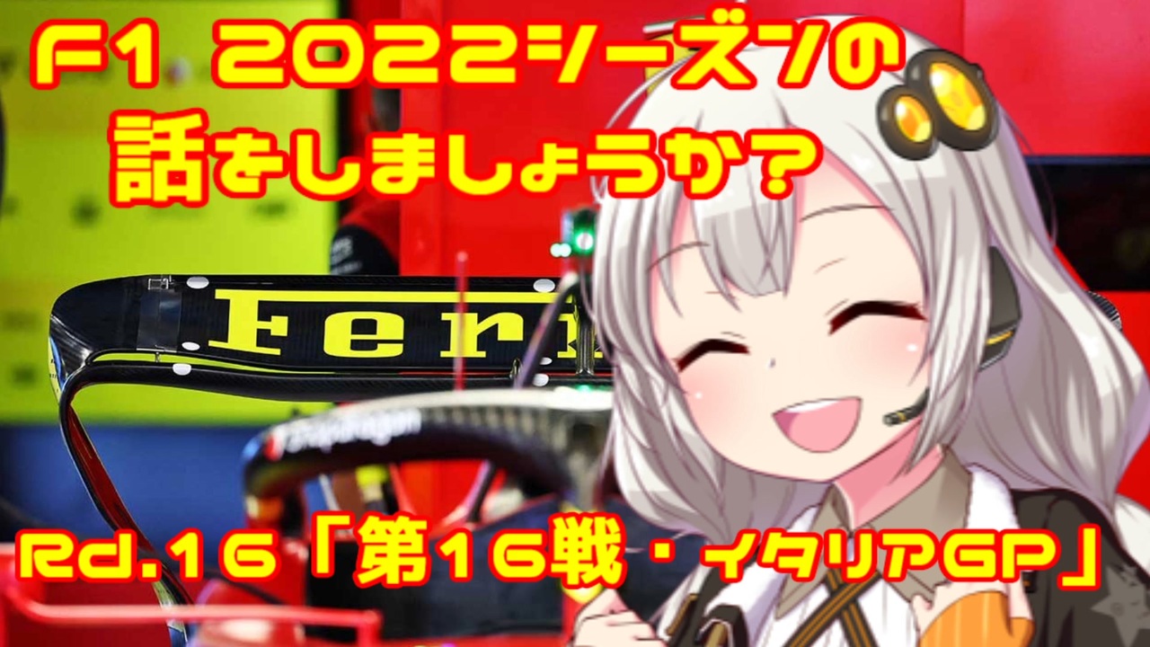 「フェラーリ75周年!モンツァ100周年!」by紲星あかり<br><br><br>おはこんばんちは、紲星あかりです。<br>この動画は、F1 2022年シーズンをダイジェストでお送りしています。<br>今回は第16戦・イタリアGPをお送りします。<br>ヨーロッパラウンド最終戦の舞台は今年100周年を迎えた「スピードの神殿」<br>モンツァ・サーキット。地元GPで絶対にミスが許されないフェラーリは<br>大観衆のティフォシの前で勝利することができたのでしょうか?<br><br><br><span style="color: red;">(ご注意)この動画の情報は真実とは限りません。また、誤字・脱字が含まれる場合があります。ご了承ください。</span><br><br><br>前→第15戦・オランダGP <a href="https://www.nicovideo.jp/watch/sm41049514" class="watch">sm41049514</a><br>次→第17戦・シンガポールGP <a href="https://www.nicovideo.jp/watch/sm41179439" class="watch">sm41179439</a><br><br> <br>F12022シーズンの話をしましょうか?マイリスト→<a href="https://www.nicovideo.jp/mylist/72892585" target="_blank" rel="noopener">mylist/72892585</a><br><br>うp主のF1動画シリーズ<br>F12021シーズンの話をしましょうか?マイリスト→<a href="https://www.nicovideo.jp/mylist/70735663" target="_blank" rel="noopener">mylist/70735663</a><br>F12020シーズンの話をしましょうか?マイリスト→<a href="https://www.nicovideo.jp/mylist/67651731" target="_blank" rel="noopener">mylist/67651731</a> <br><span style="color: #000000; font-size: 14px;">F12019シーズンの話をしましょうか?マイリスト</span><span style="color: #000000; font-size: 13px;">→</span><a href="https://www.nicovideo.jp/mylist/64678414" target="_blank" rel="noopener">mylist/64678414</a><br><span style="color: #000000; font-size: 14px;">F12018シーズンの話をしましょうか?マイリスト</span><span style="color: #000000; font-size: 13px;">→</span><a href="https://www.nicovideo.jp/mylist/61514606" target="_blank" rel="noopener">mylist/61514606</a><br>F1の話をしましょうか?マイリスト→<a href="https://www.nicovideo.jp/mylist/40499353" target="_blank" rel="noopener">mylist/40499353</a><br>F1の話をしましょうか?OPフルバージョン→<a href="https://www.nicovideo.jp/mylist/59030210" target="_blank" rel="noopener">mylist/59030210</a><br>F1 CM集→<a href="https://www.nicovideo.jp/mylist/57297507" target="_blank" rel="noopener">mylist/57297507</a><br><br>