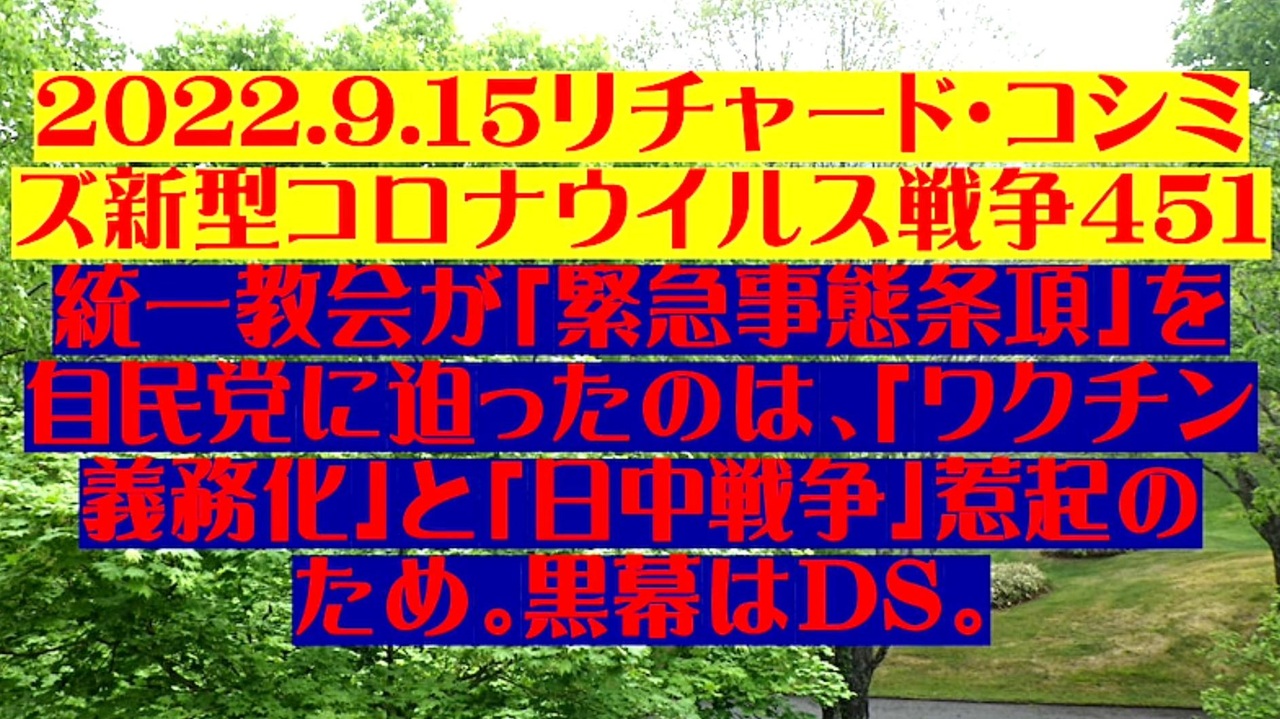 <span style="color: #cc4125;"><strong>「 テーマ:新型コロナウイルス戦争 451 」</strong></span><br><br><span style="color: #ff0000;"><strong>「 統一教会が『 緊急事態条項 』を自民党に迫ったのは、『 ワクチン義務化 』と『 日中戦争 』惹起のため。<br> 黒幕は、DEEP STATE裏社会 」</strong></span><br><br>◐何故、朝鮮半島の反社邪教が、「日本の政権与党」に命令するのか?<br><br>◐「統一教会」の背後のDEEP STATE裏社会は、「緊急事態条項」で「ワクチン強制」を企んでいる。<br> 皆殺し。<br><br>◐毒ワクチンは、「人類9割削減」のカギ。<br> 「統一教会・岸田文雄」は、「ビル・ゲイツ」から皆接種を厳命されている。<br><br>◐子供に毒ワクチンを接種させ、変異株を発生させる。女児は、不妊症・流産。<br> 究極の「人口削減」手口である。<br><br>◐ハザール・マフィアが総動員で、対人類ワクチン攻撃。<br><br>◐「ワクチン接種者も非接種者も、スパイクタンパクで落命」を阻むイベルメクチン。<br><br>◐「日中戦争」惹起で、2030年の中米GDP逆転を阻みたいDEEP STATE裏社会。<br> 「緊急事態条項」で戦争に誘導。<br><br><strong>*「フォロー」・「ニコニ広告」・「いいね!」・「情報拡散」等、ご協力下さい。 リチャード・コシミズ</strong><br><br><span style="color: #38761d;">◆</span><span style="color: #38761d;"><strong>リチャード・コシミズ 公式 ブログ</strong></span><br> <a href="https://richard-koshimizu.jimdosite.com/" target="_blank" rel="noopener nofollow">https://richard-koshimizu.jimdosite.com/</a><br><br><span style="color: #38761d;">◆</span><span style="color: #38761d;"><strong>リチャード・コシミズ 公式 ホームページ<br> </strong></span><a href="http://richardkoshimizu.boo.jp/" target="_blank" rel="noopener nofollow">http://richardkoshimizu.boo.jp/</a><br><br><span style="color: #38761d;">◆</span><span style="color: #38761d;"><strong>リチャード・コシミズ 講演会 公式 動画ギャラリー</strong></span><br> <a href="http://www.t-sskk.com/richardkoshimizu/video-gallery/index.html" target="_blank" rel="noopener nofollow">http://www.t-sskk.com/richardkoshimizu/video-gallery/index.html</a><br>