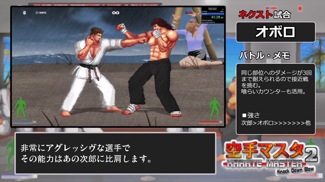 今明かされる幻の1作目、そしてあのバグの解決法を伝授する。空手マスター2のリアルタイムアタック part2です。 ゲームスタートから隠しボスOBORO(範馬勇次郎)撃破し、Kate(恋人)を抱き上げた瞬間までをタイムとして計測します。<br><span style="color: #ff00ff;"><strong>※元ネタ情報やそのほか多くのコメントありがとうございます!おかげでよりこのゲームについて知ることができました!</strong></span><br><br> VOICEVOX:ずんだもん(ノーマル)、四国めたん(あまあま)、春日部つむぎ<br>part1 <a href="https://www.nicovideo.jp/watch/sm41094837" class="watch">sm41094837</a><br>part3[通常ED RTA]<a href="https://www.nicovideo.jp/watch/sm41095706" class="watch">sm41095706</a><br><br><span style="color: #ff00ff;"><strong>好評発売中です!</strong></span>→<a href="https://store.steampowered.com/app/347670" target="_blank" rel="noopener nofollow">https://store.steampowered.com/app/347670</a><br><br>RTA part1まとめ <a href="https://www.nicovideo.jp/mylist/70732579" target="_blank" rel="noopener">mylist/70732579</a><br>やりこみなど <a href="https://www.nicovideo.jp/mylist/71232748" target="_blank" rel="noopener">mylist/71232748</a><br>無編集 <a href="https://youtu.be/HZMPauiusEU" target="_blank" rel="noopener nofollow">https://youtu.be/HZMPauiusEU</a>