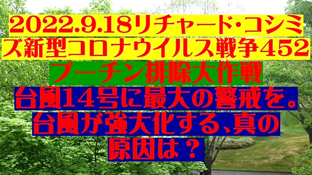 <span style="color: #cc4125;"><strong>「 テーマ:新型コロナウイルス戦争 452 」</strong></span><br><br><span style="color: #ff0000;"><strong>「『 ウラジーミル・プーチン排除大作戦 』・『 台風14号に最大の警戒を 』・<br> 『 台風が強大化する真の原因は? 』」</strong></span><br><br>◐ウクライナ国王・「ジョージ・ソロス」は、ウクライナを拠点に宿敵プーチンをおびき出し、<br> 戦争に引き込んだ。<br><br>◐プーチン・ロシアは産油国第3位であり、第2位のサウジアラビア、第4位のイランと共同して、<br> 原油をドル以外で取引する方向。<br> 「石油ドル体制」を破壊する。原油消費国、中国・インドも同調。<br> 米国は必死にシェールガスを掘り、「石油ドル体制」を死守 ⇒ 日本に「巨大台風」が来襲する。<br><br>◐プーチンに、「ポストコロナのウイルス拠点」を潰された恨み。<br><br>◐中国・露西亜がBRICS、上海経済協力機構で世界人口の過半数を統括。<br> DEEP STATEのG7は没落。DEEP STATEの落日。<br><br>◐プーチンを排除できないと、米国ドナルド・トランプ「新」大統領と連携されて、<br> DEEP STATE利権を壊される。<br><br><strong>*「フォロー」・「ニコニ広告」・「いいね!」・「情報拡散」等、ご協力下さい。 リチャード・コシミズ</strong><br><br><span style="color: #38761d;">◆</span><span style="color: #38761d;"><strong>リチャード・コシミズ 公式 ブログ</strong></span><br> <a href="https://ameblo.jp/ineversurrender/" target="_blank" rel="noopener nofollow">https://ameblo.jp/ineversurrender/</a><br><br><span style="color: #38761d;">◆</span><span style="color: #38761d;"><strong>リチャード・コシミズ 公式 ホームページ<br> </strong></span><a href="http://richardkoshimizu.boo.jp/" target="_blank" rel="noopener nofollow">http://richardkoshimizu.boo.jp/</a><br><br><span style="color: #38761d;">◆</span><span style="color: #38761d;"><strong>リチャード・コシミズ 講演会 公式 動画ギャラリー</strong></span><br> <a href="http://www.t-sskk.com/richardkoshimizu/video-gallery/index.html" target="_blank" rel="noopener nofollow">http://www.t-sskk.com/richardkoshimizu/video-gallery/index.html</a><br>