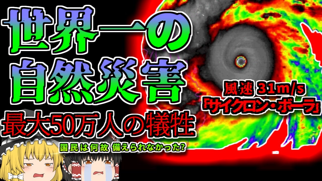 今回紹介するのは、以前からリクエストがありました「バングラディシュサイクロン」に関する事例です。<br>当時の東パキスタン、現在のバングラディシュは、1970年に襲来したサイクロン「ボーラ」によって、壊滅的な被害を被りました。<br>このサイクロンは、風速約50m毎秒という、恐ろしい早さと強さで進行し、東パキスタン島々を襲いましたが、当時の国民はこの自然災害に対する備えが実質的にほとんどできておらず、なすすべもなく多くの人々の命が散っていきました。<br>複数の要因によって被害が拡大し、推定によれば、最大でおよそ50万人の人々が犠牲となったといわれており、このサイクロン災害は、「20世紀以降最悪」と称されるほど、深刻な被害を受けていました。<br>今回の動画では、台風への備えも合わせて紹介していますので、ぜひ後半部分もご覧ください。<br><br><a href="#" class="seekTime" data-seekTime="00:00" onclick="seekNicoPlayer('#00:00'); return false;">#00:00</a> 冒頭挨拶<br><a href="#" class="seekTime" data-seekTime="00:35" onclick="seekNicoPlayer('#00:35'); return false;">#00:35</a> 視聴上の注意・免責事項<br><a href="#" class="seekTime" data-seekTime="1:18" onclick="seekNicoPlayer('#1:18'); return false;">#1:18</a> 発生地<br><a href="#" class="seekTime" data-seekTime="1:52" onclick="seekNicoPlayer('#1:52'); return false;">#1:52</a> サイクロン襲来<br><a href="#" class="seekTime" data-seekTime="2:11" onclick="seekNicoPlayer('#2:11'); return false;">#2:11</a> 台風とサイクロンの違い<br><a href="#" class="seekTime" data-seekTime="3:16" onclick="seekNicoPlayer('#3:16'); return false;">#3:16</a> 高潮の恐ろしさ<br><a href="#" class="seekTime" data-seekTime="4:11" onclick="seekNicoPlayer('#4:11'); return false;">#4:11</a> 少なくとも20万人、最大で50万人が犠牲に<br><a href="#" class="seekTime" data-seekTime="5:36" onclick="seekNicoPlayer('#5:36'); return false;">#5:36</a> 被害拡大には複数の要因が<br><a href="#" class="seekTime" data-seekTime="5:55" onclick="seekNicoPlayer('#5:55'); return false;">#5:55</a> インド政府との関係<br><a href="#" class="seekTime" data-seekTime="7:02" onclick="seekNicoPlayer('#7:02'); return false;">#7:02</a> 警報の内容<br><a href="#" class="seekTime" data-seekTime="7:55" onclick="seekNicoPlayer('#7:55'); return false;">#7:55</a> ほとんどの国民は備えられていなかった<br><a href="#" class="seekTime" data-seekTime="8:46" onclick="seekNicoPlayer('#8:46'); return false;">#8:46</a> 中央政府(西パキスタン)の対応<br><a href="#" class="seekTime" data-seekTime="10:40" onclick="seekNicoPlayer('#10:40'); return false;">#10:40</a> その後の独立<br><a href="#" class="seekTime" data-seekTime="11:47" onclick="seekNicoPlayer('#11:47'); return false;">#11:47</a> 台風への備え五か条<br><a href="#" class="seekTime" data-seekTime="12:05" onclick="seekNicoPlayer('#12:05'); return false;">#12:05</a> 「家の外への備え」<br><a href="#" class="seekTime" data-seekTime="12:46" onclick="seekNicoPlayer('#12:46'); return false;">#12:46</a> 「家の中での備え」<br><a href="#" class="seekTime" data-seekTime="13:38" onclick="seekNicoPlayer('#13:38'); return false;">#13:38</a> 台風時に最も危険な場所「ドア」<br><a href="#" class="seekTime" data-seekTime="14:32" onclick="seekNicoPlayer('#14:32'); return false;">#14:32</a> 「避難場所の確認」<br><a href="#" class="seekTime" data-seekTime="15:10" onclick="seekNicoPlayer('#15:10'); return false;">#15:10</a> 「気象台の情報を取得すること」<br><a href="#" class="seekTime" data-seekTime="15:44" onclick="seekNicoPlayer('#15:44'); return false;">#15:44</a> 「外には出ない事」<br><br>引用・出展・参考文献<br>気象庁SNSアカウント一覧<br><a href="https://ishort.ink/s3AP" target="_blank" rel="noopener nofollow">https://ishort.ink/s3AP</a><br>気象庁 台風への備え五か条<br><a href="https://ishort.ink/Qpjp" target="_blank" rel="noopener nofollow">https://ishort.ink/Qpjp</a><br>Wikipedia<br><a href="https://ishort.ink/zsus" target="_blank" rel="noopener nofollow">https://ishort.ink/zsus</a><br>自然災害ランキング<br><a href="https://ishort.ink/yS1B" target="_blank" rel="noopener nofollow">https://ishort.ink/yS1B</a><br>関西電力 台風が来たらどうすればいいの?<br><a href="https://ishort.ink/EyHe" target="_blank" rel="noopener nofollow">https://ishort.ink/EyHe</a><br>バングラディシュへ行こう!<br><a href="https://ishort.ink/ikB5" target="_blank" rel="noopener nofollow">https://ishort.ink/ikB5</a><br>ダイヤモンドオンライン<br><a href="https://ishort.ink/nx1f" target="_blank" rel="noopener nofollow">https://ishort.ink/nx1f</a><br>TOPPAN 防災の心得<br><a href="https://ishort.ink/yMmR" target="_blank" rel="noopener nofollow">https://ishort.ink/yMmR</a><br>その他視聴者提供資料など<br><br />※この動画は過去の事件を知り、現在でも同じことが発生する危険性を再認識、関与しないように促すための動画であり、視聴者を扇動、動揺を誘うためのコンテンツではありません。<br><br>ご要望にお応えして、メンバーシップの開設を行いました。<br>下記URLからも登録可能ですので、ご興味がある方は是非ご参加ください。<br><a href="https://www.youtube.com/channel/UCcT5a1J7XJW7CLYI2RKl4pw/join" target="_blank" rel="noopener nofollow">https://www.youtube.com/channel/UCcT5a1J7XJW7CLYI2RKl4pw/join</a><br><br><br>Twitter<br>→<a href="https://twitter.com/yukkurisurutoko" target="_blank" rel="noopener nofollow">https://twitter.com/yukkurisurutoko</a><br><br>取り急ぎ、簡易的にですがマイリスト