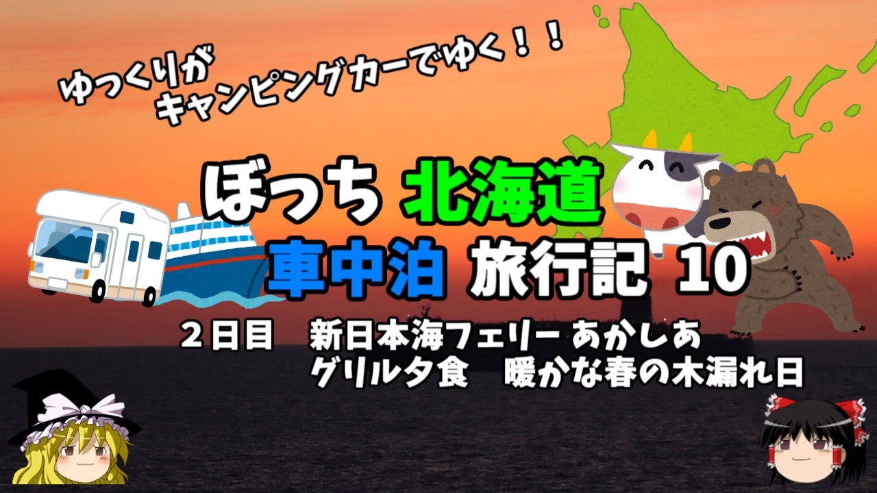 <span style="color: #ff0000; font-size: medium;"><u>※Youtubeで1話分、先行配信中 </u></span><br><span style="color: #0000ff; font-size: medium;"> <a href="http://www.youtube.com/c/なめこのぼっち旅" target="_blank" rel="noopener nofollow">http://www.youtube.com/c/なめこのぼっち旅</a></span><br><br><br>2022年GWに北海道にキャンピングカーで行ってきました!<br>その模様をお伝えします!<br><br>今回利用した新日本海フェリーあかしあのグリルでの夕食の模様をお伝えします<br><br><span style="color: #ff0000;">コミュニティー→co2910020</span><br><br>twitter→<a href="https://twitter.com/ryontan" target="_blank" rel="noopener nofollow">https://twitter.com/ryontan</a><br><br><a href="https://www.nicovideo.jp/watch/sm41088861" class="watch">sm41088861</a>← 前回 <span style="color: #ff0000;">次回 →</span><a href="https://www.nicovideo.jp/watch/sm41162880" class="watch">sm41162880</a><br><br>今作 北海道車中泊旅行記→<a href="https://www.nicovideo.jp/mylist/73483035" target="_blank" rel="noopener">mylist/73483035</a><br>前作 モルディブ旅行記→<a href="https://www.nicovideo.jp/mylist/72339602" target="_blank" rel="noopener">mylist/72339602</a><br>東欧旅行記→<a href="https://www.nicovideo.jp/mylist/70339665" target="_blank" rel="noopener">mylist/70339665</a><br>解説・雑談系→<a href="https://www.nicovideo.jp/mylist/63171869" target="_blank" rel="noopener">mylist/63171869</a><br>スイス旅行記<span style="color: #000000; font-size: 14px;">→</span><a href="https://www.nicovideo.jp/mylist/68347869" target="_blank" rel="noopener">mylist/68347869</a><br>スペイン周遊記→<a href="https://www.nicovideo.jp/mylist/64537827" target="_blank" rel="noopener">mylist/64537827</a><br>韓国トルコ旅行記→<a href="https://www.nicovideo.jp/mylist/63654428" target="_blank" rel="noopener">mylist/63654428</a><br>車中泊旅行記→<a href="https://www.nicovideo.jp/mylist/54706524" target="_blank" rel="noopener">mylist/54706524</a><br>久米島(沖縄)旅行記→<a href="https://www.nicovideo.jp/mylist/63059251" target="_blank" rel="noopener">mylist/63059251</a><br>イギリスタイ旅行記→<a href="https://www.nicovideo.jp/mylist/60044833" target="_blank" rel="noopener">mylist/60044833</a><br>クルーズ旅行記→<a href="https://www.nicovideo.jp/mylist/57397685" target="_blank" rel="noopener">mylist/57397685</a><br>ドイツ周遊記→<a href="https://www.nicovideo.jp/mylist/54938346" target="_blank" rel="noopener">mylist/54938346</a><br>北海道旅行記→<a href="https://www.nicovideo.jp/mylist/52618057" target="_blank" rel="noopener">mylist/52618057</a><br>アメリカ横断記→<a href="https://www.nicovideo.jp/mylist/48621785" target="_blank" rel="noopener">mylist/48621785</a><br>イタリア周遊記→<a href="https://www.nicovideo.jp/mylist/45763559" target="_blank" rel="noopener">mylist/45763559</a><br>NY旅行記→<a href="https://www.nicovideo.jp/mylist/44343854" target="_blank" rel="noopener">mylist/44343854</a>