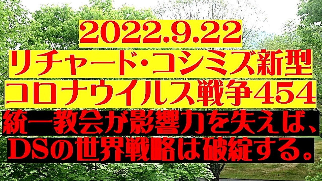 <span style="color: #cc4125;"><strong>「 テーマ:新型コロナウイルス戦争 454 」</strong></span><br><br><span style="color: #ff0000;"><strong>「『 統一教会 』が影響力を失えば、『 DEEP STATEの世界戦略 』は破綻する 」</strong></span><br><br>◐『山上徹也さん』が、『安倍晋三さん』を射殺してくれたおかげで、『統一教会が権力の座から排除』<br> されつつあり、全てが動きだした。山上さんの打った弾は、歴史を大きく変えるであろう。<br><br>◐統一教会は、『サンクチュアリ協会・Qアノン・酸性党・オウム残党・北朝鮮工作員』を統率する、<br> 日本の裏社会の元締め(テロ実行部隊)。<br><br>◐統一教会は、日本でN.W.O.を推進する母体。統一教会が戦後築いたネットワーク(政界・官界・マスコミ<br> ・自衛隊・裏社会)を失えば、DEEP STATEが、日本に求める謀略は実行できなくなる。<br><br>◐統一教会が日本で資金調達できなくなれば、自民党議員の買収・北朝鮮の支援が不能に。<br> 北朝鮮の体制不安。<br><br>◐ドナルド・トランプ氏、大統領選挙で圧倒的有利。<br><br><strong>*「フォロー」・「ニコニ広告」・「いいね!」・「情報拡散」等、ご協力下さい。 リチャード・コシミズ</strong><br><br><span style="color: #38761d;">◆</span><span style="color: #38761d;"><strong>リチャード・コシミズ 公式 ブログ</strong></span><br> <a href="https://richard-koshimizu.jimdosite.com/" target="_blank" rel="noopener nofollow">https://richard-koshimizu.jimdosite.com/</a><br><br><span style="color: #38761d;">◆</span><span style="color: #38761d;"><strong>リチャード・コシミズ 公式 ホームページ<br> </strong></span><a href="http://richardkoshimizu.boo.jp/" target="_blank" rel="noopener nofollow">http://richardkoshimizu.boo.jp/</a><br><br><span style="color: #38761d;">◆</span><span style="color: #38761d;"><strong>リチャード・コシミズ 講演会 公式 動画ギャラリー</strong></span><br> <a href="http://www.t-sskk.com/richardkoshimizu/video-gallery/index.html" target="_blank" rel="noopener nofollow">http://www.t-sskk.com/richardkoshimizu/video-gallery/index.html</a><br>