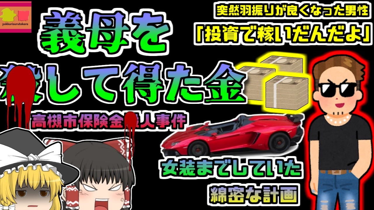 今回紹介するのは、リクエストがあった「高槻市保険金〇人事件」です。<br>大阪府高槻市に暮らす男性「Bさん」は、生命保険会社の営業マンとして活躍していたサラリーマンでしたが、最近異常なほど羽振りが良く、突然超高級車であるランボルギーニなどを購入し、連日高級クラブで豪遊、そしてその様子、自撮り写真などをSNSに投稿しており、周りの知人たちは、「どこでそんなに稼いだの?」と不思議に思っていましたが、彼は「投資で稼いだんだ。やりたいなら教えるよ」と話していましたが、<br>実は、それは高槻市内に暮らす女性「Aさん」の物で、Bさんは不正に彼女の養子となる手続きを行い、自らの勤める生命保険会社の高額保険に加入させ、その命を奪い、彼女の預貯金数千万円を奪っていたのです。<br>彼は綿密に計画を練り、Aさんが自ら命を絶ったように偽装し、現場から立ち去る際も、女装して移動するなど、冷静かつ恐ろしいほど計画的な行動をとっていました。<br><br><a href="#" class="seekTime" data-seekTime="00:00" onclick="seekNicoPlayer('#00:00'); return false;">#00:00</a> 冒頭挨拶<br><a href="#" class="seekTime" data-seekTime="00:30" onclick="seekNicoPlayer('#00:30'); return false;">#00:30</a> 視聴上の注意・免責事項<br><a href="#" class="seekTime" data-seekTime="1:09" onclick="seekNicoPlayer('#1:09'); return false;">#1:09</a> 現地の説明<br><a href="#" class="seekTime" data-seekTime="2:05" onclick="seekNicoPlayer('#2:05'); return false;">#2:05</a> 民家からの通報<br><a href="#" class="seekTime" data-seekTime="3:01" onclick="seekNicoPlayer('#3:01'); return false;">#3:01</a> 発見<br><a href="#" class="seekTime" data-seekTime="3:49" onclick="seekNicoPlayer('#3:49'); return false;">#3:49</a> 捜査開始<br><a href="#" class="seekTime" data-seekTime="5:42" onclick="seekNicoPlayer('#5:42'); return false;">#5:42</a> 養子になっていた男性「Bさん」<br><a href="#" class="seekTime" data-seekTime="6:19" onclick="seekNicoPlayer('#6:19'); return false;">#6:19</a> 異常なほどの羽振りの良さ<br><a href="#" class="seekTime" data-seekTime="7:42" onclick="seekNicoPlayer('#7:42'); return false;">#7:42</a> 高額生命保険<br><a href="#" class="seekTime" data-seekTime="8:28" onclick="seekNicoPlayer('#8:28'); return false;">#8:28</a> 保険金ではなく遺産を相続<br><a href="#" class="seekTime" data-seekTime="9:20" onclick="seekNicoPlayer('#9:20'); return false;">#9:20</a> 逮捕<br><a href="#" class="seekTime" data-seekTime="10:00" onclick="seekNicoPlayer('#10:00'); return false;">#10:00</a> 女装までして偽装していた<br><a href="#" class="seekTime" data-seekTime="11:37" onclick="seekNicoPlayer('#11:37'); return false;">#11:37</a> 自己顕示欲・承認欲求・プライドの高い人物<br><a href="#" class="seekTime" data-seekTime="14:13" onclick="seekNicoPlayer('#14:13'); return false;">#14:13</a> Bの自決<br><a href="#" class="seekTime" data-seekTime="14:34" onclick="seekNicoPlayer('#14:34'); return false;">#14:34</a> 保険金関連事件<br><br>引用・出展・参考文献<br>大阪府<br><a href="https://ishort.ink/K2t3" target="_blank" rel="noopener nofollow">https://ishort.ink/K2t3</a><br>高槻市<br><a href="https://ishort.ink/CtPb" target="_blank" rel="noopener nofollow">https://ishort.ink/CtPb</a><br>生命保険協会<br><a href="https://ishort.ink/u4jY" target="_blank" rel="noopener nofollow">https://ishort.ink/u4jY</a><br>Wikipedia<br><a href="https://ishort.ink/iZpj" target="_blank" rel="noopener nofollow">https://ishort.ink/iZpj</a><br>日本交通㈱<br><a href="https://ishort.ink/gMYN" target="_blank" rel="noopener nofollow">https://ishort.ink/gMYN</a><br>Yahoo!ニュースJAPAN<br><a href="https://ishort.ink/xhq7" target="_blank" rel="noopener nofollow">https://ishort.ink/xhq7</a><br>その他視聴者提供資料など<br><br />※この動画は過去の事件を知り、現在でも同じことが発生する危険性を再認識、関与しないように促すための動画であり、視聴者を扇動、動揺を誘うためのコンテンツではありません。<br><br>ご要望にお応えして、メンバーシップの開設を行いました。<br>下記URLからも登録可能ですので、ご興味がある方は是非ご参加ください。<br><a href="https://www.youtube.com/channel/UCcT5a1J7XJW7CLYI2RKl4pw/join" target="_blank" rel="noopener nofollow">https://www.youtube.com/channel/UCcT5a1J7XJW7CLYI2RKl4pw/join</a><br><br><br>Twitter<br>→<a href="https://twitter.com/yukkurisurutoko" target="_blank" rel="noopener nofollow">https://twitter.com/yukkurisurutoko</a><br><br>取り急ぎ、簡易的にですがマイリストを作りました。<br>【ゆっくり解説】事故・事件関係紹介リスト <br><a href="https://www.nicovideo.jp/mylist/71034319" target="_blank" rel="noopener nofollow">https://www.nicovideo.jp/mylist/71034319</a><br>【ゆっくり解説】放射線系事故<br><a href="https://www.nicovideo.jp/mylist/71034368" target="_blank" rel="noopener nofollow">https://www.nicovideo.jp/mylist/71034368</a><br>【ゆっくり解説】鉄道系事故・事件関連<br><a href="https://www.nicovideo.jp/mylist/71034379" target="_blank" rel="noopener nofollow">https://www.nicovideo.jp/mylist/71034379</a>