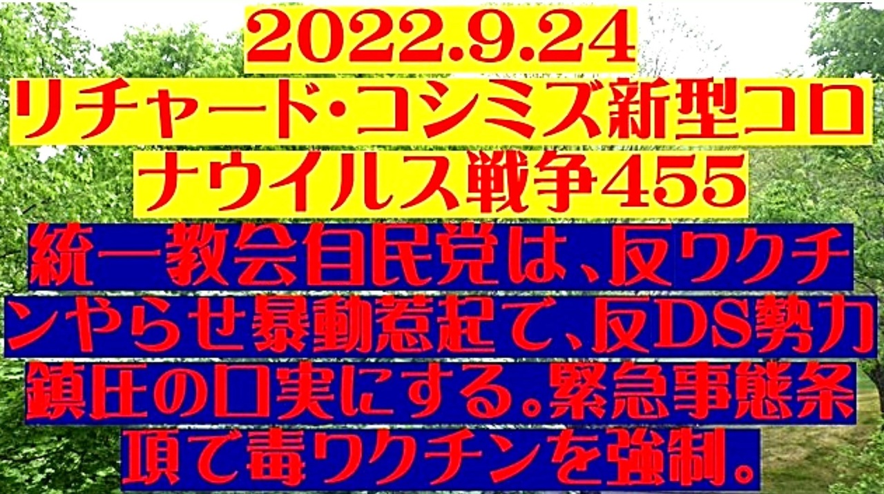 <span style="color: #cc4125;"><strong>「 テーマ:新型コロナウイルス戦争 455 」</strong></span><br><br><span style="color: #ff0000;"><strong>「『 統一教会自民党 』は、『 反ワクチンやらせ暴動惹起 』で、『 反DEEP STATE勢力鎮圧の口実 』<br> にする。『 緊急事態条項で、毒ワクチンを強制 』」</strong></span><br><br>◐「コロナワクチンの毒性」は、誤魔化しようがない。<br><br>◐高知大学:ワクチンの副作用。スパイクタンパクは、「ワクチン接種後3ケ月」経っても、<br> 皮膚疾患から検出される。<br><br>◐WHO:ワクチンで重症化する確率は、コロナで入院する確率の3倍。<br><br>◐ワクチンを打てば打つほど感染する。死亡率UP。免疫低下。<br><br>◐D博士:ワクチン接種で、6倍も感染しやすくなっている。<br><br>◐ワクチン・シェディングの問題化。<br><br>◐「特効薬『イベルメクチン』をなぜ使わない?」という声。<br><br>◐「アンソニー・ファウチが武漢研究所の黒幕」。「ワクチン忌避」を訴える声が大きくなってきた。<br><br>◐統一教会自民党政府は、必死のワクチン促進策。このままでは、反ワクチンの動きを抑え込めなくなる。<br><br><strong>*「フォロー」・「ニコニ広告」・「いいね!」・「情報拡散」等、ご協力下さい。 リチャード・コシミズ</strong><br><br><span style="color: #38761d;">◆</span><span style="color: #38761d;"><strong>リチャード・コシミズ 公式 ブログ</strong></span><br> <a href="https://richard-koshimizu.jimdosite.com/" target="_blank" rel="noopener nofollow">https://richard-koshimizu.jimdosite.com/</a><br><br><span style="color: #38761d;">◆</span><span style="color: #38761d;"><strong>リチャード・コシミズ 公式 ホームページ<br> </strong></span><a href="http://richardkoshimizu.boo.jp/" target="_blank" rel="noopener nofollow">http://richardkoshimizu.boo.jp/</a><br><br><span style="color: #38761d;">◆</span><span style="color: #38761d;"><strong>リチャード・コシミズ 講演会 公式 動画ギャラリー</strong></span><br> <a href="http://www.t-sskk.com/richardkoshimizu/video-gallery/index.html" target="_blank" rel="noopener nofollow">http://www.t-sskk.com/richardkoshimizu/video-gallery/index.html</a><br>