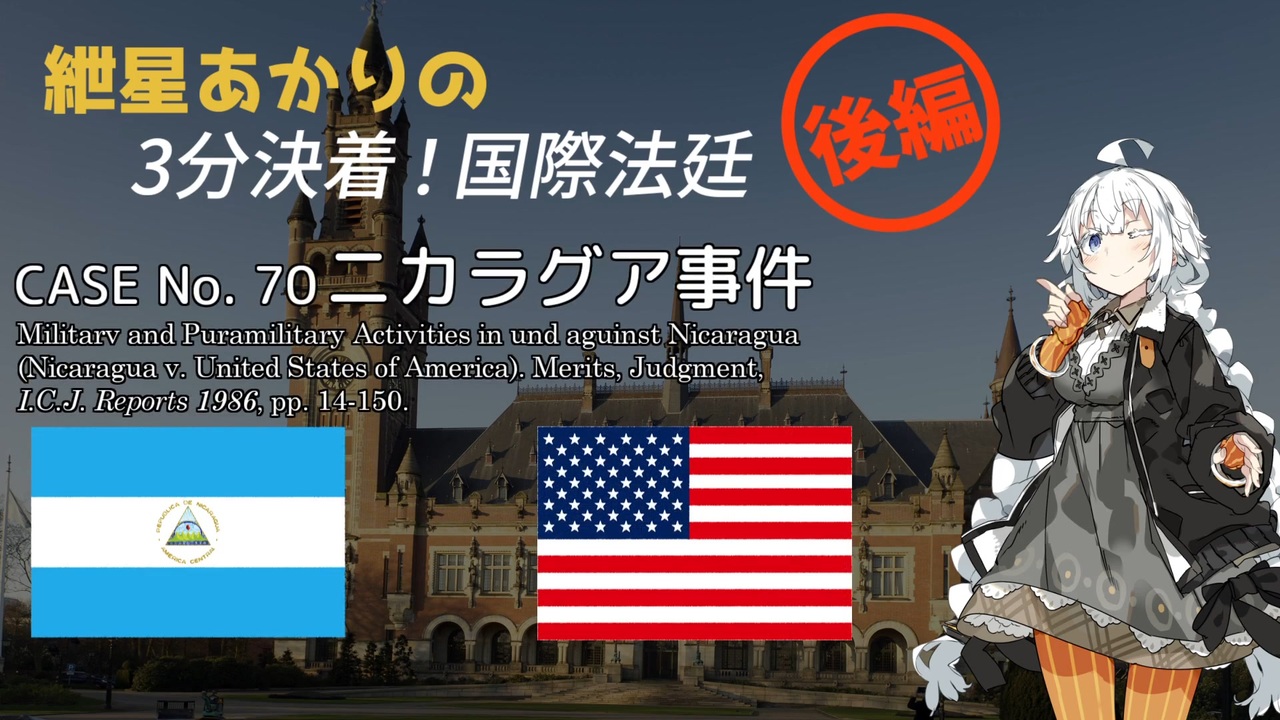 (本案審理は)初投稿です。<br><br>【訂正】<br>国家責任法は手続法です。一次規則(実体法…外交関係法、海洋法、宇宙法etc…)が国家の権利義務を定め、二次規則(手続法)は、一次規則への抵触が生じた際の責任追及に関して規律する法であり、国家責任法は二次規則にあたります。<br><br>お待たせしました。前編の投稿から1ヶ月半弱空いてしまいましたが、ようやく投稿できました。<br>後編についても、相当数の論点を省いていますので、ぜひ判決原文や動画末尾の参考文献にも当たってください。<br>次回がいつになるのか、判例解説なのか事項解説なのか分かりませんが、頑張ります。<br><br>ニカラグア事件のページはこちら(<a href="https://www.icj-cij.org/en/case/70)" target="_blank" rel="noopener nofollow">https://www.icj-cij.org/en/case/70)</a><br>機雷の論点についてはこちら(<a href="https://www.nicovideo.jp/watch/sm36874311" class="watch">sm36874311</a>)<br>「3分決着!国際法廷」シリーズはこちら(<a href="https://www.nicovideo.jp/series/341578" target="_blank" rel="noopener">series/341578</a>)<br><br>元ネタの「3分即決!国際法廷」シリーズはこちら(<a href="https://www.nicovideo.jp/series/126260" target="_blank" rel="noopener">series/126260</a>)<br>同シリーズの作者、せるヴぁんださんはこちら(<a href="https://www.nicovideo.jp/user/89884381" target="_blank" rel="noopener">user/89884381</a>)<br><br>------<br><br>前回の動画で、同一事項を規律する国際慣習法と条約の内容が矛盾する場合についてのコメントがありました。これについては、一般論として確定的なことはいえず、具体的な規則を参照して、個別に判断せざるをえません。<br>そのような抵触を解決する際に役立つのが、「特別法は一般法を破る(<i>Lex specialis derogat legi generali</i>)」や「後法は前法を破る(<i>Lex posterior derogat priori</i>)」という考え方です。<br>また、戦後になって、国際法にも垂直的規範構造が生じました。たとえば、強行規範(<i>jus cogens</i>)に抵触する国際法はその効力を失います。条約間の話にはなりますが、国連憲章103条は、他の条約上の義務に対する憲章上の義務の優先を定めています。<br>実際に規範内容の矛盾が生じた際には、これらの規則を組み合わせてその抵触を解消していくことになります。実際の紛争解決に当たる中でこのような理論的問題についても判断を下すことで、ICJを含む紛争解決機関は、単に二国間の紛争解決のみならず、国際法全体の発展にも寄与することができます。<br><br>