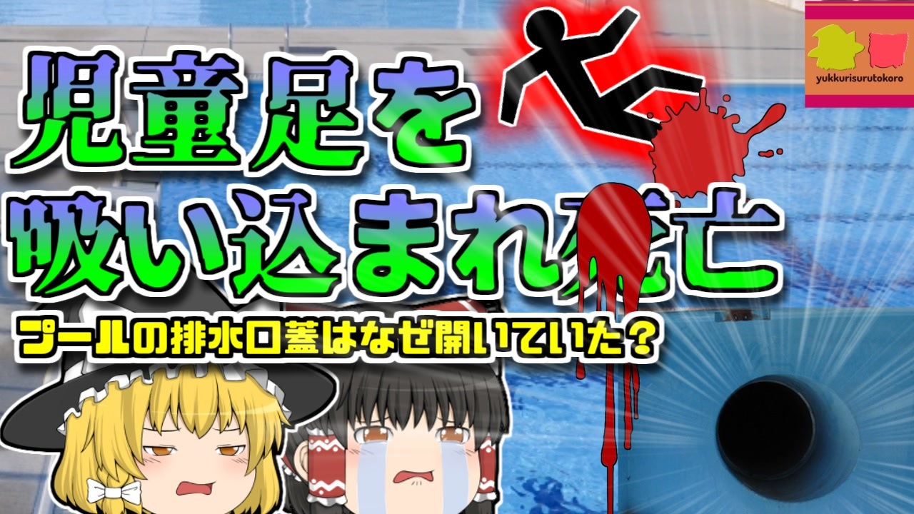 今回紹介するのは、以前からリクエストがありました「鹿児島県小学生吸い込まれ事故」です。<br>鹿児島県のとある市立小学校。<br>ここでは夏休みの間、生徒たちが量出来るプールを開放しており、この学校に通う五年生の男児「Aさん」もこのプールに遊びに来ていました。<br>彼は仲間たちあわせて5人で遊びに来ており、いつも通り夏休みのプールを満喫していました。<br>しかしその最中、彼らは水底に設置されていた、排水口の蓋が外れかかっているところを発見。<br>珍しいこの光景に、彼らは嬉々として近寄り、足の裏を吸い込ませたり、蓋をずらしたりして遊んでいました。<br>ところが、その最中に突然Aさんの右足が吸い込まれ、彼は右の太もも辺りまで、一瞬で排水口のパイプの中に吸い込まれてしまいました。<br><br>すぐに救助活動が取られましたが、後の推定では、彼は約220kgもの力で足を吸引されていたとみられ、単独はおろか、その状態で人の力によって脱出することは不可能な状態であり、救出には非常に時間がかかってしまいました。<br>その後、彼は病院に搬送されましたが、すでに絶命状態。<br><br>なぜ、このプールの排水口はあんな状態だったのでしょうか?<br><br><a href="#" class="seekTime" data-seekTime="00:00" onclick="seekNicoPlayer('#00:00'); return false;">#00:00</a> 冒頭挨拶<br><a href="#" class="seekTime" data-seekTime="00:26" onclick="seekNicoPlayer('#00:26'); return false;">#00:26</a> 視聴上の注意・免責事項<br><a href="#" class="seekTime" data-seekTime="1:11" onclick="seekNicoPlayer('#1:11'); return false;">#1:11</a> 発生地<br><a href="#" class="seekTime" data-seekTime="2:26" onclick="seekNicoPlayer('#2:26'); return false;">#2:26</a> 小学五年生の「Aさん」<br><a href="#" class="seekTime" data-seekTime="4:29" onclick="seekNicoPlayer('#4:29'); return false;">#4:29</a> 外れた蓋の下に吸い込まれ…<br><a href="#" class="seekTime" data-seekTime="5:51" onclick="seekNicoPlayer('#5:51'); return false;">#5:51</a> 固定されていなかった蓋<br><a href="#" class="seekTime" data-seekTime="7:50" onclick="seekNicoPlayer('#7:50'); return false;">#7:50</a> 過去にも吸い込まれそうになった児童がいた<br><a href="#" class="seekTime" data-seekTime="8:14" onclick="seekNicoPlayer('#8:14'); return false;">#8:14</a> その後の裁判では<br><a href="#" class="seekTime" data-seekTime="9:10" onclick="seekNicoPlayer('#9:10'); return false;">#9:10</a> 利用者側も考えなければいけない事<br><br>引用・出展・参考文献<br>鹿児島県<br><a href="https://ishort.ink/37fC" target="_blank" rel="noopener nofollow">https://ishort.ink/37fC</a><br>プールで事故を起こさないために | 【公式】JLA<br><a href="https://ishort.ink/QzbD" target="_blank" rel="noopener nofollow">https://ishort.ink/QzbD</a><br>プールに入るときの注意点 - 東京都福祉保健局<br><a href="https://ishort.ink/Qfbk" target="_blank" rel="noopener nofollow">https://ishort.ink/Qfbk</a><br>水の事故(遊泳時の注意)|講習の内容について - 日本赤十字社<br><a href="https://ishort.ink/LkiW" target="_blank" rel="noopener nofollow">https://ishort.ink/LkiW</a><br>その他視聴者提供資料など<br><br />※この動画は過去の事件を知り、現在でも同じことが発生する危険性を再認識、関与しないように促すための動画であり、視聴者を扇動、動揺を誘うためのコンテンツではありません。<br><br>ご要望にお応えして、メンバーシップの開設を行いました。<br>下記URLからも登録可能ですので、ご興味がある方は是非ご参加ください。<br><a href="https://www.youtube.com/channel/UCcT5a1J7XJW7CLYI2RKl4pw/join" target="_blank" rel="noopener nofollow">https://www.youtube.com/channel/UCcT5a1J7XJW7CLYI2RKl4pw/join</a><br><br><br>Twitter<br>→<a href="https://twitter.com/yukkurisurutoko" target="_blank" rel="noopener nofollow">https://twitter.com/yukkurisurutoko</a><br><br>取り急ぎ、簡易的にですがマイリストを作りました。<br>【ゆっくり解説】事故・事件関係紹介リスト <br><a href="https://www.nicovideo.jp/mylist/71034319" target="_blank" rel="noopener nofollow">https://www.nicovideo.jp/mylist/71034319</a><br>【ゆっくり解説】放射線系事故<br><a href="https://www.nicovideo.jp/mylist/71034368" target="_blank" rel="noopener nofollow">https://www.nicovideo.jp/mylist/71034368</a><br>【ゆっくり解説】鉄道系事故・事件関連<br><a href="https://www.nicovideo.jp/mylist/71034379" target="_blank" rel="noopener nofollow">https://www.nicovideo.jp/mylist/71034379</a>
