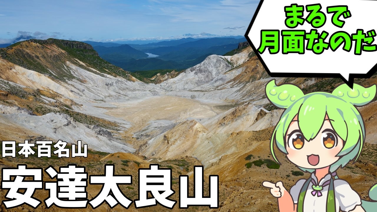(東北の山は)初投稿です。<br>東北の名峰で絶景の安達太良山をずんだもんが登ります。<br>ロープウェイなどを利用するとお手軽に山頂に行けてしまいますが、天気予報などはしっかりチェックしてください。<br><br>良ければ前回の絶景の八方池と唐松岳の動画も見てくれると嬉しいです。 <a href="https://www.nicovideo.jp/watch/sm40899802" class="watch">sm40899802</a><br>youtubeのほうが画質がいいので、綺麗なのが見たい方はこっちをぜひ。 チャンネル登録もよろしくお願いします。 <br><a href="https://www.youtube.com/channel/UC6vgfsKkiwrJF3IBX6VJAbA" target="_blank" rel="noopener nofollow">https://www.youtube.com/channel/UC6vgfsKkiwrJF3IBX6VJAbA</a> <br><br>クズん子好きなんで自分も頑張ろうとしたのですが、中の人的に生徒会役員共になってしまいました。<br>次回ずん子を使う時はもうちょっと下ネタを抑えるかも…視聴者の反応次第です。<br><br>あだたら渓谷自然遊歩道<br><a href="https://www.city.nihonmatsu.lg.jp/page/page009598.html" target="_blank" rel="noopener nofollow">https://www.city.nihonmatsu.lg.jp/page/page009598.html</a><br>あだたら高原ロープウェイ<br><a href="http://www.adatara-resort.com/green/express.stm" target="_blank" rel="noopener nofollow">http://www.adatara-resort.com/green/express.stm</a><br>くろがね小屋<br><a href="https://www.tif.ne.jp/kuroganegoya/" target="_blank" rel="noopener nofollow">https://www.tif.ne.jp/kuroganegoya/</a><br>あだたら高原スキー場<br><a href="http://www.adatara-resort.com/ski/" target="_blank" rel="noopener nofollow">http://www.adatara-resort.com/ski/</a><br>岳温泉<br><a href="https://www.dakeonsen.or.jp/" target="_blank" rel="noopener nofollow">https://www.dakeonsen.or.jp/</a><br><br>コースタイム<br>駐車場-ロープウェイ駅の周回コース 約4時間(休憩含めず<br>距離約12km<br>投稿者のコースタイム<br>駐車場-山頂 2時間20分<br>山頂-ロープウェイ駅 1時間20分<br><br>次回の山行 立山 <a href="https://www.nicovideo.jp/watch/sm41387495" class="watch">sm41387495</a><br>前回の山行 八方池と唐松岳 <a href="https://www.nicovideo.jp/watch/sm40899802" class="watch">sm40899802</a><br><br>-お借りしたもの-<br><br>VOICEVOX「ずんだもん」<br>VOICELOID2「東北ずん子」<br>VOICELOID2「琴葉茜」<br><br>立ち絵<br>坂本アヒル様<br>blueberry様<br><br>素材、BGM等<br>DOVA-SYNDROME<br>しゃろう様<br>かずち様<br><a href="https://dova-s.jp/" target="_blank" rel="noopener nofollow">https://dova-s.jp/</a><br>Safu様<br><a href="https://www.youtube.com/c/SafuWorks" target="_blank" rel="noopener nofollow">https://www.youtube.com/c/SafuWorks</a>
