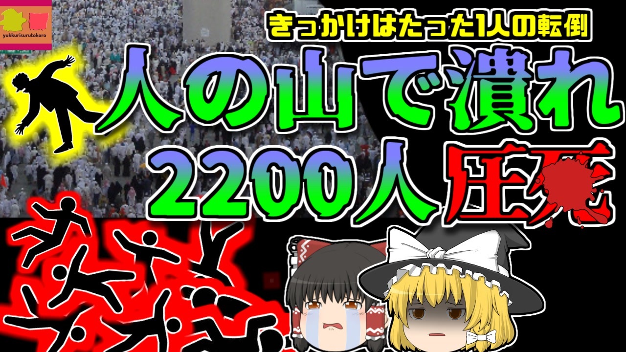 今回紹介するのは、以前からリクエストがありました「サウジアラビア大巡礼群衆雪崩」です。<br>サウジアラビア王国では、年に一度のイスラム教の大巡礼「ハッジ」というイベントが開催されており、人々は聖地である「メッカ」へ旅立ちました。<br><br>このイベントには、毎年数百万人のイスラム教徒たちが訪れ、メッカ郊外は人であふれかえっていました。<br>しかしそんな中、郊外の谷「メナー」という場所にかかる大きな橋で、押し寄せた群衆の一部が転倒し、他人の雪崩が発生してしまいました。<br>この群衆雪崩により、数千名が下敷きになって押しつぶされ、起きな圧力がかかったことにより、絶命。<br>集計では、最低でも2200名の命が失われたとされており、過去最悪の群衆転倒事故となってしまいました。<br><br><a href="#" class="seekTime" data-seekTime="00:00" onclick="seekNicoPlayer('#00:00'); return false;">#00:00</a> 冒頭挨拶<br><a href="#" class="seekTime" data-seekTime="00:34" onclick="seekNicoPlayer('#00:34'); return false;">#00:34</a> 視聴上の注意・免責事項<br><a href="#" class="seekTime" data-seekTime="1:11" onclick="seekNicoPlayer('#1:11'); return false;">#1:11</a> 現地の説明<br><a href="#" class="seekTime" data-seekTime="1:49" onclick="seekNicoPlayer('#1:49'); return false;">#1:49</a> 年に一度の大巡礼<br><a href="#" class="seekTime" data-seekTime="3:23" onclick="seekNicoPlayer('#3:23'); return false;">#3:23</a> きっかけは、たった一人の転倒<br><a href="#" class="seekTime" data-seekTime="4:21" onclick="seekNicoPlayer('#4:21'); return false;">#4:21</a> 「倒れるだけ」では済まない<br><a href="#" class="seekTime" data-seekTime="6:44" onclick="seekNicoPlayer('#6:44'); return false;">#6:44</a> 過去にも何度か発生していた<br><a href="#" class="seekTime" data-seekTime="9:21" onclick="seekNicoPlayer('#9:21'); return false;">#9:21</a> 実際の原因は急停止、転倒<br><br><br>引用・出展・参考文献<br>第1章 雑踏の脅威 - 兵庫県警察<br><a href="https://ishort.ink/EHf4" target="_blank" rel="noopener nofollow">https://ishort.ink/EHf4</a><br>Wikipedia<br><a href="https://ishort.ink/bSUa" target="_blank" rel="noopener nofollow">https://ishort.ink/bSUa</a><br><a href="https://ishort.ink/i7Bb" target="_blank" rel="noopener nofollow">https://ishort.ink/i7Bb</a><br>群集雪崩の危険性と対策は|こうち防災いちばん - NHK<br><a href="https://ishort.ink/Dt9Z" target="_blank" rel="noopener nofollow">https://ishort.ink/Dt9Z</a><br>AFP NEWS<br><a href="https://ishort.ink/sA6A" target="_blank" rel="noopener nofollow">https://ishort.ink/sA6A</a><br>「群衆雪崩」への備えと対策 - 月刊総務オンライン<br><a href="https://ishort.ink/vy9q" target="_blank" rel="noopener nofollow">https://ishort.ink/vy9q</a><br>その他視聴者提供資料など<br><br />※この動画は過去の事件を知り、現在でも同じことが発生する危険性を再認識、関与しないように促すための動画であり、視聴者を扇動、動揺を誘うためのコンテンツではありません。<br><br>ご要望にお応えして、メンバーシップの開設を行いました。<br>下記URLからも登録可能ですので、ご興味がある方は是非ご参加ください。<br><a href="https://www.youtube.com/channel/UCcT5a1J7XJW7CLYI2RKl4pw/join" target="_blank" rel="noopener nofollow">https://www.youtube.com/channel/UCcT5a1J7XJW7CLYI2RKl4pw/join</a><br><br><br>Twitter<br>→<a href="https://twitter.com/yukkurisurutoko" target="_blank" rel="noopener nofollow">https://twitter.com/yukkurisurutoko</a><br><br>取り急ぎ、簡易的にですがマイリストを作りました。<br>【ゆっくり解説】事故・事件関係紹介リスト <br><a href="https://www.nicovideo.jp/mylist/71034319" target="_blank" rel="noopener nofollow">https://www.nicovideo.jp/mylist/71034319</a><br>【ゆっくり解説】放射線系事故<br><a href="https://www.nicovideo.jp/mylist/71034368" target="_blank" rel="noopener nofollow">https://www.nicovideo.jp/mylist/71034368</a><br>【ゆっくり解説】鉄道系事故・事件関連<br><a href="https://www.nicovideo.jp/mylist/71034379" target="_blank" rel="noopener nofollow">https://www.nicovideo.jp/mylist/71034379</a>