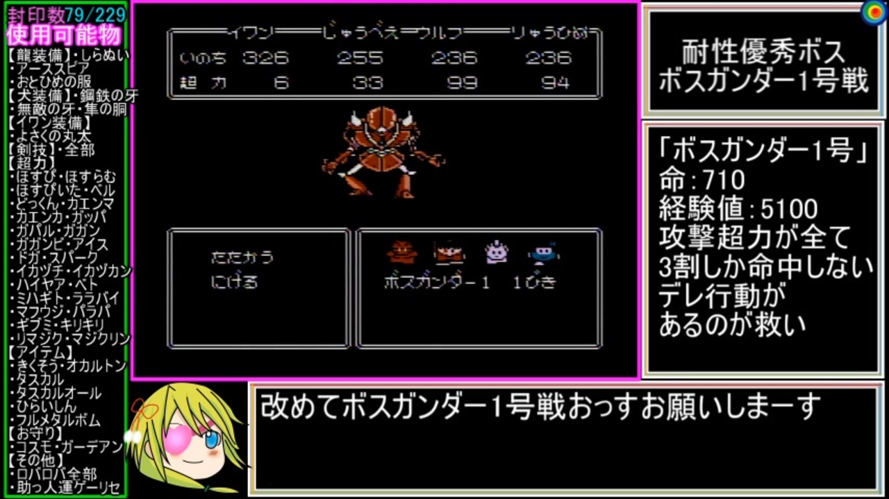 地獄への片道切符<br><br>☆縛り内容☆<br>①レベルアップごとに超力・剣技・アイテム・装備が封印(奇数レベルになったら2封印)<br>②じゅうべえウォーク可(逃走および雑魚吟味、ボス戦で負けてリセットも可)<br>③システム上回避不可事項については緩和措置あり<br>④経験値の絡んだリセット禁止(ドロップを見てからのリセット)<br>⑤編集は頑張らない(やりたいようにはやる)<br><br>☆備考(上記③の詳細含む)☆<br>・装備変更不可時に装備物が封印された場合、代わりに1封印捧げて以降の使用を可とする(任意)<br>・封印済み装備の下取り代不問<br>・封印されたロバロバの中身チェックは江戸到達時と必須戦闘時のみとする<br>・露骨な難易度破壊は禁止(げんない解禁時点で封印前に30万両錬金しておく等)<br>・連戦時は最後にまとめて封印を行う<br>・その他諸々は基本テンポ重視、面白さ重視で<br>・まだ封印されていない対象物は出来るだけ「」で表記する<br>・一部アイテム無限取得バグは禁止<br><br>part1→<a href="https://www.nicovideo.jp/watch/sm38924604" class="watch">sm38924604</a><br>前→<a href="https://www.nicovideo.jp/watch/sm40627444" class="watch">sm40627444</a><br>次→なるはや<br><br>錬金終了時間 <a href="#" class="seekTime" data-seekTime="7:41" onclick="seekNicoPlayer('#7:41'); return false;">#7:41</a>