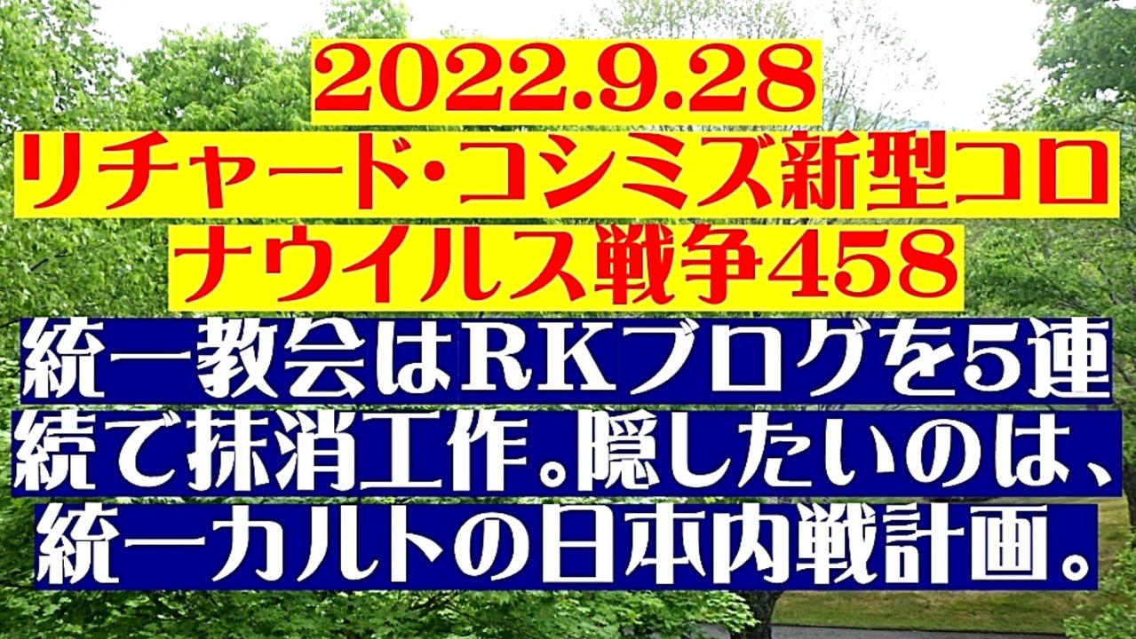 <span style="color: #cc4125;"><strong>「 テーマ:新型コロナウイルス戦争 458 」</strong></span><br><br><span style="color: #ff0000;"><strong>「『 統一教会は、リチャード・コシミズ ブログを5連続で抹消工作 』・『 隠したいのは、<br> 統一カルトの日本内戦計画 』」</strong></span><br><br>◐サンクチュアリ協会・参政党・Jアノン・ 神真都Q会は、全て、統一教会のダミー。<br> 反ワクチン「やらせ」暴動を起こして、統一教会岸田文雄政権に弾圧の口実を与える役割。<br><br>◐統一銃砲店の散弾銃・オウムの隠匿した模造銃が使われるかもしれない。<br> マスコミが「反ワクチンは全て過激派」との印象操作を図り、ワクチン忌避者の口を封じる。<br><br>◐緊急事態条項を成立させて、ワクチン接種義務化を強行する。人口9割削減を実現。<br><br>◐ビル・ゲイツ虐殺王の忠実なる奴隷国家、日本。諦めさせましょう、こんな馬鹿げた計画は。<br><br>◐リチャード・コシミズのブログは、この情報を掲載した途端に、通告なく、3日間で5回連続で<br> 抹消されています。統一教会が必死にプロバイダーに工作しています。<br><br><strong>*「フォロー」・「ニコニ広告」・「いいね!」・「情報拡散」等、ご協力下さい。 リチャード・コシミズ</strong><br><br><span style="color: #38761d;">◆</span><span style="color: #38761d;"><strong>リチャード・コシミズ 公式 ブログ</strong></span><br> <a href="https://richard-koshimizu.jimdosite.com/" target="_blank" rel="noopener nofollow">https://richard-koshimizu.jimdosite.com/</a><br><br><span style="color: #38761d;">◆</span><span style="color: #38761d;"><strong>リチャード・コシミズ 公式 ホームページ<br> </strong></span><a href="http://richardkoshimizu.boo.jp/" target="_blank" rel="noopener nofollow">http://richardkoshimizu.boo.jp/</a><br><br><span style="color: #38761d;">◆</span><span style="color: #38761d;"><strong>リチャード・コシミズ 講演会 公式 動画ギャラリー</strong></span><br> <a href="http://www.t-sskk.com/richardkoshimizu/video-gallery/index.html" target="_blank" rel="noopener nofollow">http://www.t-sskk.com/richardkoshimizu/video-gallery/index.html</a><br>