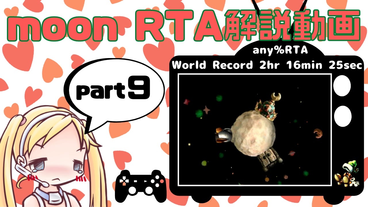 『一つの旅が終わるとき・・・<br> それは新たな旅のはじまりなんじゃよ』<br><br>moon any%RTAの解説動画だよ(*´꒳`*)<br>moon25年目を記念して10月15日夜~16日深夜にAll LoveをTwitchで走ります!<br><br>part 1 ⇒ <u><a href="https://www.nicovideo.jp/watch/sm40706890" class="watch">sm40706890</a></u><br>前 ⇒ <u><a href="https://www.nicovideo.jp/watch/sm41089595" class="watch">sm41089595</a></u><br><br>□ Twitch:毎週土曜日配信<br> <u><a href="https://www.twitch.tv/tecchan_rta" target="_blank" rel="noopener nofollow">https://www.twitch.tv/tecchan_rta</a></u><br><br>□ Twitter:動画制作の進捗状況。動画へのご意見・感想もどうぞ!<br> <u><a href="https://twitter.com/tecchan_rta" target="_blank" rel="noopener nofollow">https://twitter.com/tecchan_rta</a></u><br><br>□ YouTube:RTA記録動画<br> <u><a href="https://www.youtube.com/channel/UCSS-Yo7U7sSYx7mWnihhtLg" target="_blank" rel="noopener nofollow">https://www.youtube.com/channel/UCSS-Yo7U7sSYx7mWnihhtLg</a></u><br><br>□ Speedrun.com:世界記録<br> <u><a href="https://www.speedrun.com/user/tecchan" target="_blank" rel="noopener nofollow">https://www.speedrun.com/user/tecchan</a></u><br><br>-----------------ルール-----------------<br> <br><u>計測区間</u><br>・タイトル画面で『Game start』を選択、または空のセーブを選択した時点から<br>計測開始。<br>・ゲーム画面に『CONTINUE?』の選択肢が表示された時点で計測終了。<br> <br><u>一般的なルール</u><br>・ランは計測開始から終了を連続して録画したビデオによる証明が必要。<br>・セーブファイルのリロードは、ランの中で作成されたものであれば可能<br>(死亡またはゲームリセット後)。<br>・セーブファイルのリロードは、以下の条件のうち最低1つを満たしていること。<br>ー空のセーブを選択してランを開始する。<br>ーランの開始直前にセーブメニューを表示する。<br>ーセーブファイルがない。<br>ー再読み込みされるセーブファイル名と他のセーブファイル名と区別できる。<br> <br><u>PCでプレーする場合</u><br>・ゲームの再起動は、ゲーム内で言語を変更する操作によってのみ可能<br>(Lを押してYesを選択する)。<br>・Qを押して終了する、ゲームウィンドウを閉じるとランのリセットとみなす。<br><br>Speedrun.comより意訳<br>-------------------------------------