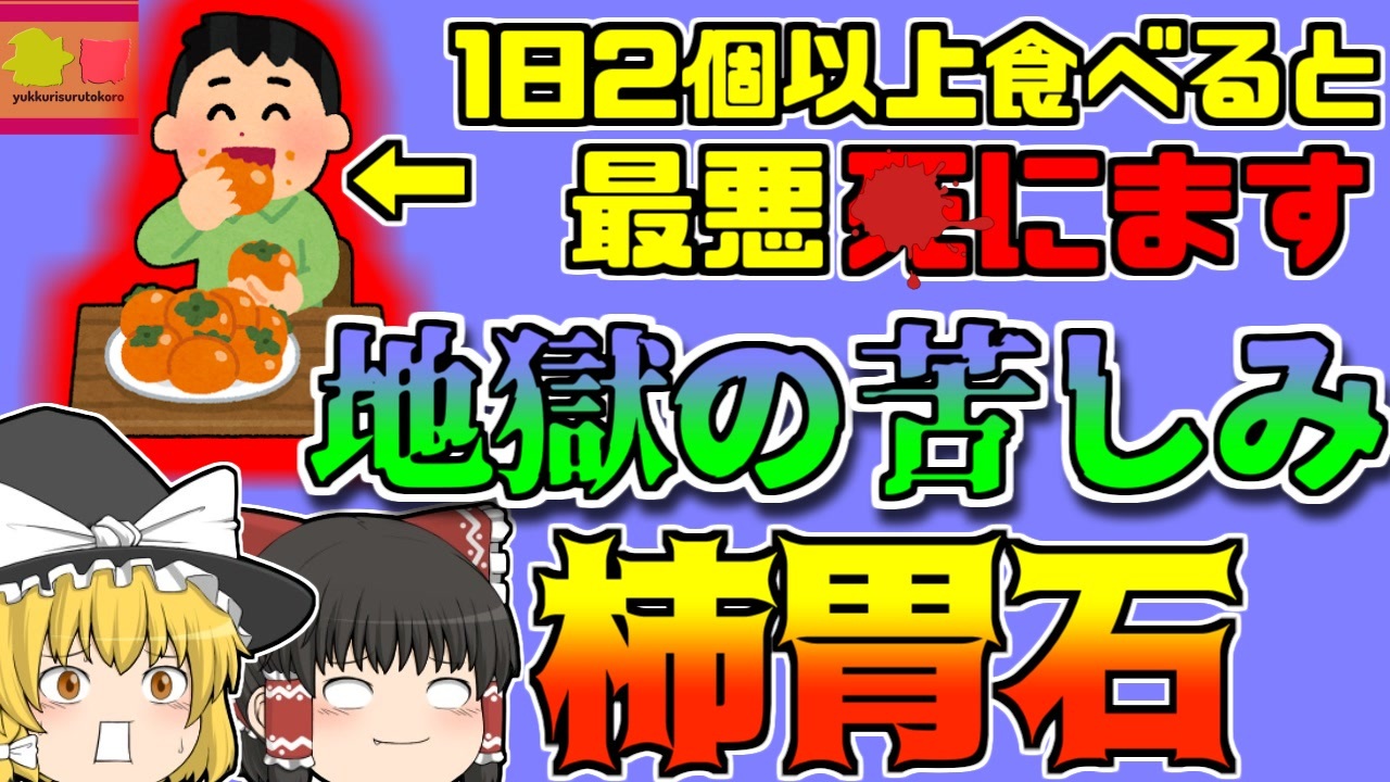 今回紹介するのは、「食中毒」に関する事例です。<br>愛媛県某所に暮らす主婦「Aさん」はこの日、突然謎の胃痛に苛まれ、病院に駆け込みました。<br>そこで詳しい検査を受けると、彼女の胃の中には、ピンポンほどの巨大な石が!<br>担当した医師はすぐにこの医師の正体に気が付きました。<br>実は彼女は、ここ最近ダイエットとして、とある秋のフルーツばかりを毎日大量に食べていました。<br>そのフルーツに含まれる成分と、胃酸が反応し、食物繊維が固まって石になってしまい、Aさんの胃を圧迫し、痛みや吐き気の症状が現れていたのです。<br><br><a href="#" class="seekTime" data-seekTime="00:00" onclick="seekNicoPlayer('#00:00'); return false;">#00:00</a> 冒頭挨拶<br><a href="#" class="seekTime" data-seekTime="00:25" onclick="seekNicoPlayer('#00:25'); return false;">#00:25</a> 視聴上の注意・免責事項<br><a href="#" class="seekTime" data-seekTime="1:09" onclick="seekNicoPlayer('#1:09'); return false;">#1:09</a> 発生地<br><a href="#" class="seekTime" data-seekTime="1:57" onclick="seekNicoPlayer('#1:57'); return false;">#1:57</a> 主婦の「Aさん」<br><a href="#" class="seekTime" data-seekTime="2:35" onclick="seekNicoPlayer('#2:35'); return false;">#2:35</a> ダイエットにフルーツ<br><a href="#" class="seekTime" data-seekTime="3:03" onclick="seekNicoPlayer('#3:03'); return false;">#3:03</a> 異変<br><a href="#" class="seekTime" data-seekTime="4:19" onclick="seekNicoPlayer('#4:19'); return false;">#4:19</a> 「柿胃石」<br><a href="#" class="seekTime" data-seekTime="5:17" onclick="seekNicoPlayer('#5:17'); return false;">#5:17</a> 毎日大量に食べていた柿<br><a href="#" class="seekTime" data-seekTime="5:56" onclick="seekNicoPlayer('#5:56'); return false;">#5:56</a> 「コーラ」<br><a href="#" class="seekTime" data-seekTime="7:35" onclick="seekNicoPlayer('#7:35'); return false;">#7:35</a> 柿<br><a href="#" class="seekTime" data-seekTime="8:09" onclick="seekNicoPlayer('#8:09'); return false;">#8:09</a> 食べすぎ注意!<br><br><br><br><br>引用・出展・参考文献<br>愛媛県<br><a href="https://ishort.ink/m6hD" target="_blank" rel="noopener nofollow">https://ishort.ink/m6hD</a><br>今治タオル<br><a href="https://ishort.ink/UAjA" target="_blank" rel="noopener nofollow">https://ishort.ink/UAjA</a><br>Wikipedia<br><a href="https://ishort.ink/Xzt2" target="_blank" rel="noopener nofollow">https://ishort.ink/Xzt2</a><br>わかさの秘密<br><a href="https://ishort.ink/VxkC" target="_blank" rel="noopener nofollow">https://ishort.ink/VxkC</a><br>あい太田クリニック柿の食べすぎに注意!<br><a href="https://ishort.ink/3YPC" target="_blank" rel="noopener nofollow">https://ishort.ink/3YPC</a><br>医療法人社団 爽治会<br><a href="https://ishort.ink/Q1KM" target="_blank" rel="noopener nofollow">https://ishort.ink/Q1KM</a><br><br><br><br><br><br>