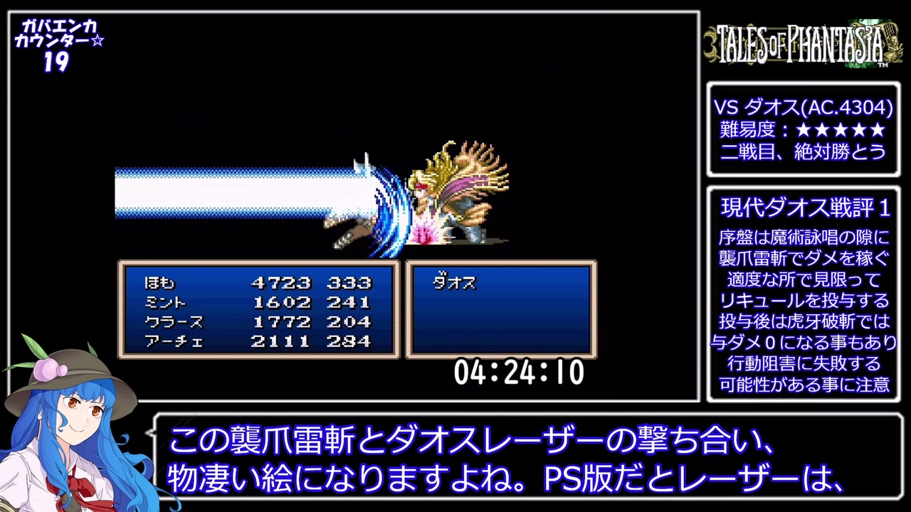 またしても遅くなって申し訳ないです。<br>その分、なかなか熱くなった現代ダオス戦をお送り致します。<br>トールの様な現代~近未来くらいの(時空転移を除く)科学技術の文明が、<br>過去の超古代文明扱いされてる設定ほんと好き。<br>ゼノギアスのゼボイム文明とか。<br><br>誤字:根性の別れ→今生の別れ ウマやり過ぎ。<br><br><br>6日から開始のクリエイターサポートですが、お受けさせていただきます。<br>YMMの商用ライセンス契約も済ませましたので、<br>ご支援いただけますと幸いです。<br>こちらも動画連載中は月2本以上をお約束出来るよう製作環境を整えます。<br>頂戴した浄財は走るソフトの購入費、編集・配信環境の整備費、<br>子育て資金等に充てさせてもらう事になるかと思います。<br>またサポーターカードに関しましては年明け位に整備する予定です。<br>現在は仮カードとなっておりますのでご了承下さい。<br><br><strong>※※がっつりネタバレ入りますので念の為ご注意ください※※</strong><br><br>トール ~ 未来世界到着まで<br>前→<a href="https://www.nicovideo.jp/watch/sm41031156" class="watch">sm41031156</a><br>次→<a href="https://www.nicovideo.jp/watch/sm41299482" class="watch">sm41299482</a><br>SFC版TOPマイリス→<a href="https://www.nicovideo.jp/mylist/72868935" target="_blank" rel="noopener">mylist/72868935</a><br><br>第一弾:蓬莱学.園の冒険!RTA→<a href="https://www.nicovideo.jp/mylist/69522553" target="_blank" rel="noopener">mylist/69522553</a><br>第二弾:FC版銀.河英雄伝説RTA→<a href="https://www.nicovideo.jp/mylist/70918118" target="_blank" rel="noopener">mylist/70918118</a><br>第三弾:G-ARMS_オペレーションガ.ンダムRTA→<a href="https://www.nicovideo.jp/watch/sm39842469" class="watch">sm39842469</a><br>11年前のe.lona動画→<a href="https://www.nicovideo.jp/mylist/19210992" target="_blank" rel="noopener">mylist/19210992</a>