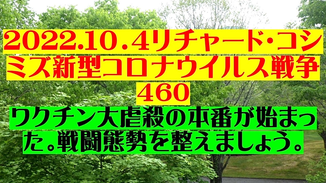 <span style="color: #cc4125;"><strong>「 テーマ:新型コロナウイルス戦争 460 」</strong></span><br><br><span style="color: #ff0000;"><strong>「『 ワクチン大虐殺の本番 』が始まった!『 戦闘態勢 』を整えましょう! 」</strong></span><br><br>◐国民を「ワクチン接種」に慣れさせ、恐怖心・猜疑心を取り除くため、最初の2回は<br> 「プラセボか薄いワクチン」を打った。<br> ワクチン接種者は、まんまと騙され、「ワクチンは安全だ」と信じ込んだ。<br> 3回目からが本物で、4回目以降は危険(ワクチンの粗製乱造)。<br><br>◐死者の体から「血栓」が見つかる。「血栓症」での死者が多発する。車、航空機の運転者も。<br><br>◐「ワクチン免疫不全症」で、「梅毒」激増。<br><br>◐韓国で、過去39年間で最大の死者数。<br><br>◐「オミクロン対応二価ワクチン・インフルエンザワクチン同時接種」から、<br> 「死者・寝たきり激増」と思われる。<br><br>◐「インフルエンザワクチン」にも、「mRNAワクチンを投入」しようとしている。<br> ダブルmRNA攻撃。劇症化。<br><br>◐「5~11才の子供のワクチン接種」は、「将来の出生率の劇的な低減に繋がる人口削減策」<br><br><strong>*「フォロー」・「ニコニ広告」・「いいね!」・「情報拡散」等、ご協力下さい。 リチャード・コシミズ</strong><br><br><span style="color: #38761d;">◆</span><span style="color: #38761d;"><strong>リチャード・コシミズ 公式 ブログ</strong></span><br> <a href="https://richard-koshimizu.jimdosite.com/" target="_blank" rel="noopener nofollow">https://richard-koshimizu.jimdosite.com/</a><br><br><span style="color: #38761d;">◆</span><span style="color: #38761d;"><strong>リチャード・コシミズ 公式 ホームページ<br> </strong></span><a href="http://richardkoshimizu.boo.jp/" target="_blank" rel="noopener nofollow">http://richardkoshimizu.boo.jp/</a><br><br><span style="color: #38761d;">◆</span><span style="color: #38761d;"><strong>リチャード・コシミズ 講演会 公式 動画ギャラリー</strong></span><br> <a href="http://www.t-sskk.com/richardkoshimizu/video-gallery/index.html" target="_blank" rel="noopener nofollow">http://www.t-sskk.com/richardkoshimizu/video-gallery/index.html</a><br>
