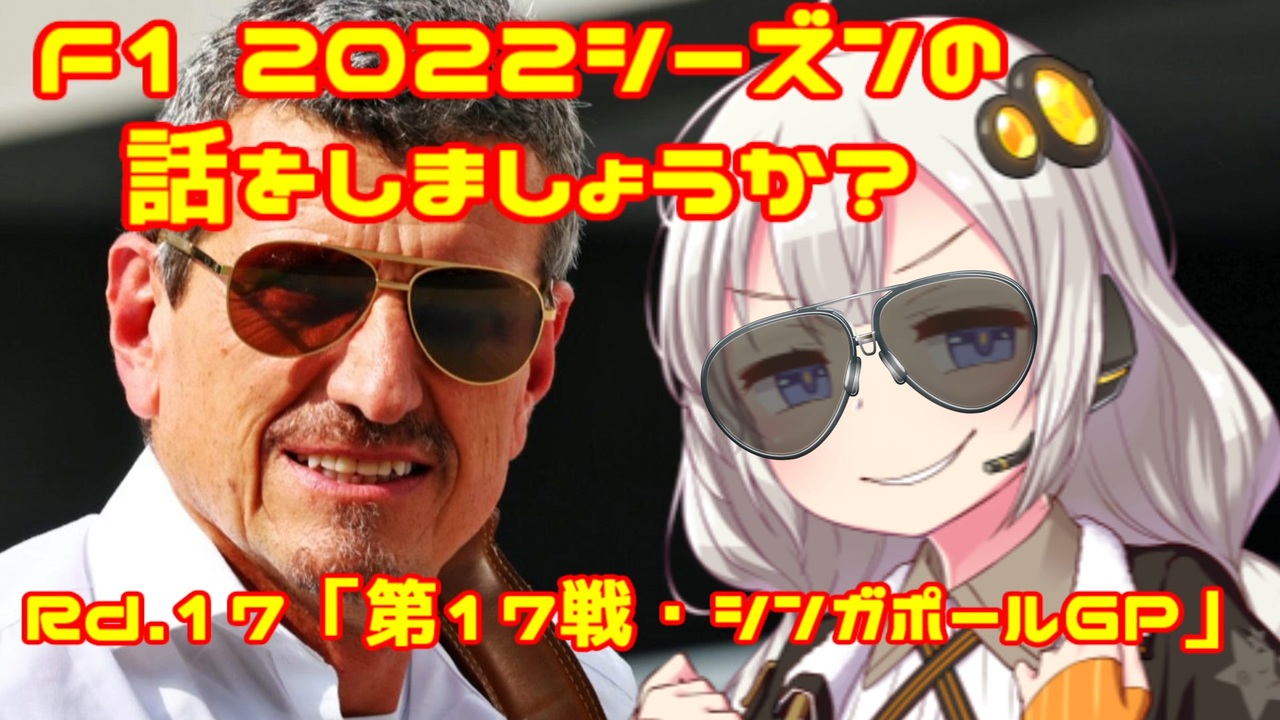 「ギュンターが如く」by紲星あかり<br><br><br>おはこんばんちは、紲星あかりです。<br>この動画は、F1 2022年シーズンをダイジェストでお送りしています。<br>今回は第17戦・シンガポールGPをお送りします。<br>前回のGPでレッドブルのフェルスタッペンが5連勝を記録し<br>ついにチャンピオン連覇に王手!優勝が絶対条件の<br>今回のレースで王座獲得の瞬間が訪れるのでしょうか?<br><br><br><span style="color: red;">(ご注意)この動画の情報は真実とは限りません。また、誤字・脱字が含まれる場合があります。ご了承ください。</span><br><br><br>前→第16戦・イタリアGP <a href="https://www.nicovideo.jp/watch/sm41081101" class="watch">sm41081101</a><br>次→第18戦・日本GP <a href="https://www.nicovideo.jp/watch/sm41221965" class="watch">sm41221965</a><br><br> <br>F12022シーズンの話をしましょうか?マイリスト→<a href="https://www.nicovideo.jp/mylist/72892585" target="_blank" rel="noopener">mylist/72892585</a><br><br>うp主のF1動画シリーズ<br>F12021シーズンの話をしましょうか?マイリスト→<a href="https://www.nicovideo.jp/mylist/70735663" target="_blank" rel="noopener">mylist/70735663</a><br>F12020シーズンの話をしましょうか?マイリスト→<a href="https://www.nicovideo.jp/mylist/67651731" target="_blank" rel="noopener">mylist/67651731</a> <br><span style="color: #000000; font-size: 14px;">F12019シーズンの話をしましょうか?マイリスト</span><span style="color: #000000; font-size: 13px;">→</span><a href="https://www.nicovideo.jp/mylist/64678414" target="_blank" rel="noopener">mylist/64678414</a><br><span style="color: #000000; font-size: 14px;">F12018シーズンの話をしましょうか?マイリスト</span><span style="color: #000000; font-size: 13px;">→</span><a href="https://www.nicovideo.jp/mylist/61514606" target="_blank" rel="noopener">mylist/61514606</a><br>F1の話をしましょうか?マイリスト→<a href="https://www.nicovideo.jp/mylist/40499353" target="_blank" rel="noopener">mylist/40499353</a><br>F1の話をしましょうか?OPフルバージョン→<a href="https://www.nicovideo.jp/mylist/59030210" target="_blank" rel="noopener">mylist/59030210</a><br>F1 CM集→<a href="https://www.nicovideo.jp/mylist/57297507" target="_blank" rel="noopener">mylist/57297507</a><br><br>