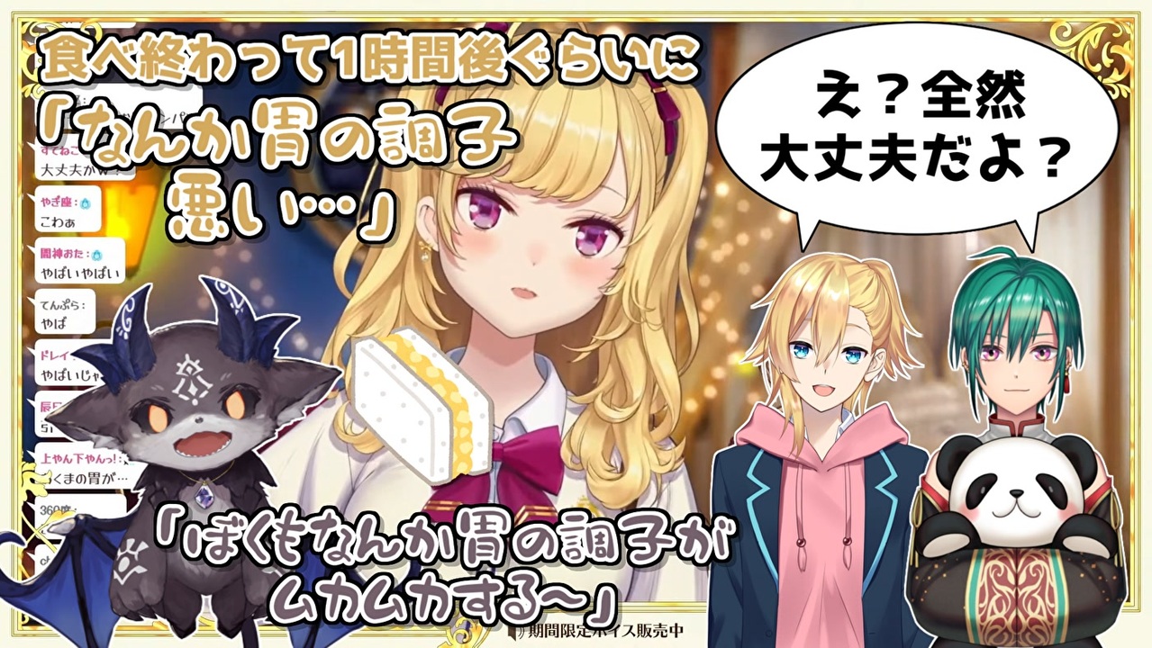 果たして二人のサンドイッチだけが傷んでたのか<br>それとも特別二人の胃腸が弱かったのか…<br>わかるのはでびリオンてぇてぇということ<br><br>本家参考動画<br>・鷹宮リオン<br>にじフェス振り返り、裏話、お疲れ配信【にじさんじ/鷹宮リオン】<br><a href="https://youtu.be/OUsuBH_EKWw" target="_blank" rel="noopener nofollow">https://youtu.be/OUsuBH_EKWw</a><br>・でびでび・でびる<br>フェスおわった!【でびでび・でびる/にじさんじ】<br><a href="https://youtu.be/UhJq8M-zl1E" target="_blank" rel="noopener nofollow">https://youtu.be/UhJq8M-zl1E</a><br><br>参考元チャンネル&Twitter<br>・鷹宮リオン<br><a href="https://www.youtube.com/channel/UCV5ZZlLjk5MKGg3L0n0vbzw" target="_blank" rel="noopener nofollow">https://www.youtube.com/channel/UCV5ZZlLjk5MKGg3L0n0vbzw</a><br><a href="https://twitter.com/TakamiyaRion" target="_blank" rel="noopener nofollow">https://twitter.com/TakamiyaRion</a><br>・でびでび・でびる<br><a href="https://www.youtube.com/channel/UCjlmCrq4TP1I4xguOtJ-31w" target="_blank" rel="noopener nofollow">https://www.youtube.com/channel/UCjlmCrq4TP1I4xguOtJ-31w</a><br><a href="https://twitter.com/debidebiru_sama" target="_blank" rel="noopener nofollow">https://twitter.com/debidebiru_sama</a><br><br>ニコニコのダイコンマンリスト<br>「バーチャルYouTuberシリーズ」↓<br><a href="https://www.nicovideo.jp/mylist/62551838" target="_blank" rel="noopener">mylist/62551838</a><br>「バーチャルYouTuberシリーズ2」↓<br><a href="https://www.nicovideo.jp/mylist/67858437" target="_blank" rel="noopener">mylist/67858437</a><br>「バーチャルYouTuberシリーズ3」↓<br><a href="https://www.nicovideo.jp/mylist/71340675" target="_blank" rel="noopener">mylist/71340675</a><br><br>ダイコンマンのTwitter<br><a href="https://twitter.com/Daikon_Man_V" target="_blank" rel="noopener nofollow">https://twitter.com/Daikon_Man_V</a>