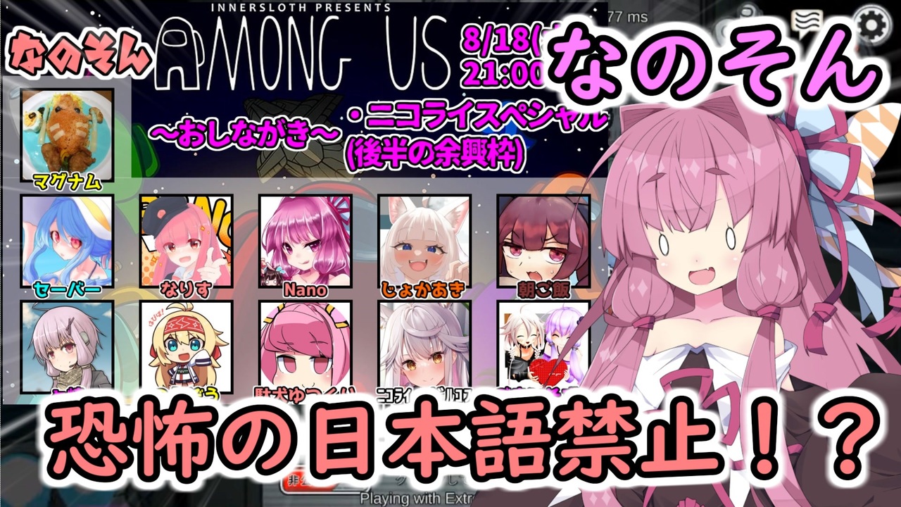 今回は8月18日のなのそん11人回より<br>ニコライさんの提案した日本語禁止の回を動画にしました!<br>終始笑いっぱなしな回だったので少しでも楽しんで頂けたら幸いです!<br>リスニング頑張った・・・<br><br><span style="font-size: 24px;"><strong>ニコニコクリエイターサポート受付開始しました!<br>もし良ければ登録お願い致します!!!</strong></span><br><br>クリエイターサポート機能詳細<br><a href="https://site.nicovideo.jp/creator-support/?ref=cspt-tool" target="_blank" rel="noopener nofollow">https://site.nicovideo.jp/creator-support/?ref=cspt-tool</a><br><br><br>前回:<a href="https://www.nicovideo.jp/watch/sm41116676" class="watch">sm41116676</a> <a href="https://www.nicovideo.jp/mylist/71167166" target="_blank" rel="noopener">mylist/71167166</a> 次回:<a href="https://www.nicovideo.jp/watch/sm41225264" class="watch">sm41225264</a><br><br><br><お借りしたBGM><br>MusMus:<a href="https://musmus.main.jp/" target="_blank" rel="noopener nofollow">https://musmus.main.jp/</a><br>MusicMaterial:<a href="http://musicmaterial.jpn.org/" target="_blank" rel="noopener nofollow">http://musicmaterial.jpn.org/</a><br><br><br><配信アーカイブ(生声注意)><br>8/18 <a href="https://www.youtube.com/watch?v=gaNqFD22K4Y" target="_blank" rel="noopener nofollow">https://www.youtube.com/watch?v=gaNqFD22K4Y</a><br><br><br><Twitter><br><a href="https://twitter.com/Nano_madder" target="_blank" rel="noopener nofollow">https://twitter.com/Nano_madder</a><br><br><YouTube><br><a href="https://www.youtube.com/channel/UCThE793GI6tJd6pXNahQVag" target="_blank" rel="noopener nofollow">https://www.youtube.com/channel/UCThE793GI6tJd6pXNahQVag</a>
