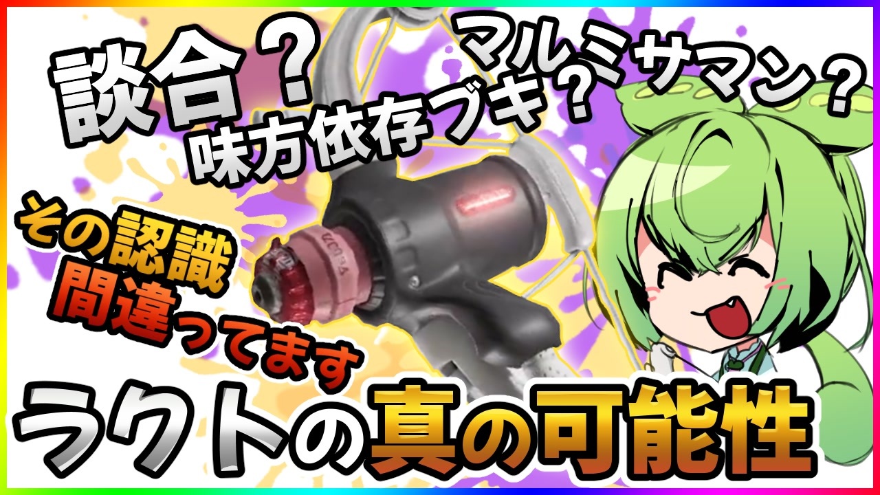 次回 → <a href="https://www.nicovideo.jp/watch/sm41240501" class="watch">sm41240501</a><br><br>ラクトかわいいし強いし面白いしで最高のブキだな~と思ってたら<br>ラクト談合だのマルミサマンだのロッカー無限回転だの<br>世間の評価がしょうもなかったのでボイロ動画初投稿です(本当)<br><br>きりたんはインターネットに毒されてるだけで悪い子ではないです(?)<br><br>ブキ:LACT-450<br>ギア:クマノミミとイカニンジャがかわいいから着けてます<br>ラクティング:我流<br><br>Twitter:<a href="https://twitter.com/hisukettoon" target="_blank" rel="noopener nofollow">https://twitter.com/hisukettoon</a><br>※よく生配信してます<br><br>立ち絵:自作<br>出演:VOICEVOXずんだもん/VOICEROID+ 東北きりたん<br>効果音:効果音ラボ<br>動画編集:YMM4<br>