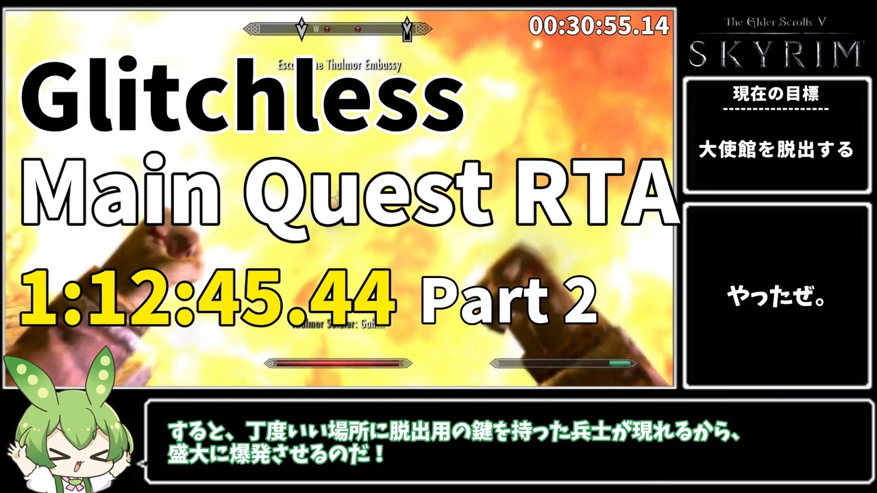 <span style="color: #ff9900; font-size: 24px;"><strong>再走してWRを出しました</strong></span><br><span style="font-size: 18px;"><strong><a href="https://www.nicovideo.jp/watch/sm41382851" class="watch">sm41382851</a> (RTA1:11:15.164 / IGT1:08:25.813)</strong></span><br><br><br><span style="color: #ff0000; font-size: 18px;"><strong><s>正式な記録ではないことがわかった為、再走&再投稿します。</s></strong></span><br><s>Speedrun comに記載されているガイドを再確認したところ、Text Glitchというグリッチに該当するものが本RTAに発生していました。<br>ゲーム起動後、約3時間が経過すると発生してしまうグリッチのようです。<br>また、Part4で二刀流時に2連続でパワーアタックを出せるということ説明したのですが、コミュニティ内で今一度この現象について確認していただきまして、Infinite Power Attackというグリッチに当たるとのことです。動画内では無限にパワーアタックを行っていませんが、仕組みは同様なのだと思われます。<br>この不手際は、私がルールの確認を怠ったことが招いたことです。動画を楽しみにしていただいた方々には大変申し訳ございません。<br>また、Speedrun comに申請した自己ベストは自主的に取り下げ、この動画も一時非公開としましたが、お詫びの動画に"解説動画は残しておいてもよい"という温かいコメントをいただいたので、この動画は「参考記録」として残させていただいております。<br>お詫びとText Glitchについての詳細は<a href="https://www.nicovideo.jp/watch/sm41246845" class="watch">sm41246845</a>をご覧ください。</s><br><br>最初から(Part 1): <a href="https://www.nicovideo.jp/watch/sm41170581" class="watch">sm41170581</a><br><br>次回(Part 3): <a href="https://www.nicovideo.jp/watch/sm41218332" class="watch">sm41218332</a><br><br>沢山の兄貴たちの動画を参考にして動画を作成させていただいております。<br>特にこのカテゴリーの日本人先駆者である、シャキタ&S.O.ドドド兄貴を参考にしています。<br>この場を借りてお礼申し上げます。ありがとうございます。<br>【ずんだもんの立ち絵】のんたお(<a href="https://www.nicovideo.jp/user/121937664" target="_blank" rel="noopener">user/121937664</a>)様よりお借りしました。<br>【音声ソフトウェア】VOICEVOX:ずんだもん