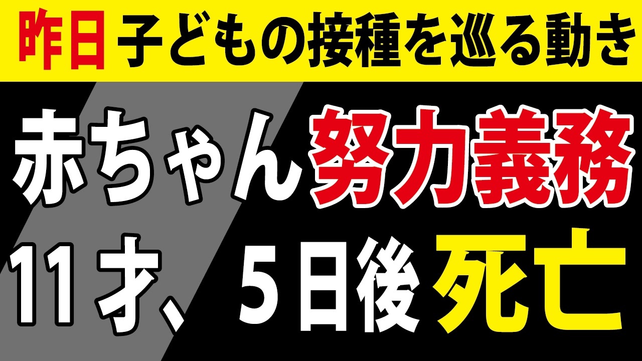 ❑6カ月~4才に関する資料<br><a href="https://www.mhlw.go.jp/content/10900000/000999226.pdf" target="_blank" rel="noopener nofollow">https://www.mhlw.go.jp/content/10900000/000999226.pdf</a><br><br><br>❑11才の事例の資料 No.2<br><a href="https://www.mhlw.go.jp/content/10601000/000998633.pdf" target="_blank" rel="noopener nofollow">https://www.mhlw.go.jp/content/10601000/000998633.pdf</a><br><br><br>―――――――――――――――――――――――――――――――<br><br>❑新しい動画サイト「真の日本人増加計画」始めました!<br><a href="https://nicochannel.jp/fujie/" target="_blank" rel="noopener nofollow">https://nicochannel.jp/fujie/</a><br>(ニコニコチャンネル+)<br><br><br>❏藤江の活動を支援していただける方向け<br>【藤江支援口座】のご案内<br>住信SBIネット銀行 ミカン支店(店番号103)<br>口座番号 3107694<br>口座名義 フジエ マサミツ<br><br>――――――――――――――――――――――――――――――<br><br>日本の人口増加を目指す男、藤江です!【メインチャンネル】<br><a href="https://www.youtube.com/c/JINKOUZOUKA/" target="_blank" rel="noopener nofollow">https://www.youtube.com/c/JINKOUZOUKA/</a><br><br>地域と日本の存続のためニ!【藤江2ndチャンネル】<br><a href="https://www.youtube.com/channel/UCfBh4rv5UT7D-qR6KsoZrsA" target="_blank" rel="noopener nofollow">https://www.youtube.com/channel/UCfBh4rv5UT7D-qR6KsoZrsA</a><br><br>今こそ!三千年の底力【藤江3rdチャンネル】<br><a href="https://www.youtube.com/channel/UC5Yrsm8-X8nZj4uKgvE7CBw" target="_blank" rel="noopener nofollow">https://www.youtube.com/channel/UC5Yrsm8-X8nZj4uKgvE7CBw</a><br><br>四海兄弟【藤江4thチャンネル】<br><a href="https://www.youtube.com/channel/UCiyJNO57quj80Ysy7nOABvA" target="_blank" rel="noopener nofollow">https://www.youtube.com/channel/UCiyJNO57quj80Ysy7nOABvA</a><br><br>五穀豊穣【藤江5thチャンネル】<br><a href="https://www.youtube.com/channel/UCptMJCoKYghfew5tDzoEqHQ" target="_blank" rel="noopener nofollow">https://www.youtube.com/channel/UCptMJCoKYghfew5tDzoEqHQ</a><br><br>藤江のTwitter<br><a href="https://twitter.com/JINKOUZOUKA_jp" target="_blank" rel="noopener nofollow">https://twitter.com/JINKOUZOUKA_jp</a><br><br>藤江のニコニコ動画<br><a href="https://www.nicovideo.jp/user/5457748" target="_blank" rel="noopener nofollow">https://www.nicovideo.jp/user/5457748</a>