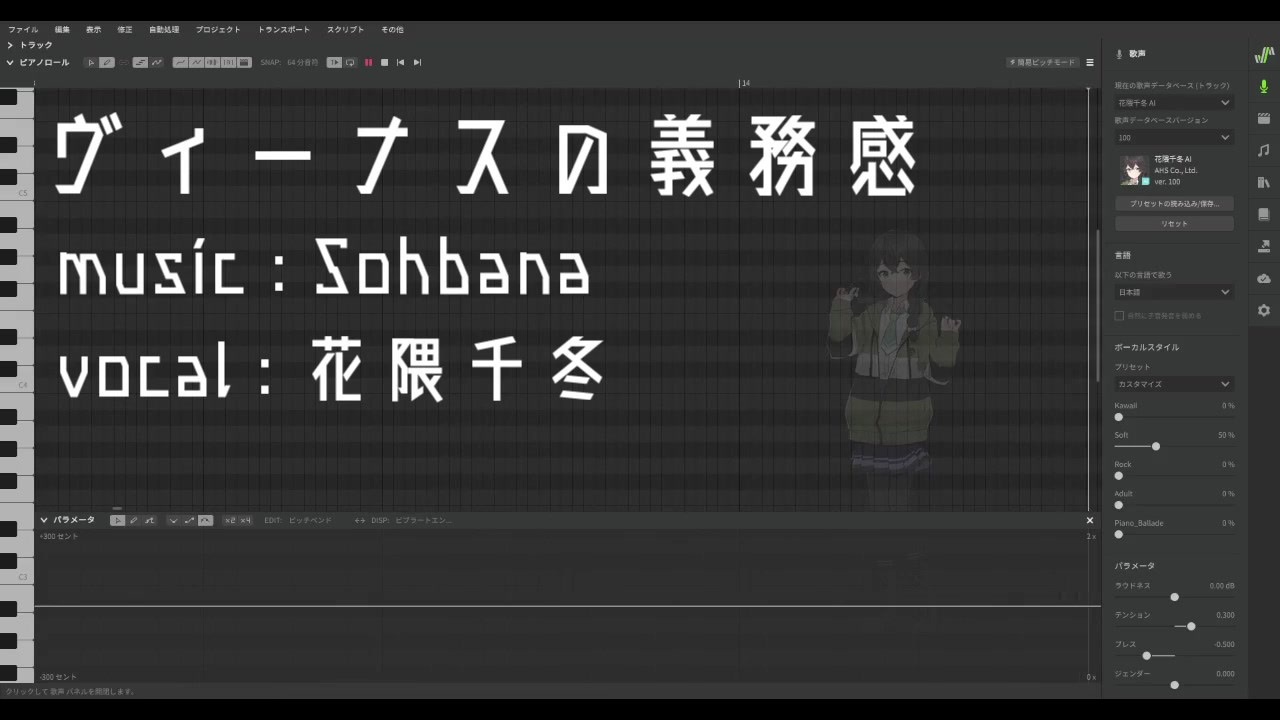 ハチナナです。<br>花隈千冬(SynthV)でSohbanaさんのヴィーナスの義務感をカバーさせていただきました!<br><br>本家様→<a href="https://www.nicovideo.jp/watch/sm37346134" class="watch">sm37346134</a><br><br>調声:ハチナナ(@SevgasakiEight)<br>ust:ピフ優 様(<a href="https://www.nicovideo.jp/watch/sm41121449" class="watch">sm41121449</a>)<br><br>花隈千冬一斉投稿<br>ヒロイン育成計画(<a href="https://www.nicovideo.jp/watch/sm41250325" class="watch">sm41250325</a>)<br>ヴァンパイア / 夏色花梨&花隈千冬&小春六花(<a href="https://www.nicovideo.jp/watch/sm41249256" class="watch">sm41249256</a>)<br>アニマル / 小春六花&夏色花梨&花隈千冬(<a href="https://www.nicovideo.jp/watch/sm41249259" class="watch">sm41249259</a>)<br>シンデレラ / 花隈千冬&小春六花&夏色花梨(<a href="https://www.nicovideo.jp/watch/sm41249257" class="watch">sm41249257</a>)<br>唯々なりレイデエ(<a href="https://www.nicovideo.jp/watch/sm41235467" class="watch">sm41235467</a>)<br>Notebook(<a href="https://www.nicovideo.jp/watch/sm41239871" class="watch">sm41239871</a>)<br>メリュー(<a href="https://www.nicovideo.jp/watch/sm41245625" class="watch">sm41245625</a>)<br>ジェヘナ(<a href="https://www.nicovideo.jp/watch/sm41253195" class="watch">sm41253195</a>)<br><br>他の投稿動画 → <a href="https://www.nicovideo.jp/mylist/38415447" target="_blank" rel="noopener">mylist/38415447</a><br /><br>-----------------<br>ボーカルを派遣します。オリジナル曲等を歌わせてみませんか?<br>調声依頼について → hachinana-tuning.amebaownd.com<br>