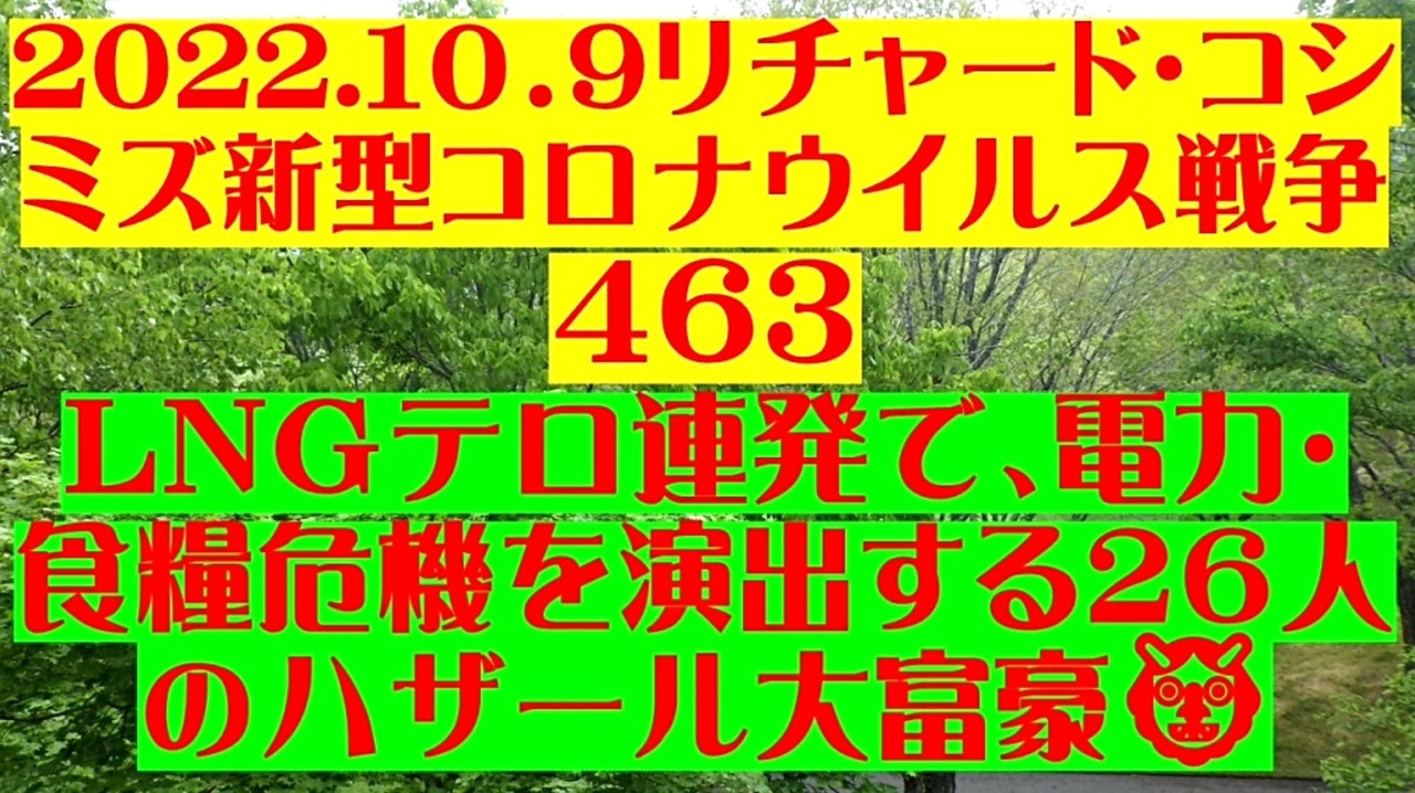 <span style="color: #cc4125;"><strong>「 テーマ:新型コロナウイルス戦争 463 」</strong></span><br><br><span style="color: #ff0000;"><strong>「『 天然ガスパイプラインテロ連発 』で、『 電力・食糧危機を演出する26人のハザール大富豪 』<br> は許さない! 」</strong></span><br><br>【天然ガス戦争】<br><br> ◐「ウクライナ戦争」の影響で、「ロシア産LNG供給」が不安定に。<br><br> ◐ノルドストリーム爆破!<br><br> ◐米国ガス生産施設破壊!<br><br> ◐マレーシア天然ガスパイプライン破壊!<br><br> ◐日本は、世界最大のLNG依存国家。<br><br> ◐発電危機。電力料金の高騰。製造業のコストUP・家庭の生計にダメージ。社会不安。<br><br> ◐肥料生産の世界的減衰・価格高騰・農業生産の世界的停滞・食糧危機。<br><br><strong>*「フォロー」・「ニコニ広告」・「いいね!」・「情報拡散」等、ご協力下さい。 リチャード・コシミズ</strong><br><br><span style="color: #38761d;">◆</span><span style="color: #38761d;"><strong>リチャード・コシミズ 公式 ブログ</strong></span><br> <a href="https://richard-koshimizu.jimdosite.com/" target="_blank" rel="noopener nofollow">https://richard-koshimizu.jimdosite.com/</a><br><br><span style="color: #38761d;">◆</span><span style="color: #38761d;"><strong>リチャード・コシミズ 公式 ホームページ<br> </strong></span><a href="http://richardkoshimizu.boo.jp/" target="_blank" rel="noopener nofollow">http://richardkoshimizu.boo.jp/</a><br><br><span style="color: #38761d;">◆</span><span style="color: #38761d;"><strong>リチャード・コシミズ 講演会 公式 動画ギャラリー</strong></span><br> <a href="http://www.t-sskk.com/richardkoshimizu/video-gallery/index.html" target="_blank" rel="noopener nofollow">http://www.t-sskk.com/richardkoshimizu/video-gallery/index.html</a><br>