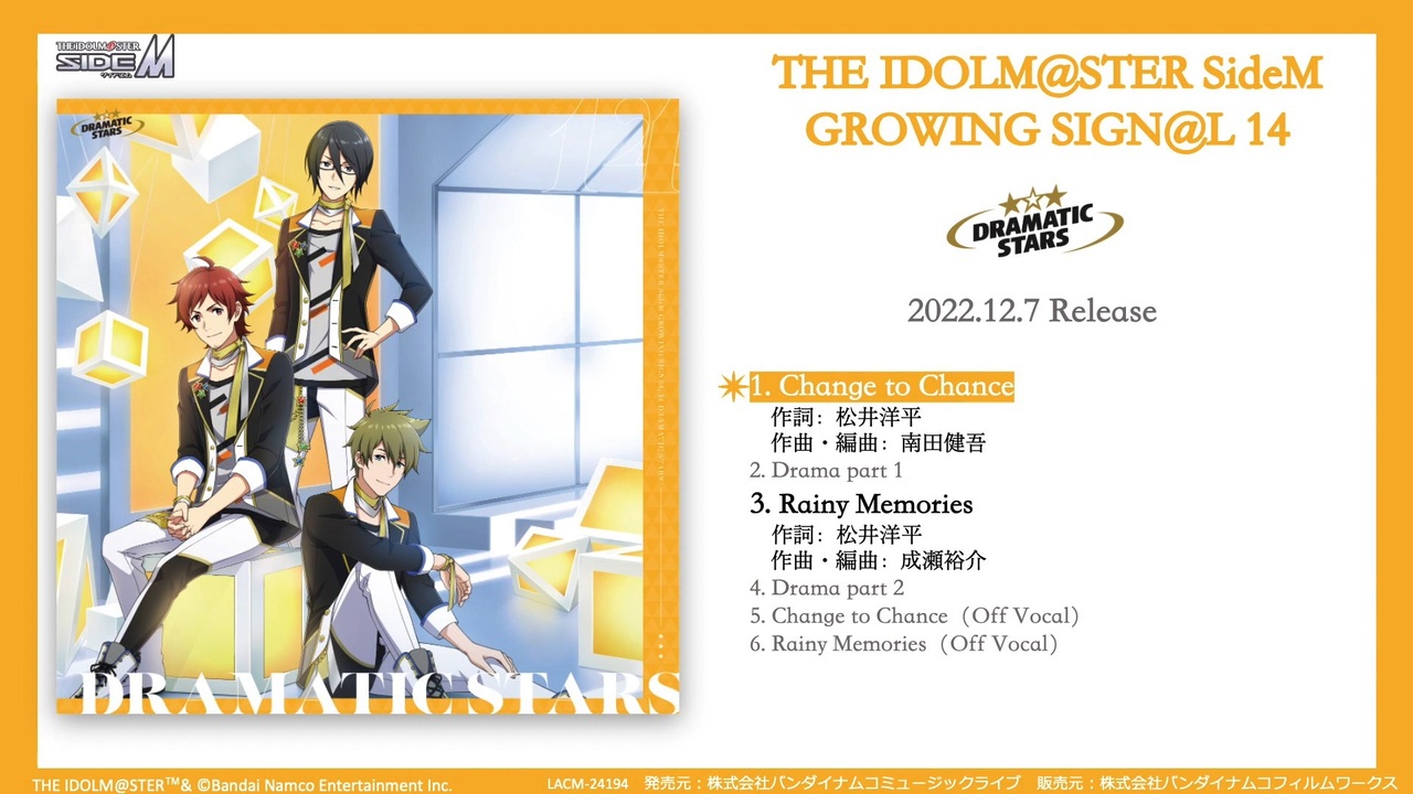 2022.12.7 RELEASE!<br>THE IDOLM@STER SideM GROWING SIGN@L 14 DRAMATIC STARS<br>歌:DRAMATIC STARS [天道 輝(CV.仲村宗悟), 桜庭 薫(CV.内田雄馬), 柏木 翼(CV.八代 拓)]<br>販売価格:¥1,980(10%税込)/¥1,800(税抜)<br>品番:LACM-24194<br>発売元:株式会社バンダイナムコミュージックライブ <br>販売元:株式会社バンダイナムコフィルムワークス<br><br>★「Change to Chance」は10/10より先行配信開始!<br>配信サイトはこちら:<a href="https://lnk.to/LZC-2272" target="_blank" rel="noopener nofollow">https://lnk.to/LZC-2272</a><br><br>★Index<br>01. Change to Chance<br> 作詞:松井洋平<br> 作曲・編曲:南田健吾<br><br>02. Drama part 1<br>03. Rainy Memories<br> 作詞:松井洋平<br> 作曲・編曲:成瀬裕介<br><br>04. Drama part 2<br>05. Change to Chance(Off Vocal)<br>06. Rainy Memories(Off Vocal)<br><br>THE IDOLM@STER™& ©Bandai Namco Entertainment Inc.