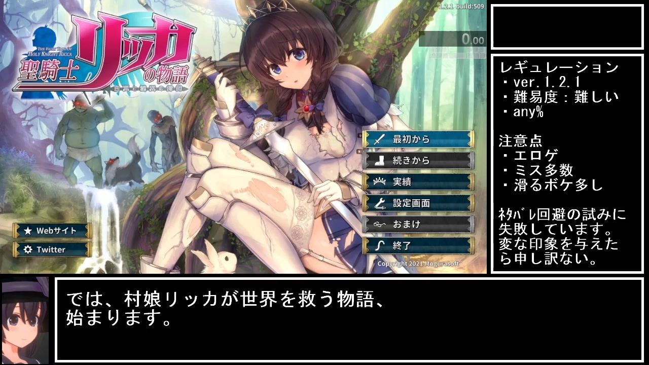 自己満足で解説動画を作ってみました。(初)<br>避けたつもりだけど、他の方と同じような解説やネタが含まれます。<br>解説動画を作るのは難しいですね。<br><br>レギュレーション<br>バージョン:v1.2.1<br>難易度:難しい<br>any%<br>計測開始:『最初から』の選択<br>計測終了:第23話の『CLEARED!』が表示<br><br><a href="#" class="seekTime" data-seekTime="00:00" onclick="seekNicoPlayer('#00:00'); return false;">#00:00</a> Title<br><a href="#" class="seekTime" data-seekTime="00:40" onclick="seekNicoPlayer('#00:40'); return false;">#00:40</a> 第01話<br><a href="#" class="seekTime" data-seekTime="05:40" onclick="seekNicoPlayer('#05:40'); return false;">#05:40</a> 第02話<br><a href="#" class="seekTime" data-seekTime="07:52" onclick="seekNicoPlayer('#07:52'); return false;">#07:52</a> 第03話<br><a href="#" class="seekTime" data-seekTime="09:34" onclick="seekNicoPlayer('#09:34'); return false;">#09:34</a> 第04話<br><a href="#" class="seekTime" data-seekTime="11:26" onclick="seekNicoPlayer('#11:26'); return false;">#11:26</a> 第05話<br><a href="#" class="seekTime" data-seekTime="15:05" onclick="seekNicoPlayer('#15:05'); return false;">#15:05</a> 第06話<br><a href="#" class="seekTime" data-seekTime="18:55" onclick="seekNicoPlayer('#18:55'); return false;">#18:55</a> 第07話<br><a href="#" class="seekTime" data-seekTime="21:59" onclick="seekNicoPlayer('#21:59'); return false;">#21:59</a> 第08話<br><a href="#" class="seekTime" data-seekTime="25:50" onclick="seekNicoPlayer('#25:50'); return false;">#25:50</a> 第09話<br><a href="#" class="seekTime" data-seekTime="28:07" onclick="seekNicoPlayer('#28:07'); return false;">#28:07</a> 第10話<br><a href="#" class="seekTime" data-seekTime="31:55" onclick="seekNicoPlayer('#31:55'); return false;">#31:55</a> 第11話<br><a href="#" class="seekTime" data-seekTime="37:06" onclick="seekNicoPlayer('#37:06'); return false;">#37:06</a> 第12話<br><a href="#" class="seekTime" data-seekTime="44:02" onclick="seekNicoPlayer('#44:02'); return false;">#44:02</a> 第13話<br><a href="#" class="seekTime" data-seekTime="47:24" onclick="seekNicoPlayer('#47:24'); return false;">#47:24</a> 第14話<br><a href="#" class="seekTime" data-seekTime="50:08" onclick="seekNicoPlayer('#50:08'); return false;">#50:08</a> 第15話<br><a href="#" class="seekTime" data-seekTime="55:41" onclick="seekNicoPlayer('#55:41'); return false;">#55:41</a> 第16話<br><a href="#" class="seekTime" data-seekTime="60:26" onclick="seekNicoPlayer('#60:26'); return false;">#60:26</a> 第17話<br><a href="#" class="seekTime" data-seekTime="65:53" onclick="seekNicoPlayer('#65:53'); return false;">#65:53</a> 第18話<br><a href="#" class="seekTime" data-seekTime="72:54" onclick="seekNicoPlayer('#72:54'); return false;">#72:54</a> 第19話<br><a href="#" class="seekTime" data-seekTime="76:52" onclick="seekNicoPlayer('#76:52'); return false;">#76:52</a> 第20話<br><a href="#" class="seekTime" data-seekTime="81:23" onclick="seekNicoPlayer('#81:23'); return false;">#81:23</a> 第21話<br><a href="#" class="seekTime" data-seekTime="88:34" onclick="seekNicoPlayer('#88:34'); return false;">#88:34</a> 第22話<br><a href="#" class="seekTime" data-seekTime="92:17" onclick="seekNicoPlayer('#92:17'); return false;">#92:17</a> 第23話<br><a href="#" class="seekTime" data-seekTime="100:14" onclick="seekNicoPlayer('#100:14'); return false;">#100:14</a> ゲームクリア<br><br>VOICEVOX四国めたんの声をお借りしています。<br><a href="https://voicevox.hiroshiba.jp/" target="_blank" rel="noopener nofollow">https://voicevox.hiroshiba.jp/</a><br><br>biimシステムを使用していますが、当方はよくわかっていないです。<br><br>無修正版はこちら。<br><a href="https://youtu.be/JXNVApUbVaA" target="_blank" rel="noopener nofollow">https://youtu.be/JXNVApUbVaA</a>