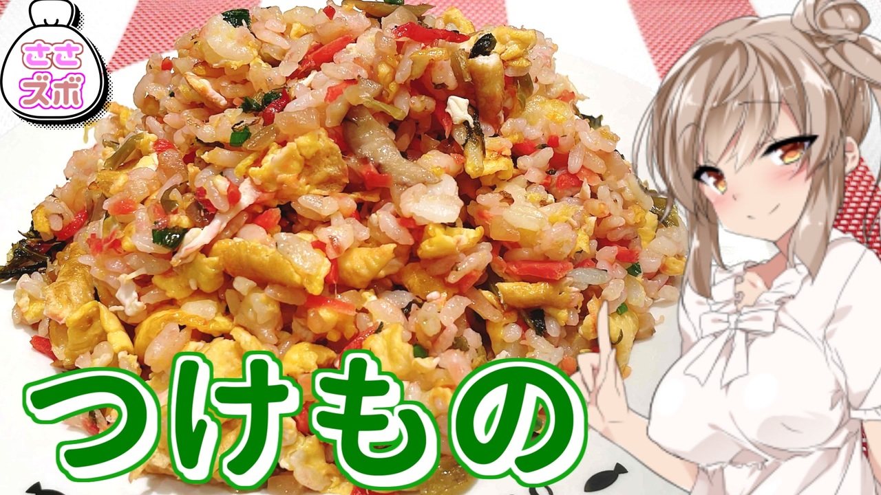 炒飯が食べたかったけど、基本の材料がなくてたまたま目についた漬物で作ってみたよ!<br>意外と美味しいからぜひ作ってみてね!<br><br> 【分量】<br><br>・ご飯 お茶碗1杯くらい<br>・たまご 1個<br>・高菜 好きなだけ<br>・いぶりがっこ 好きなだけ<br>・紅しょうが 好きなだけ<br>・ごま油 大さじ1<br>・創味シャンタン 小さじ1<br>・しょう油 少々<br><br><br>【☆お借りした素敵な素材☆(順不同)】<br><br>【立ち絵】<br>タカハシ・ささら:MtU 様<br>おすわりささら:みりあ 様<br><br>【いいねボタン】<br>みりあ 様<br><br>【素材】<br>ニコニ・コモンズ 様<br>フリー素材「イラストAC」「写真AC」 様<br>フリーBGM:DOVA-SYNDROME 様<br><br><br>最後にこの動画を見てくださった皆様に心からの感謝と、<br>これからも良きご縁がありますように!(*´ω`*)<br><br><br>前作品:<span style="font-size: 14px;">ささらのチーズキーマ【<a href="https://www.nicovideo.jp/watch/sm41149062" class="watch">sm41149062</a> 】</span><br>次回作:ウナきりの手羽先【<a href="https://www.nicovideo.jp/watch/sm41287462" class="watch">sm41287462</a> 】<br><br>ささらのズボラごはんシリーズ<br><a href="https://www.nicovideo.jp/mylist/72669948" target="_blank" rel="noopener nofollow">https://www.nicovideo.jp/mylist/72669948</a><br><br>Twitter:<a href="https://twitter.com/moegimon" target="_blank" rel="noopener nofollow">https://twitter.com/moegimon</a> <br><br>you tube:<a href="https://www.youtube.com/channel/UCP2N3uBfzKEoqCGviIvs0Ew" target="_blank" rel="noopener nofollow">https://www.youtube.com/channel/UCP2N3uBfzKEoqCGviIvs0Ew</a> <br><br>ご支援:<a href="https://www.amazon.co.jp/hz/wishlist/ls/ZBWL10H8ML75?ref_=wl_share" target="_blank" rel="noopener nofollow">https://www.amazon.co.jp/hz/wishlist/ls/ZBWL10H8ML75?ref_=wl_share</a><br><br><br><span style="color: #ff0000;">実妹の縁と合同アカウント(DW-Double Witch-)<br>こちらも宜しくおねがいします!</span><br><br>Twitter:<a href="https://twitter.com/witchdouble2" target="_blank" rel="noopener nofollow">https://twitter.com/witchdouble2</a><br><br>ニコ動:<a href="https://www.nicovideo.jp/user/89325934" target="_blank" rel="noopener nofollow">https://www.nicovideo.jp/user/89325934</a><br><br>you tube:<a href="https://www.youtube.com/channel/UC12q0n98NSyGykCbsP2G8ig" target="_blank" rel="noopener nofollow">https://www.youtube.com/channel/UC12q0n98NSyGykCbsP2G8ig</a><br><br><br><a target="_blank" href="https://qa.nicovideo.jp/faq/show/19424?site_domain=default" style="font-size: 13px;color: #657586; text-decoration: underline; line-height: 1.4">この動画は投稿者によって修正されました</a>