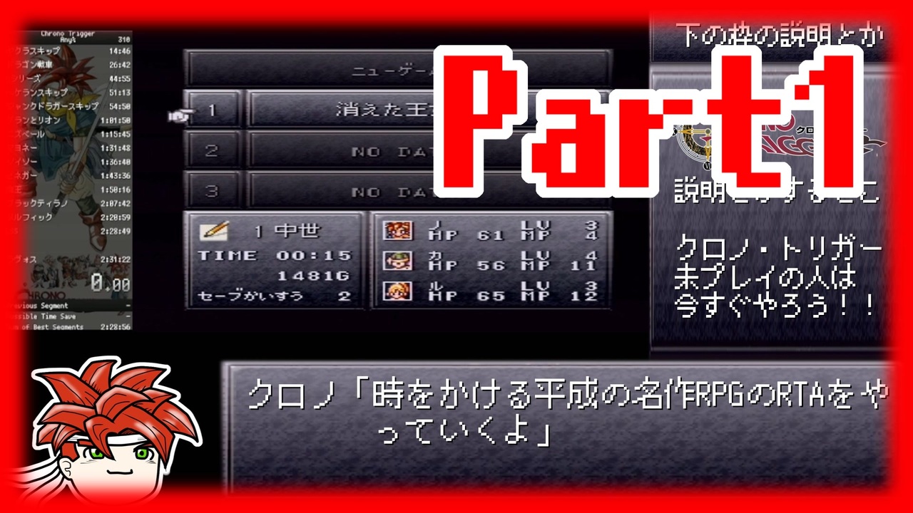 動画を投稿すると言ってから1年以上たったので初投稿です。<br>日本1位、世界3位の記録となっています。SRC → <a href="https://www.speedrun.com/ct#Any" target="_blank" rel="noopener nofollow">https://www.speedrun.com/ct#Any</a><br>参考にしたチャート → <a href="http://chrono.wikidot.com/ct-jp" target="_blank" rel="noopener nofollow">http://chrono.wikidot.com/ct-jp</a><br>※英語です<br><br>2022/10/14 声を変更しました。<br><br>2022/10/15 1万再生ありがとうございます!!パート2も引き続き製作中です!もう少々お待ちください!また、たくさんの方の広告感謝です!!<br>潤兵 さん DF4B2 さん baka さん 十一 さん 桜嵐@キョウスケ さん もえか さん ユッキー さん Ys さん 霧祢 さん Y.K さん kon さん ゆう さん 揚げ玉たこやき さん be さん 明田蒼憲 さん kopokichi さん せいどん さん キョージュ さん ジャンボはまだ さん 太陽さん さん genza さん ツカサ さん ゲスト さん bule さん so-da さん めか さん 猫村 さん ぷら仏 さん ヴェスパー さん ヴァンダル さん sorac さん fortune さん GLIDE さん だくまそ さん linda さん ライダー さん BOSU さん 時の君 さん アヒル改 さん atora さん 華乃音 さん ダイゴローRZ さん LL さん TMO さん雪花石を率いる者 さん にやとー さん 夢見兎 さん 矢老 さん キキ さん おりり さん GGG さん ひょん さん バン さん アモ酢 さん yao-lung さん pongiku さん ペシュリアン さん torikawa さん koban さん 橘ギャレン さん □ さん 朝倉 さん <a href="https://www.nicovideo.jp/watch/sm13869948" class="watch">sm13869948</a> さん Noron さん Renne さん hirohiro2929 さん 内藤 さん 夜明けのヴァン さん マカヒキ さん clo8 さん 凍雨 さん may さん<br>広告ありがとうございます!!!!!!!!!<br><br>2022/10/20 Part2上げました!また追加で広告してくれた方ありがとうございます!<br>唯桜 さん カボチャ さん チェルシー さん りる さん Benzene さん SUDA さん AKR さん ミズハ さん chris さん ahuh さん たぬき さん kamina さん 天纏 さん 松岡修造学園 さん moto_22s さん へしこ さん<br>広告ありがとうございます!!!!!<br><br>part2 → <a href="https://www.nicovideo.jp/watch/sm41258070" class="watch">sm41258070</a> マイリス → <a href="https://www.nicovideo.jp/mylist/73882625" target="_blank" rel="noopener">mylist/73882625</a><br><br><br><a target="_blank" href="https://qa.nicovideo.jp/faq/show/19424?site_domain=default" style="font-size: 13px;color: #657586; text-decoration: underline; line-height: 1.4">この動画は投稿者によって修正されました</a>