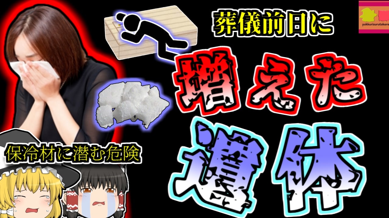 #ゆっくりするところ #葬儀社 #ドライアイス<br>今回紹介するのは、以前リクエストがありました「葬祭業」に関する事例です。<br>2012年9月。東京都某所の民家では、亡くなった一人の男性が自宅に安置されていました。<br>彼には娘の「Aさん」がおり、葬儀が始まるまでの間、Aさんは父の亡骸と同じ部屋で過ごし、この日の夜も母と二人で、父の横で一緒に眠りました。<br>しかし、Aさんは父が亡くなったことを悲しみ、何度も棺桶の中に顔を入れ、父に顔に頬ずりをしていました。<br><br>そうしているうちに朝を迎え、母親が目を覚ますと、棺桶の上には、意識を失い冷たくなっているAさんの姿が・・・<br><br>すぐに救急車が呼ばれましたが、彼女はすでに亡くなってしまっていました。<br>父を悼む娘は、なぜ棺桶の上で遺体となってしまっていたのでしょうか?<br><br>その原因は、遺体を保冷するために使用されていた、大量のドライアイスから放たれていた、「二酸化炭素」にありました。<br><br>今回の動画では、ドライアイスに潜む危険性なども併せて紹介しているので、ぜひ最後までご覧ください。<br><br><a href="#" class="seekTime" data-seekTime="00:00" onclick="seekNicoPlayer('#00:00'); return false;">#00:00</a> 冒頭挨拶<br><a href="#" class="seekTime" data-seekTime="00:41" onclick="seekNicoPlayer('#00:41'); return false;">#00:41</a> 視聴上の注意<br><a href="#" class="seekTime" data-seekTime="1:22" onclick="seekNicoPlayer('#1:22'); return false;">#1:22</a> 現地の説明<br><a href="#" class="seekTime" data-seekTime="2:28" onclick="seekNicoPlayer('#2:28'); return false;">#2:28</a> 父を亡くした女性「Aさん」<br><a href="#" class="seekTime" data-seekTime="3:01" onclick="seekNicoPlayer('#3:01'); return false;">#3:01</a> 葬儀までの流れ<br><a href="#" class="seekTime" data-seekTime="3:55" onclick="seekNicoPlayer('#3:55'); return false;">#3:55</a> 「自宅安置」<br><a href="#" class="seekTime" data-seekTime="6:18" onclick="seekNicoPlayer('#6:18'); return false;">#6:18</a> 父を悼むAさん<br><a href="#" class="seekTime" data-seekTime="7:49" onclick="seekNicoPlayer('#7:49'); return false;">#7:49</a> 原因は「二酸化炭素」<br><a href="#" class="seekTime" data-seekTime="9:36" onclick="seekNicoPlayer('#9:36'); return false;">#9:36</a> ドライアイスに潜む危険<br><a href="#" class="seekTime" data-seekTime="11:24" onclick="seekNicoPlayer('#11:24'); return false;">#11:24</a> ゼロリスクでの運用は不可能<br><br><br>引用・出展・参考文献<br>葬儀業の概況<br><a href="https://ishort.ink/PBzy" target="_blank" rel="noopener nofollow">https://ishort.ink/PBzy</a><br>いい葬儀<br><a href="https://ishort.ink/Jko4" target="_blank" rel="noopener nofollow">https://ishort.ink/Jko4</a><br>横浜市 ppmとは<br><a href="https://ishort.ink/R2xB" target="_blank" rel="noopener nofollow">https://ishort.ink/R2xB</a><br>二酸化炭素(CO2)の人体における影響<br><a href="https://ishort.ink/aRxH" target="_blank" rel="noopener nofollow">https://ishort.ink/aRxH</a><br>その他視聴者提供資料など<br><br><br><br>※この動画は過去の事件を知り、現在でも同じことが発生する危険性を再認識、関与しないように促すための動画であり、視聴者を扇動、動揺を誘うためのコンテンツではありません。<br><br><br>ご要望にお応えして、メンバーシップの開設を行いました。<br>下記URLからも登録可能ですので、ご興味がある方は是非ご参加ください。<br><a href="https://www.youtube.com/channel/UCcT5a1J7XJW7CLYI2RKl4pw/join" target="_blank" rel="noopener nofollow">https://www.youtube.com/channel/UCcT5a1J7XJW7CLYI2RKl4pw/join</a><br />※この動画は過去の事件を知り、現在でも同じことが発生する危険性を再認識、関与しないように促すための動画であり、視聴者を扇動、動揺を誘うためのコンテンツではありません。<br><br>ご要望にお応えして、メンバーシップの開設を行いました。<br>下記URLからも登録可能ですので、ご興味がある方は是非ご参加ください。<br><a href="https://www.youtube.com/channel/UCcT5a1J7XJW7CLYI2RKl4pw/join" target="_blank" rel="noopener nofollow">https://www.youtube.com/channel/UCcT5a1J7XJW7CLYI2RKl4pw/join</a><br><br><br>Twitter<br>→<a href="https://twitter.com/yukkurisurutoko" target="_blank" rel="noopener nofollow">https://twitter.com/yukkurisurutoko</a><br><br>取り急ぎ、簡易的にですがマイリストを作りました。<br>【ゆっくり解説】事故・事件関係紹介リスト <br><a href="https://www.nicovideo.jp/mylist/71034319" target="_blank" rel="noopener nofollow">https://www.nicovideo.jp/mylist/71034319</a><br>【ゆっくり解説】放射線系事故<br><a href="https://www.nicovideo.jp/mylist/71034368" target="_blank" rel="noopener nofollow">https://www.nicovideo.jp/mylist/71034368</a><br>【ゆっくり解説】鉄道系事故・事件関連<br><a href="https://www.nicovideo.jp/mylist/71034379" target="_blank" rel="noopener nofollow">https://www.nicovideo.jp/mylist/71034379</a>