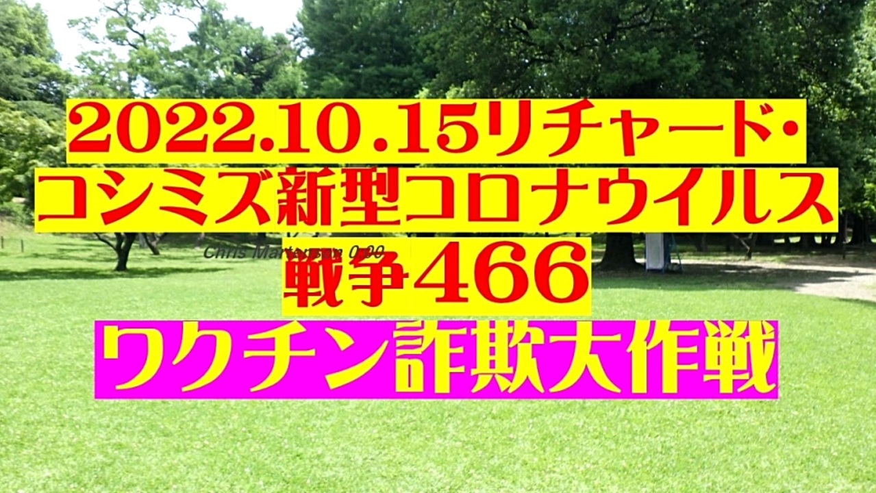 <span style="color: #cc4125;"><strong>「 テーマ:新型コロナウイルス戦争 466 」</strong></span><br><br><span style="color: #ff0000;"><strong>「『 ワクチン詐欺 』大作戦 」</strong></span><br><br>◐「統一教会・岸田文雄一味」は、「ビル・ゲイツらハザール大富豪クラブのワクチン大虐殺」を実現すべく、<br> なりふり構わず凶行に走っている。<br><br>◐ワクチン死者を劇的に増やさないと、「人口90%削減」は達成不能。<br><br>◐「2価ワクチン+インフル同時接種」で、被害激増を企図。<br><br>◐「毒ワクチン+毒点滴薬・毒内服薬」で、軽症者を死に追いやる。<br><br>◐「特効薬アビガン・イベルメクチンを抹殺」して、毒薬以外の選択肢を消す。<br> スパイクタンパクの体内生成を密かに促進させる。<br><br>◐「被害激増で死屍累々」となった時、初めて日本人は目覚める。<br><br>◐「毒ワクチン接種者を増やそう」と必死の工作。<br><br>◐P社:ワクチンの感染予防効果はテストしていない。「殺人が目的」のワクチンに予防効果は不要。<br><br><strong>*「フォロー」・「ニコニ広告」・「いいね!」・「情報拡散」等、ご協力下さい。 リチャード・コシミズ</strong><br><br><span style="color: #38761d;">◆</span><span style="color: #38761d;"><strong>リチャード・コシミズ 公式 ブログ</strong></span><br> <a href="https://richard-koshimizu.jimdosite.com/" target="_blank" rel="noopener nofollow">https://richard-koshimizu.jimdosite.com/</a><br><br><span style="color: #38761d;">◆</span><span style="color: #38761d;"><strong>リチャード・コシミズ 公式 ホームページ<br> </strong></span><a href="http://richardkoshimizu.boo.jp/" target="_blank" rel="noopener nofollow">http://richardkoshimizu.boo.jp/</a><br><br><span style="color: #38761d;">◆</span><span style="color: #38761d;"><strong>リチャード・コシミズ 講演会 公式 動画ギャラリー</strong></span><br> <a href="http://www.t-sskk.com/richardkoshimizu/video-gallery/index.html" target="_blank" rel="noopener nofollow">http://www.t-sskk.com/richardkoshimizu/video-gallery/index.html</a><br>