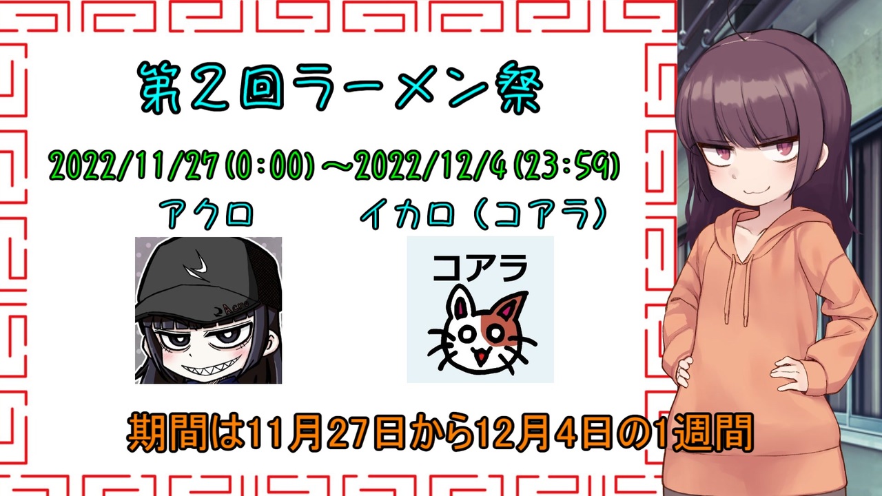 苦情、質問などはこちらのDMに→<a href="https://twitter.com/acro_nico" target="_blank" rel="noopener nofollow">https://twitter.com/acro_nico</a><br><strong><u>まぁ正直なとこ聞かずに黙ってやってくれた方が黙認しやすいです<br>法に触れたり、他人に迷惑さえかけなきゃ黙認します</u></strong><br><br><span style="color: #ff0000; font-size: 16px;">期間</span> 2022/11/27(0:00)~2022/12/4(23:59)<br><br><span style="color: #ff0000; font-size: 16px;">共通レギュ</span><br>・「<span style="color: #0000ff;">2022年ラーメン祭</span>」、「<span style="color: #9900ff;">第二回ラーメン祭自作部門</span>」or「<span style="color: #9900ff;">第二回ラーメン祭外食部門</span>」のタグロック<br>・動画タイトルに「<span style="color: #ff0000;">第二回ラーメン祭</span>」の記載<br>・ソフトウェアトークなどの合成音声を使用した動画であること(ゆっくりも可)<br>・本動画の親作品登録<br><br><span style="color: #ff0000; font-size: 16px;">外食部門</span><br>・ラーメン屋で飯を食うグルメ動画を作る。食レポシーンがメインなら車載動画なども可<br>・【ラーメン屋】の定義は各投稿者に一任するけど、暴走しないようにはしてね<br>・ラーメン屋にあるメニューなら何食う動画でもいいよ<br>・お店のルールは守ろうね<br>・テイクアウトした商品を食べる動画でも可、その場合はお店の紹介もお願いします<br><br><span style="color: #ff0000;">自作部門</span><br>・ラーメンを作るキッチン動画を作る。<br>・ラーメンの定義は各投稿者に一任するけど、暴走しないようにはしてね(最低限、麺類にはして)<br>・インスタント食品使ってもいいけどカップ麺はNG(乾麺、フライ麺、生めんなどを鍋で茹でたりする食品はOK)<br>・自作のトッピングを2種類使用し調理シーンも入れる(自作の定義も一任します)<br>